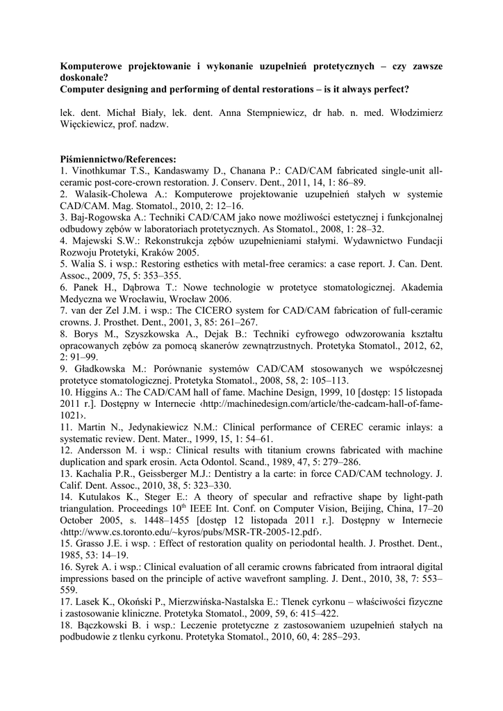 Komputerowe projektowanie i wykonanie uzupełnień protetycznych – czy zawsze doskonałe? Computer designing and performing of dental restorations – is it always perfect? lek. dent. Michał Biały, lek. dent. Anna Stempniewicz, dr hab. n. med. Włodzimierz Więckiewicz, prof. nadzw. Piśmiennictwo/References: 1. Vinothkumar T.S., Kandaswamy D., Chanana P.: CAD/CAM fabricated single-unit allceramic post-core-crown restoration. J. Conserv. Dent., 2011, 14, 1: 86–89. 2. Walasik-Cholewa A.: Komputerowe projektowanie uzupełnień stałych w systemie CAD/CAM. Mag. Stomatol., 2010, 2: 12–16. 3. Baj-Rogowska A.: Techniki CAD/CAM jako nowe możliwości estetycznej i funkcjonalnej odbudowy zębów w laboratoriach protetycznych. As Stomatol., 2008, 1: 28–32. 4. Majewski S.W.: Rekonstrukcja zębów uzupełnieniami stałymi. Wydawnictwo Fundacji Rozwoju Protetyki, Kraków 2005. 5. Walia S. i wsp.: Restoring esthetics with metal-free ceramics: a case report. J. Can. Dent. Assoc., 2009, 75, 5: 353–355. 6. Panek H., Dąbrowa T.: Nowe technologie w protetyce stomatologicznej. Akademia Medyczna we Wrocławiu, Wrocław 2006. 7. van der Zel J.M. i wsp.: The CICERO system for CAD/CAM fabrication of full-ceramic crowns. J. Prosthet. Dent., 2001, 3, 85: 261–267. 8. Borys M., Szyszkowska A., Dejak B.: Techniki cyfrowego odwzorowania kształtu opracowanych zębów za pomocą skanerów zewnątrzustnych. Protetyka Stomatol., 2012, 62, 2: 91–99. 9. Gładkowska M.: Porównanie systemów CAD/CAM stosowanych we współczesnej protetyce stomatologicznej. Protetyka Stomatol., 2008, 58, 2: 105–113. 10. Higgins A.: The CAD/CAM hall of fame. Machine Design, 1999, 10 [dostęp: 15 listopada 2011 r.]. Dostępny w Internecie ‹http://machinedesign.com/article/the-cadcam-hall-of-fame1021›. 11. Martin N., Jedynakiewicz N.M.: Clinical performance of CEREC ceramic inlays: a systematic review. Dent. Mater., 1999, 15, 1: 54–61. 12. Andersson M. i wsp.: Clinical results with titanium crowns fabricated with machine duplication and spark erosin. Acta Odontol. Scand., 1989, 47, 5: 279–286. 13. Kachalia P.R., Geissberger M.J.: Dentistry a la carte: in force CAD/CAM technology. J. Calif. Dent. Assoc., 2010, 38, 5: 323–330. 14. Kutulakos K., Steger E.: A theory of specular and refractive shape by light-path triangulation. Proceedings 10th IEEE Int. Conf. on Computer Vision, Beijing, China, 17–20 October 2005, s. 1448–1455 [dostęp 12 listopada 2011 r.]. Dostępny w Internecie ‹http://www.cs.toronto.edu/~kyros/pubs/MSR-TR-2005-12.pdf›. 15. Grasso J.E. i wsp. : Effect of restoration quality on periodontal health. J. Prosthet. Dent., 1985, 53: 14–19. 16. Syrek A. i wsp.: Clinical evaluation of all ceramic crowns fabricated from intraoral digital impressions based on the principle of active wavefront sampling. J. Dent., 2010, 38, 7: 553– 559. 17. Lasek K., Okoński P., Mierzwińska-Nastalska E.: Tlenek cyrkonu – właściwości fizyczne i zastosowanie kliniczne. Protetyka Stomatol., 2009, 59, 6: 415–422. 18. Bączkowski B. i wsp.: Leczenie protetyczne z zastosowaniem uzupełnień stałych na podbudowie z tlenku cyrkonu. Protetyka Stomatol., 2010, 60, 4: 285–293. 19. Panek H., Dąbrowa T.: Zastosowanie systemów komputerowych w wybranych procedurach klinicznych i laboratoryjnych wykonania protez stałych. Dent. Med. Probl., 2002, 39, 2: 303–307. 20. Spiechowicz E.: Protetyka stomatologiczna. Wydawnictwo Naukowe PZWL, Warszawa 2008. 21. Kleinrok P. i wsp.: Pełnoceramiczne uzupełnienia protetyczne – różne drogi do osiągnięcia optymalnej estetyki. Mag. Stomatol., 2011, 11: 32–39. 22. Sykut J., Wojdyło M.: Tlenek cyrkonu – właściwości fizyczne i zastosowanie w wykonawstwie podbudów uzupełnień stałych. Magazyn Stomatol., 2011, 12: 121–124. 23. Umeri A.: Study of Zirconia's ageing for applications in dentistry. Università degli studi di Trieste, Trieste 2010 [dostęp 15 listopada 2011 r.]. Dostępny w Internecie ‹http://www.openstarts.units.it/dspace/bitstream/10077/3446/1/umeri_phd.pdf›. 24. Kanazawa M. i wsp.: Trial of a CAD/CAM system for fabricating complete dentures. Dent. Mater. J., 2011, 30, 1: 93–96. 25. Rosak P., Rój R., Sobczyk-Rosak B.: Uzupełnienia stałe na bazie tlenku cyrkonu. Twój Przegląd Stomatol., 2010, 1/2: 27–31. 26. Bagińska H.: Nowoczesne systemy CAD/CAM – protetyka w gabinecie. Cosmetic Dent., 2008, 2: 10–11. 27. Kołodziejczyk A.: System CEREC. Narzędzie do wykonywania odbudowy pełnoceramicznej. Twój Przegląd Stomatol., 2010, 3: 94–96. 28. Kern M.: Technologia CAD/CAM poszerza zakres zastosowań stomatologii odtwórczej. Cosmetic Dent., 2010, 1: 14–64. 29. Stupka M., Stupka M.: Ocena powierzchni przekrojów zębów wraz z osadzonymi wkładami wykonanymi metodą pośrednią i CAD/CAM. Implantoprotet., 2007, 8, 4: 28–33. 30. Birkhoff H.M., Barr S.I.: Der occlusale Offset und seine Auswirkungen, [dostęp 6 listopada 2011 r.]. Dostępny w Internecie ‹www.planetcerec.com›. 31. Ciaputa A., Ciaputa T.: Podstawy wykonawstwa prac protetycznych. Prace stałe, protezy szkieletowe, prace kombinowane. Elamed, Katowice 2009. 32. Bachhav V.C., Aras M.A.: The effect of ceramic thickness and number of firings on the color of a zirconium oxide based all ceramic system fabricated using CAD/CAM technology. J. Adv. Prosthodont. 2011, 3, 2: 57–62. Epub 2011 Jun 30 [dostęp 18 listopada 2011 r.]. Dostępny w Internecie ‹http://www.ncbi.nlm.nih.gov/pmc/articles/PMC3141119/? tool=pubmed›.