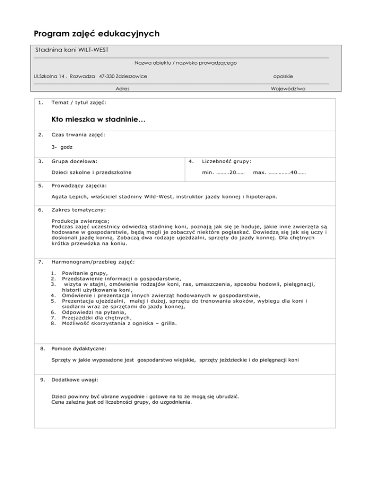 Program zajęć edukacyjnych Stadnina koni WILT-WEST ______________________________________________________________________________________________________________________ Nazwa obiektu / nazwisko prowadzącego Ul.Szkolna 14 , Rozwadza 47-330 Zdzieszowice opolskie ______________________________________________________________________________________________________________________ Adres Województwo 1. Temat / tytuł zajęć: Kto mieszka w stadninie… 2. Czas trwania zajęć: 3- godz 3. Grupa docelowa: Dzieci szkolne i przedszkolne 5. 4. Liczebność grupy: min. ………20…… max. ……………40…… Prowadzący zajęcia: Agata Lepich, właściciel stadniny Wild-West, instruktor jazdy konnej i hipoterapii. 6. Zakres tematyczny: Produkcja zwierzęca; Podczas zajęć uczestnicy odwiedzą stadninę koni, poznają jak się je hoduje, jakie inne zwierzęta są hodowane w gospodarstwie, będą mogli je zobaczyć niektóre pogłaskać. Dowiedzą się jak się uczy i doskonali jazdę konną. Zobaczą dwa rodzaje ujeżdżalni, sprzęty do jazdy konnej. Dla chętnych krótka przewózka na koniu. 7. Harmonogram/przebieg zajęć: 1. 2. 3. 4. 5. 6. 7. 8. 8. Powitanie grupy, Przedstawienie informacji o gospodarstwie, wizyta w stajni, omówienie rodzajów koni, ras, umaszczenia, sposobu hodowli, pielęgnacji, historii użytkowania koni, Omówienie i prezentacja innych zwierząt hodowanych w gospodarstwie, Prezentacja ujeżdżalni, małej i dużej, sprzętu do trenowania skoków, wybiegu dla koni i siodlarni wraz ze sprzętami do jazdy konnej, Odpowiedzi na pytania, Przejażdżki dla chętnych, Możliwość skorzystania z ogniska – grilla. Pomoce dydaktyczne: Sprzęty w jakie wyposażone jest gospodarstwo wiejskie, sprzęty jeździeckie i do pielęgnacji koni 9. Dodatkowe uwagi: Dzieci powinny być ubrane wygodnie i gotowe na to że mogą się ubrudzić. Cena zależna jest od liczebności grupy, do uzgodnienia.
