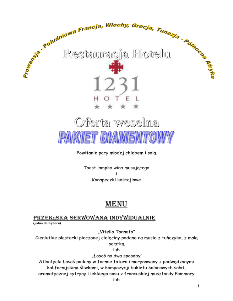 Restauracja Hotelu Oferta weselna Powitanie pary młodej chlebem i solą Toast lampka wina musującego i Kanapeczki koktajlowe MENU Przekąska serwowana indywidualnie (jedna do wyboru) „Vitello Tonnato” Cieniutkie plasterki pieczonej cielęciny podane na musie z tuńczyka, z małą sałatką lub „Łosoś na dwa sposoby” Atlantycki Łosoś podany w formie tatara i marynowany z podwędzanymi kalifornijskimi śliwkami, w kompozycji bukietu kolorowych sałat, aromatycznej cytryny i lekkiego sosu z francuskiej musztardy Pommery lub 1 Sałatka „La Caprese” Pomidory przekładane płatkami Mozzarelli, doprawione aromatyczną emulsją bazyliową, podane w kompozycji z bukietem sałat i włoską szynka Parmeńską Zupa serwowana indywidualnie (jedna do wyboru) Chłodnik z naturalnego jogurtu i listków botwinki, doprawiony ogórkiem, aromatem ogrodowego koperku i szczypiorku, podany z jajkiem lub Kremowa zupa grzybowa doprawiona śmietanką kokosową,i płatkami kabanosa lub Aromatyczny rosół z wiejskiej kury, z makaronem, kawałeczkami kurczaka i kolorowymi warzywami. lub Staropolski żurek doprawiony aromatem wędzonki, suszonych grzybów i świeżo tartego chrzanu Dania główne - mięsne i rybne podane na stoły (cztery do wyboru) “Saltinbocca” Włoskie kotleciki ze schabu smażone z Salami, podane w sosie z papryki ***** Łosoś marynowany z pikantna papryczką pepperoni, pieczony na grillu, podany w maślano-cytrynowej emulsji ***** Eskalopki z piersi kurczaka smażone w jajku i tartym Parmezanie ***** Opiekane roladki z polędwiczek wieprzowych nadziewane szpinakiem, papryka i Fetą, podane na aromatycznym sosie pomidorowym ***** Fileciki Okonia Wiktoriańskiego smażone na maśle, w panierce z włoskich orzechów ***** Soczysta pieczeń z karkówki marynowanej z czosnkiem, jałowcem i ogrodowym rozmarynem, podana z własnym sosem ***** Kotleciki schabowe doprawione smażoną cebulką z pieczarkami Dodatki podane na stoły (Trzy do wyboru) 2 Gotowane ziemniaki doprawione świeżym masłem i koperkiem ***** Mus ziemniaczany doprawiony oliwa truflową i zapieczony pod płaszczykiem Parmezanu ***** Frytki i ziemniaki opiekane ***** Asortyment gotowanych warzyw, doprawione maślano – cytrynową emulsją ***** Staropolska kapusta zasmażana z pomidorami ****** Gotowane różyczki kalafiora i fasolka szparagowa doprawione złocistą bułeczką Deser serwowany indywidualnie (jeden do wyboru) Puchar lodów “Amorek” Lody czekoladowe, waniliowe i truskawkowe podane ze świeżymi owocami, bitą śmietaną, wiórkami czekolady. Doprawione sosem z mlecznej czekolady lub Sałatka ze świeżych owoców z listkami afrodyzjakalnej mięty pieprzowej i sosem truskawkowym, podana z gałką sorbetu malinowego lub Karmelizowany Krem Brulee doprawiony kroplą Martella w trzech odsłonach: z leśnymi jagodami, ogrodowymi truskawkami i Toruńskim piernikiem Kawa / herbata Przekąski i sałatki podane na stoły „Gravad lax” z łososia marynowanego w czarnym pieprzu i Soli Morskiej, podany z cząstkami cytryny i kremowym chrzanem ***** Staropolska sałatka z pieczonej szynki, papryki, kukurydzy i żółtego sera doprawiona aromatem świeżego ogórka i sosem majonezowym ***** Pieczone mięsa: karkówka, schab nadziewany śliwkami, indyk, pasztety, faszerowane polędwiczki wieprzowe ***** Sałatka z grillowanych polędwiczek kurczaka i pieczonych warzyw doprawiona karczochami, kremem balsamicznym i kawałkami koziego sera 3 ***** Filety śledziowe Matyjas przyrządzone w trzech smakach ***** Szparagi zawijane w plaster wędzonej szynki ***** Sałatka z pomidorów i aromatycznego ogórka doprawiona zielonym selerem, świeżo siekaną szalotką i Modenską oliwą ***** Chrupiące bułeczki, masło Desery i owoce ustawione na bufecie Piramida świeżych owoców Szarlotka pieczona w otoczce aromatu cynamonu Sałatka ze świeżych owoców Ciastko “Ambasador” na czekoladowym cieście “Cherry” ciasto z marynowanymi wiśniami Dania gorące serwowane indywidualnie (godzina do ustalenia) Staropolska zupa gulaszowa doprawiona owocem dzikiego jałowca i sokiem z kwaszonych ogórków Danie gorące podane na stoły Pieczone udko kurczaka Tort weselny do pokrojenia przez Młodą Parę zarówno godzina podania jak i wielkość, smak, forma sa do indywidualnego ustalenia, a jego koszt będzie dodany do wartości wesela w kwocie. Przedział cenowy tortów weselnych to od 150 zł do 1100 zł kawa / herbata Danie gorące serwowane indywidualnie po północy (godzina do ustalenia) Aromatyczny barszcz czerwony podany z ciepłym pasztecikiem nadziewanym kapusta i grzybami 4 W skład pakietu jest wliczona również: noc poślubna Młodej Pary, lub w dowolnie wybranym terminie (oczywiście po ówczesnej rezerwacji na ogólnie obowiązujących zasadach wolnych pokoi) śniadanie hotelowe z kieliszkiem białego wina następnego dnia romantyczna kolacja „We Dwoje” z okazji rocznicy ślubu z butelką wina, specjalne trzy daniowe menu z wyborem dania głównego pomiędzy rybą, mięsem i daniem wegetariańskim (do wykorzystania w ciągu roku od dnia przyjęcia weselnego, po ówczesnej rezerwacji stołu na ogólnych zasadach rezerwacji) możliwość dostarczenia na przyjęcie własnych alkoholi, napoi bez opłaty „korkowej” w przypadku dostarczenia własnego tortu, nie będzie pobierana opłata „talerzykowa” możliwość korzystania z restauracyjnego nagłośnienia lub zorganizowania własnego bez dodatkowych opłat możliwość zorganizowania we własnym zakresie zespołu muzycznego bez dodatkowych opłat dekoracja kwiatowa na stolach oferta jest ważna dla minimum 35 osób Cena sprzedażna pakietu diamentowego wynosi brutto 270 zł za osobę, plus wartość wybranego przez organizatora tortu weselnego za dzieci, liczymy 50 % tej ceny za pracowników obsługi z Państwa strony (zespól muzyczny, Dj, kamerzysta, itp) również liczymy 50 % tej ceny. Oddzielny stół Na wszelkiego rodzaju przyjęcia „