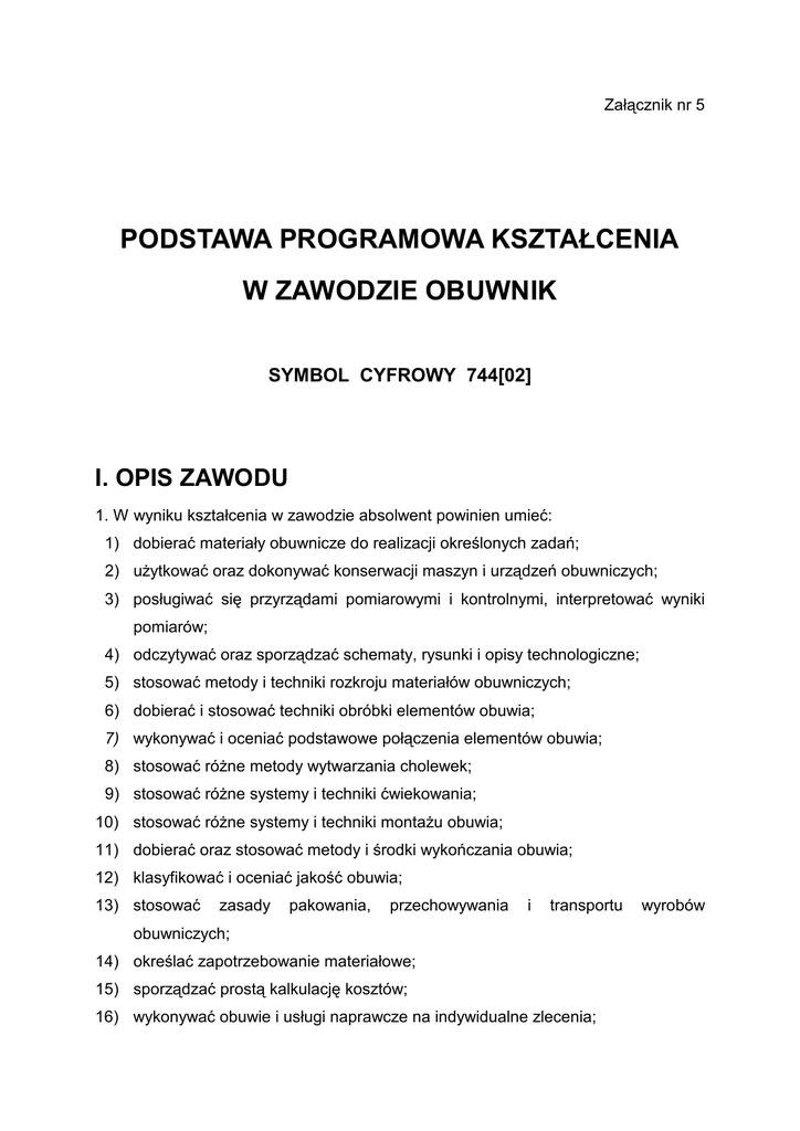 Załącznik nr 5 PODSTAWA PROGRAMOWA KSZTAŁCENIA W ZAWODZIE OBUWNIK SYMBOL CYFROWY 744[02] I. OPIS ZAWODU 1. W wyniku kształcenia w zawodzie absolwent powinien umieć: 1) dobierać materiały obuwnicze do realizacji określonych zadań; 2) uŜytkować oraz dokonywać konserwacji maszyn i urządzeń obuwniczych; 3) posługiwać się przyrządami pomiarowymi i kontrolnymi, interpretować wyniki pomiarów; 4) odczytywać oraz sporządzać schematy, rysunki i opisy technologiczne; 5) stosować metody i techniki rozkroju materiałów obuwniczych; 6) dobierać i stosować techniki obróbki elementów obuwia; 7) wykonywać i oceniać podstawowe połączenia elementów obuwia; 8) stosować róŜne metody wytwarzania cholewek; 9) stosować róŜne systemy i techniki ćwiekowania; 10) stosować róŜne systemy i techniki montaŜu obuwia; 11) dobierać oraz stosować metody i środki wykończania obuwia; 12) klasyfikować i oceniać jakość obuwia; 13) stosować zasady pakowania, przechowywania i transportu obuwniczych; 14) określać zapotrzebowanie materiałowe; 15) sporządzać prostą kalkulację kosztów; 16) wykonywać obuwie i usługi naprawcze na indywidualne zlecenia; wyrobów 17) organizować stanowiska pracy zgodnie z wymaganiami ergonomii; 18) przestrzegać przepisów i zasad bezpieczeństwa i higieny pracy, przepisów ochrony przeciwpoŜarowej oraz ochrony środowiska; 19) komunikować się z uczestnikami procesu pracy; 20) stosować przepisy Kodeksu pracy dotyczące praw i obowiązków pracownika i pracodawcy oraz warunków pracy; 21) stosować przepisy prawa dotyczące wykonywanych zadań zawodowych; 22) korzystać z róŜnych źródeł informacji w zakresie niezbędnym do wykonywania zadań zawodowych; 23) udzielać pierwszej pomocy poszkodowanym w wypadkach przy pracy; 24) prowadzić działalność gospodarczą. Kształtowanie postaw przedsiębiorczych oraz przygotowanie do wejścia na rynek pracy powinno przebiegać zarówno w trakcie procesu kształcenia zawodowego, jak i podczas realizacji zajęć edukacyjnych „Podstawy przedsiębiorczości”. 2. Absolwent szkoły kształcącej w zawodzie obuwnik powinien być przygotowany do wykonywania następujących zadań zawodowych: 1) wytwarzania obuwia metodami przemysłowymi i warsztatowymi; 2) dokonywania konserwacji maszyn i urządzeń obuwniczych; 3) prowadzenia dokumentacji produkcyjnej, ewidencyjnej i rozliczeniowej; 4) wykonywania napraw i renowacji obuwia; 5) prowadzenia działalności wytwórczej i usługowej. II. BLOKI PROGRAMOWE Zakres umiejętności i treści kształcenia, wynikający z opisu kwalifikacji absolwenta, zawierają następujące bloki programowe: 1) konstrukcja wyrobu; 2) technologia wytwarzania obuwia; 3) podstawy działalności zawodowej. 2 BLOK: KONSTRUKCJA WYROBU 1. Cele kształcenia Uczeń (słuchacz) w wyniku kształcenia powinien umieć: 1) klasyfikować obuwie według rozwiązań konstrukcyjnych i materiałowych; 2) określać zasady konstruowania obuwia zgodnie z anatomią i fizjologią stopy; 3) dobierać kopyta do róŜnych typów i systemów montaŜu obuwia; 4) stosować obowiązujące miary stóp, przeliczenia numeracji kopyt i obuwia; 5) rozróŜniać części składowe obuwia; 6) określać ogólne zasady projektowania i konstruowania obuwia; 7) określać cechy i współzaleŜność barw w projektowaniu wyrobów obuwniczych; 8) wykonywać szkice elementów, półproduktów i typów obuwia; 9) wykonywać szkice obuwia w róŜnych kompozycjach kolorystycznych; 10) wykonywać szkice przekrojów obuwia montowanego róŜnymi systemami; 11) odczytywać rysunki wykonawcze elementów, półproduktów i wyrobów obuwniczych; 12) rozróŜniać materiały podstawowe i pomocnicze stosowane w obuwnictwie; 13) określać wymagania techniczne i przetwórcze dla skór, tworzyw skóropodobnych oraz materiałów włókienniczych na cholewki; 14) określać wymagania techniczne i przetwórcze dla skór i innych materiałów na spody obuwia; 15) określać parametry techniczne materiałów pomocniczych stosowanych w produkcji obuwia; 16) kwalifikować wady materiałów jako dopuszczalne i niedopuszczalne; 17) dobierać materiały podstawowe i pomocnicze, półprodukty oraz środki wykończeniowe w zaleŜności od konstrukcji, typu, przeznaczenia i techniki wytwarzania obuwia; 18) oceniać jakość materiałów obuwniczych; 19) odczytywać cechy identyfikacyjne elementów, półproduktów i wyrobów obuwniczych. 3 2. Treści kształcenia (działy programowe) Treści kształcenia są ujęte w następujących działach programowych: 1) charakterystyka i klasyfikacja obuwia; 2) wybrane zagadnienia z anatomii i fizjologii kończyny dolnej; 3) pomiary antropometryczne; 4) budowa i podział kopyt; 5) wielkości kopyt i obuwia, przeliczanie miar długości; 6) części składowe obuwia i ich charakterystyka; 7) podstawy projektowania i konstruowania obuwia; 8) szkicowanie i wymiarowanie elementów; 9) projektowanie podstawowych typów i systemów obuwia; 10) kolorystyka w projektowaniu obuwia; 11) rysunki wykonawcze i złoŜeniowe; 12) materiały podstawowe i pomocnicze stosowane w obuwnictwie; 13) skóry miękkie; 14) skóry twarde; 15) tworzywa skóropodobne; 16) materiały włókiennicze; 17) materiały nieskórzane na podpodeszwy, zakładki i podnoski; 18) tworzywa sztuczne i gumy na elementy spodów obuwia; 19) materiały i środki do łączenia elementów wierzchów i spodów obuwia; 20) materiały i elementy zdobnicze; 21) środki wykończeniowe; 22) metody oceny jakości materiałów obuwniczych; 23) zasady doboru materiałów obuwniczych; 24) cechowanie elementów, półproduktów i wyrobów obuwniczych. BLOK: TECHNOLOGIA WYTWARZANIA OBUWIA 1. Cele kształcenia Uczeń (słuchacz) w wyniku kształcenia powinien umieć: 1) klasyfikować maszyny i urządzenia produkcyjne; 2) rozróŜniać części maszyn; 4 3) wyjaśniać zasady działania maszyn i mechanizmów; 4) wyjaśniać działanie pomp, spręŜarek, wentyl