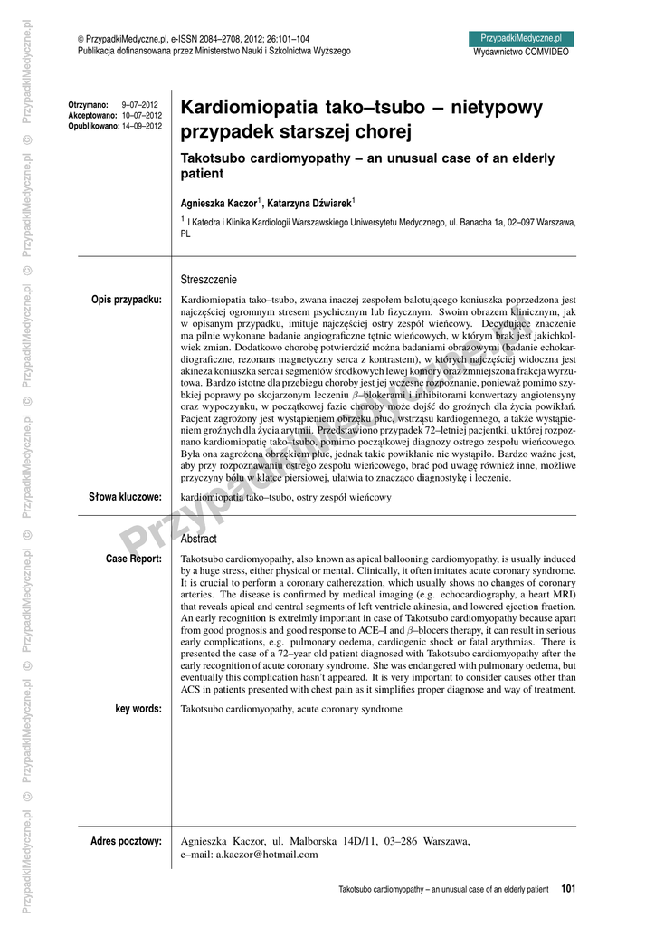 © PrzypadkiMedyczne.pl, e-ISSN 2084–2708, 2012; 26:101–104 Publikacja dofinansowana przez Ministerstwo Nauki i Szkolnictwa Wyższego Otrzymano: 9–07–2012 Akceptowano: 10–07–2012 Opublikowano: 14–09–2012 PrzypadkiMedyczne.pl Wydawnictwo COMVIDEO Kardiomiopatia tako–tsubo – nietypowy przypadek starszej chorej Takotsubo cardiomyopathy – an unusual case of an elderly patient Agnieszka Kaczor1 , Katarzyna Dźwiarek1 1 I Katedra i Klinika Kardiologii Warszawskiego Uniwersytetu Medycznego, ul. Banacha 1a, 02–097 Warszawa, PL Streszczenie Opis przypadku: Kardiomiopatia tako–tsubo, zwana inaczej zespołem balotującego koniuszka poprzedzona jest najczęściej ogromnym stresem psychicznym lub fizycznym. Swoim obrazem klinicznym, jak w opisanym przypadku, imituje najczęściej ostry zespół wieńcowy. Decydujące znaczenie ma pilnie wykonane badanie angiograficzne tętnic wieńcowych, w którym brak jest jakichkolwiek zmian. Dodatkowo chorobę potwierdzić można badaniami obrazowymi (badanie echokardiograficzne, rezonans magnetyczny serca z kontrastem), w których najczęściej widoczna jest akineza koniuszka serca i segmentów środkowych lewej komory oraz zmniejszona frakcja wyrzutowa. Bardzo istotne dla przebiegu choroby jest jej wczesne rozpoznanie, ponieważ pomimo szybkiej poprawy po skojarzonym leczeniu β –blokerami i inhibitorami konwertazy angiotensyny oraz wypoczynku, w początkowej fazie choroby może dojść do groźnych dla życia powikłań. Pacjent zagrożony jest wystąpieniem obrzęku płuc, wstrząsu kardiogennego, a także wystąpieniem groźnych dla życia arytmii. Przedstawiono przypadek 72–letniej pacjentki, u której rozpoznano kardiomiopatię tako–tsubo, pomimo początkowej diagnozy ostrego zespołu wieńcowego. Była ona zagrożona obrzękiem płuc, jednak takie powikłanie nie wystąpiło. Bardzo ważne jest, aby przy rozpoznawaniu ostrego zespołu wieńcowego, brać pod uwagę również inne, możliwe przyczyny bólu w klatce piersiowej, ułatwia to znacząco diagnostykę i leczenie. Słowa kluczowe: kardiomiopatia tako–tsubo, ostry zespół wieńcowy Abstract Case Report: key words: Adres pocztowy: Takotsubo cardiomyopathy, also known as apical ballooning cardiomyopathy, is usually induced by a huge stress, either physical or mental. Clinically, it often imitates acute coronary syndrome. It is crucial to perform a coronary catherezation, which usually shows no changes of coronary arteries. The disease is confirmed by medical imaging (e.g. echocardiography, a heart MRI) that reveals apical and central segments of left ventricle akinesia, and lowered ejection fraction. An early recognition is extrelmly important in case of Takotsubo cardiomyopathy because apart from good prognosis and good response to ACE–I and β –blocers therapy, it can result in serious early complications, e.g. pulmonary oedema, cardiogenic shock or fatal arythmias. There is presented the case of a 72–year old patient diagnosed with Takotsubo cardiomyopathy after the early recognition of acute coronary syndrome. She was endangered with pulmonary oedema, but eventually this complication hasn’t appeared. It is very important to consider causes other than ACS in patients presented with chest pain as it simplifies proper diagnose and way of treatment. Takotsubo cardiomyopathy, acute coronary syndrome Agnieszka Kaczor, ul. Malborska 14D/11, 03–286 Warszawa, e–mail: [email protected] Takotsubo cardiomyopathy – an unusual case of an elderly patient 101 Agnieszka Kaczor, Katarzyna Dźwiarek Tło Uważamy, że przy podejrzeniu ostrego zespołu wieńcowego należy liczyć się z innymi chorobami go imitującymi, a żeby je rozpoznawać, należy je znać. Przypadek jest bardzo ciekawy ponieważ, w trakcie postępu choroby imituje dwie zagrażające życiu jednostki chorobowe: początkowo ostry zespół wieńcowy, a następnie zatorowość płucną. Okazuje się jednak chorobą łatwo poddającą się leczeniu, o bardzo dobrym rokowaniu, jednak mogącą mieć nieprzewidywalne skutki. Najłatwiej zapamiętywać różnego rodzaju choroby na konkretnych przypadkach medycznych, dlatego zdecydowałyśmy się go opisać, aby więcej osób pomyślało o nim, diagnozując chorobę o objawach OZW, ale nie wywołującą zmian w tętnicach wieńcowych. Opis przypadku 72–letnia pacjentka została przyjęta do szpitala w trakcie trwania ok. 6–godzinnego bólu w klatce piersiowej, promieniującego do lewej kończyny górnej, z towarzyszącą dusznością i cechami zastoju w krążeniu płucnym. W początkowym badaniu EKG nie zaobserwowano uniesienia odcinka ST, w kolejnych badaniach nastąpiła ewolucja aż do 1,5 mm uniesienia odcinka ST w odprowadzeniach V2, V3 oraz ujemne załamki T w odprowadzeniach I, aVL, V4–V6. W badaniu przedmiotowym nie stwierdzono innych odchyleń, HR= 80/min, RR=107/68 mmHg. W 1998 r. u chorej rozpoznano zawał serca bez załamka Q, który ostatecznie zdiagnozowano jako zespół tako–tsubo. Ponadto w wywiadzie czynny nikotynizm, hiperlipidemia i stan po cholecystektomii. Na podstawie obrazu klinicznego oraz zmian w EKG u pacjentki stwierdzono ostry zespól wieńcowy z uniesieniem odcinka ST i pacjentkę pilnie skierowano na koronarografię. Diagnostyka W badaniu koronarograficznym nie stwierdzono istotnych zwężeń w tętnicach wieńcowych, co wykluczyło zawał serca. Jednak w badaniach biochemicznych zaobserwowano podwyższone wartości markerów martwicy mięśnia sercowego (troponina I=5,03ng/ml, CKMB masa=25,8ng/ml), pacjentkę skierowano do dalszej diagnostyki. Diagnostyka różnicowa Celem wykluczenia zatorowości płucnej wykonano angiografię tomografii komputerowej klatki piersiowej, w której nie zaobserwowano ubytków wypełnienia tętnic płucnych kontrastem. W kolejnych dniach hospitalizacji wykonywano badania echokardiograficzne serca, w pierwszym zaobserwowano znaczne zaburzenia 102 kurczliwości w zakresie segmentów konius