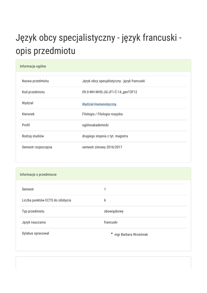 Język obcy specjalistyczny - język francuski opis przedmiotu Informacje ogólne Nazwa przedmiotu Język obcy specjalistyczny - język francuski Kod przedmiotu 09.0-WH-WHD-JS/JF1-Ć-14_genT3F12 Wydział Wydział Humanistyczny Kierunek Filologia / Filologia rosyjska Profil ogólnoakademicki Rodzaj studiów drugiego stopnia z tyt. magistra Semestr rozpoczęcia semestr zimowy 2016/2017 Informacje o przedmiocie Semestr 1 Liczba punktów ECTS do zdobycia 6 Typ przedmiotu obowiązkowy Język nauczania francuski Sylabus opracował mgr Barbara Wrześniak Formy zajęć Forma Liczba godzin w Liczba godzin w Liczba godzin w Liczba godzin w Forma zajęć semestrze tygodniu semestrze tygodniu zaliczenia (stacjonarne) (stacjonarne) (niestacjonarne) (niestacjonarne) 30 2 - - Ćwiczenia Zaliczenie Cel przedmiotu Celem zajęć jest doskonalenie praktycznej znajomości języka francuskiego w zakresie języka specjalistycznego używanego w pracy zawodowej oraz przygotowanie studentów do funkcjonowania na rynku pracy w różnorodnych sytuacjach komunikacyjnych, specyficznych dla sektorów, zawodów i stanowisk. Zajęcia rozwijają umiejętności językowo – komunikacyjne i specjalistyczną kompetencję leksykalną, niezbędne do funkcjonowania we francuskim świecie biznesu. Wymagania wstępne Poziom znajomości języka francuskiego co najmniej B1+. Zakres tematyczny 1. Analiza i przekład tekstów specjalistycznych z wybranych dziedzin zawodowych (ekonomia, handel, marketing, usługi, turystyka, prawo i administracja) oraz podstawowa leksyka w tym zakresie. 2. Podstawowe dokumenty cywilne (akty stanu cywilnego, zameldowanie, zaświadczenie o niekaralności, świadectwa szkolne i dyplomy, itp.) i ich tłumaczenie, oferty pracy po francusku, życiorys, list motywacyjny. 3. Korespondencja urzędowa (prośba, decyzja, odwołanie od decyzji, skarga, zaświadczenie, wezwanie, reklamacja, odpowiedź na reklamację, itp.) i biznesowa (listowa i mailowa). 4. Informacje ogólne na temat francuskiej ekonomii i najważniejszych francuskojęzycznych firm. 5. Organizacja i struktura we francuskojęzycznym przedsiębiorstwie; relacje społeczne we francuskojęzycznym środowisku biznesowym. 6. Komunikacja ustna we francuskojęzycznej firmie: służbowe rozmowy telefoniczne, negocjacje w firmie i na targach, podejmowanie klientów w firmie, prezentacja firmy i produktu, itp. Metody kształcenia Praca indywidualna, praca w grupach, mini-projekt, prezentacja werbalna (exposé) lub multimedialna, praca z tekstem autentycznym (analiza, rozumienie, tłumaczenie), dyskusja i debata, ćw. symulacyjne, technika ról, ćw. leksykalne. Efekty kształcenia i metody weryfikacji osiągania efektów kształcenia Opis efektu Student zna terminologię stosowaną w Symbole efektów KN2_W02 Metody weryfikacji odpowiedź ustna języku francuskim specjalistycznym na praca kontrolna poziomie rozszerzonym. praca pisemna Student potrafi logicznie argumentować KN2_U06 oraz formułować wnioski i sądy w języku odpowiedź ustna Forma zajęć Ćwiczenia Ćwiczenia praca pisemna obcym. Student potrafi popularyzować wiedzę o KN2_U10 obserwacja i ocena humanistyce oraz wytworach kultury i jej aktywności na instytucjach w języku polskim i zajęciach francuskim. odpowiedź ustna Student posiada pogłębioną umiejętność KN2_U11 obserwacja i ocena tworzenia użytkowych prac pisemnych w aktywności na języku francuskim z wykorzystaniem zajęciach podstawowych ujęć teoretycznych i praca pisemna korzystając z literatury przedmiotu. Ćwiczenia Ćwiczenia Opis efektu Symbole efektów Student posiada pogłębioną umiejętność Metody weryfikacji KN2_U12 Forma zajęć obserwacja i ocena przygotowania wystąpień ustnych w aktywności na języku francuskim. zajęciach Ćwiczenia odpowiedź ustna Student ma znajomość języka KN2_U14 praca kontrolna Ćwiczenia Student potrafi kierować małym KN2_K03 aktywność w trakcie Ćwiczenia zespołem, przyjmując odpowiedzialność KN2_K04 zajęć francuskiego. za efekty jego pracy oraz pracować w obserwacje i ocena grupie, przyjmując różne w niej role. umiejętności praktycznych studenta Warunki zaliczenia Zaliczenie na ocenę na podstawie 2 pisemnych sprawdzianów w ciągu semestru (50% oceny końcowej), domowych prac tłumaczeniowychj (30 % oceny końcowej) oraz aktywnej obecności na zajęciach (20 % oceny końcowej). Obciążenie pracą Obciążenie pracą Studia Studia niestacjonarne stacjonarne (w godz.) (w godz.) Godziny kontaktowe (udział w zajęciach; konsultacjach; egzaminie, itp.) 50 - Samodzielna praca studenta (przygotowanie do: zajęć, kolokwium, 100 - egzaminu; studiowanie literatury przygotowanie: pracy pisemnej, projektu, prezentacji, raportu, wystąpienia; itp.) Łącznie 150 - Punkty ECTS Studia Studia niestacjonarne stacjonarne Zajęcia z udziałem nauczyciela akademickiego 2 - Zajęcia bez udziału nauczyciela akademickiego 4 - Łącznie 6 - Literatura podstawowa Dobór tekstów do praktycznych ćwiczeń tłumaczeniowych według wyboru prowadzącego /dokumentacja techniczna, dokumenty o charakterze prawno-administracyjnym, broszury popularno-naukowe, prasa specjalistyczna itp./. Literatura uzupełniająca 1. Fèvre, J.-M. i Zając, M., Mały praktyczny słownik biznesmena, francusko-polski, polsko-francuski, WSiP,Warszawa, 1992. 2. Tauzin, B. i Dubois, A.-L., L’express. Le monde professionnel en français, Hachette, Paris, 2006 3. Skibińska E., ( 2001), Inaczej mówiąc... Tłumaczenie z francuskiego na polski, Wrocław: DWE 4. Tomaszkiewicz T. (red.), (2006), Odpowiednie dać rzeczy słowo … czyli jak tłumaczyć z francuskiego na nasze i odwrotnie, Poznań: UAM Uwagi Zmodyfikowane przez dr Aleksandra Urban-Podolan (ostatnia modyfikacja: 09-09-2016 13:35)