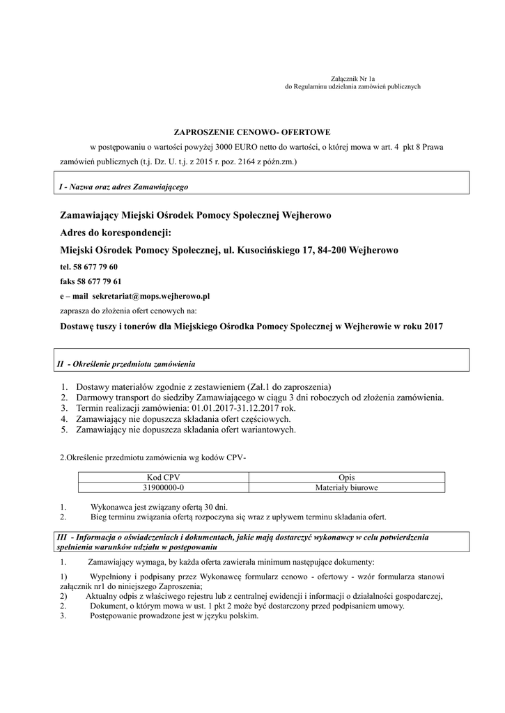 Załącznik Nr 1a do Regulaminu udzielania zamówień publicznych ZAPROSZENIE CENOWO- OFERTOWE w postępowaniu o wartości powyżej 3000 EURO netto do wartości, o której mowa w art. 4 pkt 8 Prawa zamówień publicznych (t.j. Dz. U. t.j. z 2015 r. poz. 2164 z późn.zm.) I - Nazwa oraz adres Zamawiającego Zamawiający Miejski Ośrodek Pomocy Społecznej Wejherowo Adres do korespondencji: Miejski Ośrodek Pomocy Społecznej, ul. Kusocińskiego 17, 84-200 Wejherowo tel. 58 677 79 60 faks 58 677 79 61 e – mail [email protected] zaprasza do złożenia ofert cenowych na: Dostawę tuszy i tonerów dla Miejskiego Ośrodka Pomocy Społecznej w Wejherowie w roku 2017 II - Określenie przedmiotu zamówienia 1. 2. 3. 4. 5. Dostawy materiałów zgodnie z zestawieniem (Zał.1 do zaproszenia) Darmowy transport do siedziby Zamawiającego w ciągu 3 dni roboczych od złożenia zamówienia. Termin realizacji zamówienia: 01.01.2017-31.12.2017 rok. Zamawiający nie dopuszcza składania ofert częściowych. Zamawiający nie dopuszcza składania ofert wariantowych. 2.Określenie przedmiotu zamówienia wg kodów CPVKod CPV 31900000-0 1. 2. Opis Materiały biurowe Wykonawca jest związany ofertą 30 dni. Bieg terminu związania ofertą rozpoczyna się wraz z upływem terminu składania ofert. III - Informacja o oświadczeniach i dokumentach, jakie mają dostarczyć wykonawcy w celu potwierdzenia spełnienia warunków udziału w postępowaniu 1. Zamawiający wymaga, by każda oferta zawierała minimum następujące dokumenty: 1) Wypełniony i podpisany przez Wykonawcę formularz cenowo - ofertowy - wzór formularza stanowi załącznik nr1 do niniejszego Zaproszenia; 2) Aktualny odpis z właściwego rejestru lub z centralnej ewidencji i informacji o działalności gospodarczej, 2. Dokument, o którym mowa w ust. 1 pkt 2 może być dostarczony przed podpisaniem umowy. 3. Postępowanie prowadzone jest w języku polskim. IV - Informacja o sposobie porozumiewania się zamawiającego z wykonawcami oraz przekazywania oświadczeń i dokumentów Wszelkie oświadczenia, wnioski, zawiadomienia oraz informacje zamawiający i wykonawcy mogą przekazywać pisemnie na adres Zamawiającego, za pomocą, faksu lub drogą elektroniczną V - Osoby po stronie zamawiającego uprawnione do porozumiewania się z wykonawcami 1.Osobą uprawnioną do kontaktowania się z Wykonawcami i udzielania wyjaśnień dotyczących postępowania jest w sprawach proceduralnych i merytorycznych: - Robert Kozłowski tel 58 677 79 69 - Danuta Kocur tel. 58 677 79 65 [email protected] 2.Wykonawca może zwrócić się do Zamawiającego o wyjaśnienie treści Zaproszenia. VI - Miejsce i termin składania i otwarcia ofert 1.Ofertę cenową należy złożyć w siedzibie Zamawiającego: Miejski Ośrodek Pomocy Społecznej ul. Kusocińskiego 17, 84-200 Wejherowo sekretariat Termin złożenia oferty 23.12.2016 rok do godziny 9.00 lub faksem nr 58 677 79 61 lub e-mailem [email protected] potwierdzone następnie w formie pisemnej VII - Opis sposobu obliczenia ceny 1.Na formularzu cenowo -ofertowym (załącznik Nr 1 do Zaproszenia) należy przedstawić cenę netto i brutto przedmiotu zamówienia oraz stawkę podatku VAT. 2.Wartość cenową należy wpisać w polskich złotych z precyzją do dwóch miejsc po przecinku oraz słownie. 3.Cena zawierać ma wszystkie koszty przedmiotu zamówienia. VIII- Kryteria oceny ofert 1. Zamawiający będzie się kierował następującymi kryteriami: CENA – 100% IX - Informacja dotycząca walut obcych, w jakich mogą być prowadzone rozliczenia między zamawiającym i wykonawcą Rozliczenia między Zamawiającym i Wykonawcą będą prowadzone w polskich złotych. X - Informacje o formalnościach, jakie powinny zostać dopełnione po wyborze oferty w celu zawarcia umowy w sprawie zamówienia publicznego 1.O wyborze oferty cenowej Zamawiający zawiadomi niezwłocznie wykonawców, którzy ubiegali się o udzielenie zamówienia. 2.Zamawiający zawrze umowę niezwłocznie po przekazaniu zawiadomienia o wyborze oferty. 3.Jeżeli Wykonawca, którego oferta została wybrana, uchyli się od zawarcia umowy, Zamawiający wybierze ofertę najkorzystniejszą spośród pozostałych ofert, bez przeprowadzania ich ponownej oceny. 4.Do prowadzonego postępowania nie przysługują wykonawcom środki ochrony prawnej określone odpowiednio w przepisach ustawy Prawo zamówień publicznych. 5.Niniejsze postępowanie prowadzone jest na zasadach opartych na wewnętrznych uregulowaniach organizacyjnych oraz na podstawie art. 4 pkt 8 ustawy z dnia 29 stycznia 2004 r. Prawo zamówień publicznych (Dz. U. z 2015 r. poz. 2164) Załączniki do Zaproszenia 1. Formularz ofertowy Proszę o pisemne/e- mail potwierdzenie otrzymania oferty. ZATWIERDZAM: Dyrektor Miejskiego Ośrodka Pomocy Społecznej w Wejherowie mgr Anna Kosmalska Załącznik nr 1 do Zaproszenia pieczęć adresowa wykonawcy FORMULARZ CENOWO-OFERTOWY Dotyczy zamówienia na: Dostawę tuszy i tonerów dla Miejskiego Ośrodka Pomocy Społecznej w Wejherowie w roku 2017 Oferujemy przedmiot zamówienia zgodnie z Zaproszeniem: Lp Nazwa artykułu 1 Toner do drukarki HP Laser Jet P1102 2 Toner do drukarki HP Laser Jet 1018 3 Toner do drukarki HP Laser Jet 1020 4 Toner do drukarki HP Laser Jet 2055dn 5 Toner do drukarki HP Laser Jet 1606dn 6 Toner do drukarki HP Laser Jet 1536 dnf 7 Toner do drukarki Lexmark MX 410de 8 Tusze do drukarki Ofice Jet Pro X576DW 9 Tusze do drukarki HP Laser Jet 7500A ORYGINAŁ Cena jednostkowa netto/brutto Wydajność: stron ZAMIENNIK Cena jednostkowa netto/brutto Wydajność: stron 10 Toner do kserokopiarki CD 1016 11 Toner do kserokopiarki CD 1216 Toner do drukarki Laser Jet ProMFP M 12 225dn 13 Toner do kserokopiarki UTAX CD 1216 14 Toner do drukarki HP Laser Jet P 3015 15 Tusze do drukarki EPSON L810 16 Tusze do drukarki EPSON L655 Przedmiot zamówienia wykonamy po podpisaniu umowy. Oświadczamy, iż uważamy się za związanych niniejszą ofertą w okresie zawartym w 