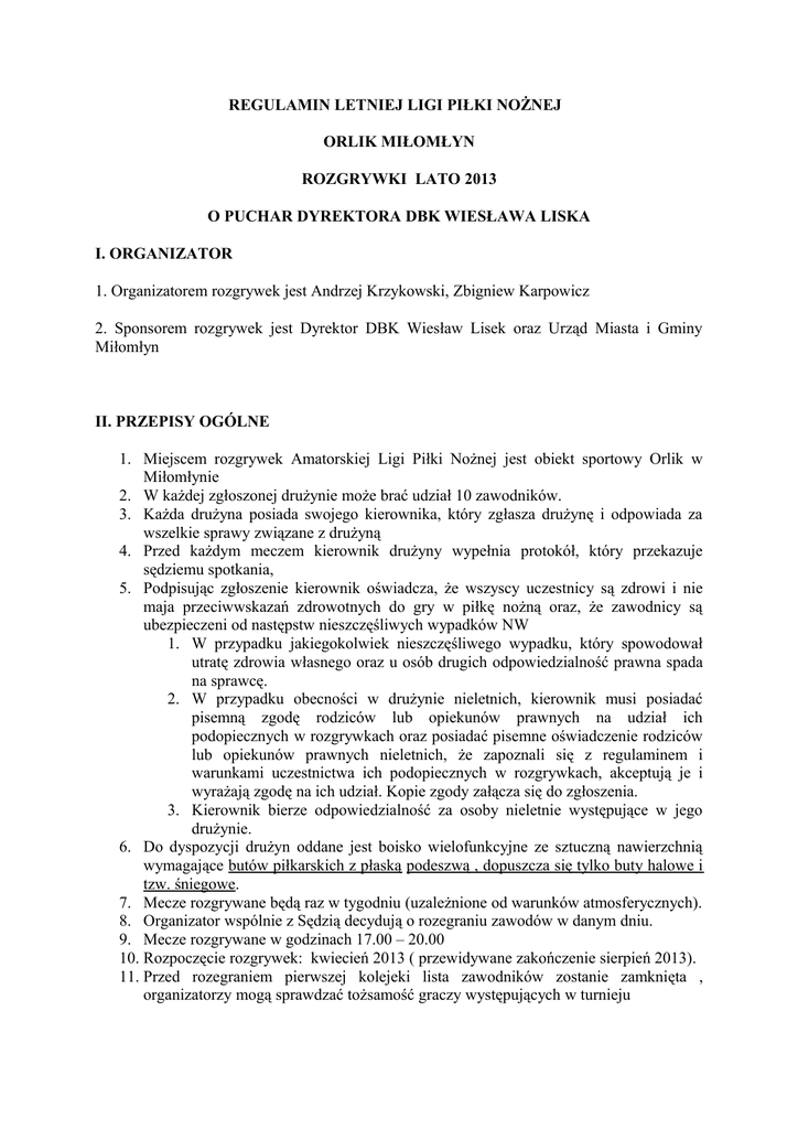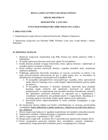 REGULAMIN LETNIEJ LIGI PIŁKI NOŻNEJ ORLIK MIŁOMŁYN ROZGRYWKI LATO 2013 O PUCHAR DYREKTORA DBK WIESŁAWA LISKA I. ORGANIZATOR 1. Organizatorem rozgrywek jest Andrzej Krzykowski, Zbigniew Karpowicz 2. Sponsorem rozgrywek jest Dyrektor DBK Wiesław Lisek oraz Urząd Miasta i Gminy Miłomłyn II. PRZEPISY OGÓLNE 1. Miejscem rozgrywek Amatorskiej Ligi Piłki Nożnej jest obiekt sportowy Orlik w Miłomłynie 2. W każdej zgłoszonej drużynie może brać udział 10 zawodników. 3. Każda drużyna posiada swojego kierownika, który zgłasza drużynę i odpowiada za wszelkie sprawy związane z drużyną 4. Przed każdym meczem kierownik drużyny wypełnia protokół, który przekazuje sędziemu spotkania, 5. Podpisując zgłoszenie kierownik oświadcza, że wszyscy uczestnicy są zdrowi i nie maja przeciwwskazań zdrowotnych do gry w piłkę nożną oraz, że zawodnicy są ubezpieczeni od następstw nieszczęśliwych wypadków NW 1. W przypadku jakiegokolwiek nieszczęśliwego wypadku, który spowodował utratę zdrowia własnego oraz u osób drugich odpowiedzialność prawna spada na sprawcę. 2. W przypadku obecności w drużynie nieletnich, kierownik musi posiadać pisemną zgodę rodziców lub opiekunów prawnych na udział ich podopiecznych w rozgrywkach oraz posiadać pisemne oświadczenie rodziców lub opiekunów prawnych nieletnich, że zapoznali się z regulaminem i warunkami uczestnictwa ich podopiecznych w rozgrywkach, akceptują je i wyrażają zgodę na ich udział. Kopie zgody załącza się do zgłoszenia. 3. Kierownik bierze odpowiedzialność za osoby nieletnie występujące w jego drużynie. 6. Do dyspozycji drużyn oddane jest boisko wielofunkcyjne ze sztuczną nawierzchnią wymagające butów piłkarskich z płaską podeszwą , dopuszcza się tylko buty halowe i tzw. śniegowe. 7. Mecze rozgrywane będą raz w tygodniu (uzależnione od warunków atmosferycznych). 8. Organizator wspólnie z Sędzią decydują o rozegraniu zawodów w danym dniu. 9. Mecze rozgrywane w godzinach 17.00 – 20.00 10. Rozpoczęcie rozgrywek: kwiecień 2013 ( przewidywane zakończenie sierpień 2013). 11. Przed rozegraniem pierwszej kolejeki lista zawodników zostanie zamknięta , organizatorzy mogą sprawdzać tożsamość graczy występujących w turnieju 12. Organizatorzy mogą przyznać walkowera lub wykluczyć drużynę za nie zastosowanie się do regulaminu 1. Organizator zapewnia wyłącznie doraźną pomoc przy urazach, powstałych w czasie gry(opatrzenie otarć, dezynfekcja ran, zabezpieczenie ran - plaster, bandaż ), natomiast nie ponosi odpowiedzialności prawnej za udział w rozgrywkach osób chorych i wynikające z tego powodu wypadki, oraz skutki wypadków w czasie gry każdego z zawodników. 2. Ze względu na bezpieczeństwo osób (np. przeciwnika) zawodnicy nie mogą grać w okularach, łańcuszkach itp. 3. Wszystkie drużyny otrzymają puchary za udział w lidze. Najlepsze drużyny zostaną nagrodzone. Przewiduje się ponadto nagrodę dla najlepszego zawodnika, najlepszego bramkarza oraz nagrodę fair-play. 4. Prowadzona będzie klasyfikacja najlepszego strzelca każdej kolejki oraz całych rozgrywek, który na zakończenie również zostanie nagrodzony. 5. Wyniki meczy i klasyfikacja drużyn będzie umieszczana na stronie www.milomlyn.pl zakładka liga orlika III. SYSTEM I ZASADY ROZGRYWEK 1. System rozgrywek: 1. Mecze rozgrywane będą systemem II rundowym każdy z każdym . 2. O kolejności miejsc w lidze decyduje: 1. większa ilość zdobytych punktów 2. wynik bezpośredniego spotkania przy dwóch zespołach z jednakową ilością punktów 3. mała tabela przy 3-ch zespołach z jednakową ilością punktów 4. lepsza różnica zdobytych bramek 5. większa ilość zdobytych bramek 3. Za zwycięstwo w meczu przyznaje się 3 punkty za remis jeden, porażka zero punktów. 4. W przypadku nie stawienia się drużyny na mecz sędzia przyznaje walkower 5-0 IV. PRZEPISY GRY 1. 2. 3. 4. 5. 6. 7. 8. Mecz składa się z dwóch równych części po 15 minut każda Drużyny grają po 6 zawodników, w tym jeden bramkarz w stroju odróżniającym się od pozostałych zawodników drużyny. Aby mecz mógł się rozpocząć na boisku musi znajdować się minimum 4 zawodników każdej z drużyn. Walkower orzeka sędzia po upływie 10 minut od przewidzianego czasu rozpoczęcia rozgrywek. Zmiany są lotne wyłącznie w strefie zmian. Strefą zmian określony jest obszar przy ławce zawodników rezerwowych drużyny. Piłka z autu jest wybijana nogą (piłka obrysem musi dotykać linii bocznej). Bramkarz wprowadza piłkę do gry ręką podając ją do zawodnika (piłka musi opuścić pole karne). 9. Drużyna ma 4 sekundy na wprowadzenie piłki do gry. Po tym czasie sędzia odgwizduje rzut wolny dla drużyny przeciwnej. 10. Zawodnik drużyny przeciwnej powinien znajdować się 5 metrów od miejsca wybijania autu, rzutu rożnego, bądź rzutu wolnego. Zawodnik sam niezwłocznie odchodzi na przepisową odległość, nie czekając na znak sędziego. Uporczywe blokowanie wybicia piłki karane jest karą 2 minutową. 11. Sędziowie mają prawo usuwać zawodników na kary czasowe: 2 oraz 5 minut. 12. W przypadku poważnie rażących fauli lub wybitnie niesportowych zachowań sędziowie mają prawo usunąć zawodnika z pola gry (czerwona kartka). 13. Czerwona kartka dyskwalifikuje zawodnika nią ukaranego z udziału w bieżących zawodach oraz jednym kolejnym meczu. 14. Drużyna, w której występował ukarany zawodnik, po 5 minutach od wznowienia gry po wykluczeniu, ma prawo wprowadzić innego zawodnika. 15. Zawodnik powraca na boisko po wyraźnym wskazaniu sędziego. 16. Drużyna gra w osłabieniu przez okres trwania kary - w przypadku utraty bramki przez drużynę grającą w osłabieniu zawodnik powraca na boisko (nie dotyczy przewinień ukaranych czerwoną kartką). 17. Za dokonanie zmiany w miejscu do tego nie przeznaczonym sędzia udziela drużynie karę 2 minut dla jednego zawodnika i przez ten c
