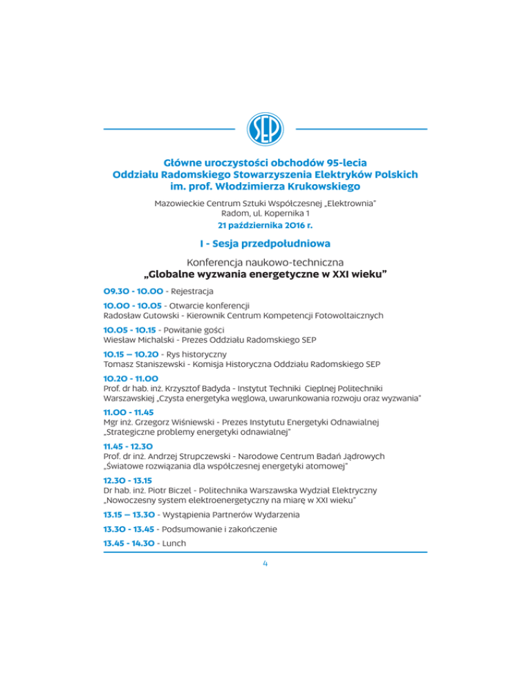Główne uroczystości obchodów 95-lecia Oddziału Radomskiego Stowarzyszenia Elektryków Polskich im. prof. Włodzimierza Krukowskiego Mazowieckie Centrum Sztuki Współczesnej „Elektrownia” Radom, ul. Kopernika 1 21 października 2016 r. I - Sesja przedpołudniowa Konferencja naukowo-techniczna „Globalne wyzwania energetyczne w XXI wieku” 09.30 - 10.00 - Rejestracja 10.00 - 10.05 - Otwarcie konferencji Radosław Gutowski - Kierownik Centrum Kompetencji Fotowoltaicznych 10.05 - 10.15 - Powitanie gości Wiesław Michalski - Prezes Oddziału Radomskiego SEP 10.15 – 10.20 - Rys historyczny Tomasz Staniszewski - Komisja Historyczna Oddziału Radomskiego SEP 10.20 - 11.00 Prof. dr hab. inż. Krzysztof Badyda - Instytut Techniki Cieplnej Politechniki Warszawskiej „Czysta energetyka węglowa, uwarunkowania rozwoju oraz wyzwania” 11.00 - 11.45 Mgr inż. Grzegorz Wiśniewski - Prezes Instytutu Energetyki Odnawialnej „Strategiczne problemy energetyki odnawialnej” 11.45 - 12.30 Prof. dr inż. Andrzej Strupczewski - Narodowe Centrum Badań Jądrowych „Światowe rozwiązania dla współczesnej energetyki atomowej” 12.30 - 13.15 Dr hab. inż. Piotr Biczel - Politechnika Warszawska Wydział Elektryczny „Nowoczesny system elektroenergetyczny na miarę w XXI wieku” 13.15 – 13.30 - Wystąpienia Partnerów Wydarzenia 13.30 - 13.45 - Podsumowanie i zakończenie 13.45 - 14.30 - Lunch 4 21 października 2016 r. II - Sesja popołudniowa Gala Jubileuszowa 16.00 - 16.15 Rozpoczęcie gali i przywitanie gości Wiesław Michalski - Prezes Oddziału Radomskiego SEP 16.15 - 16.45 95 lat Oddziału Radomskiego SEP 16.45 - 17.00 Wręczenie odznaczeń 17.00 - 17.15 Wystąpienia zaproszonych Gości 17.15 - 17.30 Referat historyczny - Prof. Jerzy Hickiewicz „Początki elektrotechnicznego szkolnictwa wyższego w Polsce” 17.30 - 17.45 Wystąpienia Partnerów Wydarzenia 17.45 - 18.15 Część artystyczna 18.15 - 18.20 Zakończenie gali 19.00 Uroczysta kolacja hotel AVIATOR Dopełnieniem uroczystego Jubileuszu będzie wystawa i konferencja pt. „Początki elektryfikacji miast w Królestwie Polskim – Elektrownia Miejska w Radomiu” oraz „III Międzynarodowa Konferencja poświęcona pamięci Patrona Oddziału Radomskiego SEP prof. dr. inż. Włodzimierza Krukowskiego”, która odbędzie się w listopadzie 2017 r. Wydarzenia te są organizowane przez PS IEEE, Marszałka Województwa Mazowieckiego i SEP. 5 STOWARZYSZENIE ELEKTRYKÓW POLSKICH ODDZIAŁ RADOMSKI im. prof. Włodzimierza Krukowskiego Przewodnicząca Komitetu Organizacyjnego Joanna Perkuszewska tel. 696 116 180 Zastępcy Przewodniczącego Komitetu Organizacyjnego Marek Grzywacz tel. 603 681 334 Wiesław Michalski tel. 600 952 525 Jacek Szydłowski tel. 602 708 172 Radosław Gutowski tel. 886 744 999 Piotr Brzeziński tel. 665 966 525 Radosław Figura tel. 609 227 436 Paweł Kubicki tel. 503 199 008 Jerzy Cholewiński tel. 602 350 106 Sekretarz Organizacyjny Bogusław Strzelec tel. 502 211 812 Dane adresowe: 26-600 Radom, ul. W. Krukowskiego 1 (budynek NOT) tel./fax 48 362 87 47 [email protected] - prezes OR SEP tel. 48 340 29 48 [email protected] - sekretariat OR SEP www. sep.radom.pl konto: Alior Bank S.A. nr 96 2490 0005 0000 4530 9622 1675 Regon: 672507224, NIP: 796-008-31-12 6 Partnerzy wydarzenia Patronat merytoryczny: Członek wspierający: Sponsorzy: Patronat medialny: ELEKTROWNIA: 51O 23’ 53” N 21O 8’ 59” E Hotel Aviator: 51O 24’ 16” N 21O 9’ 4” E Akredytowane szkolenia dla instalatorów systemów fotowoltaicznych Nr akredytacji UDT – OZE/21/00012/14
