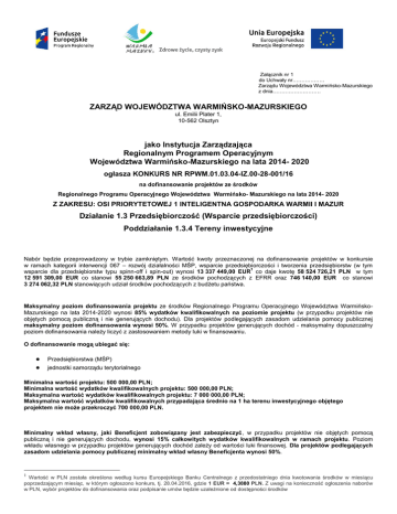 Załącznik nr 1 do Uchwały nr……………… Zarządu Województwa Warmińsko-Mazurskiego z dnia……………………… ZARZĄD WOJEWÓDZTWA WARMIŃSKO-MAZURSKIEGO ul. Emilii Plater 1, 10-562 Olsztyn jako Instytucja Zarządzająca Regionalnym Programem Operacyjnym Województwa Warmińsko-Mazurskiego na lata 2014- 2020 ogłasza KONKURS NR RPWM.01.03.04-IZ.00-28-001/16 na dofinansowanie projektów ze środków Regionalnego Programu Operacyjnego Województwa Warmińsko- Mazurskiego na lata 2014- 2020 Z ZAKRESU: OSI PRIORYTETOWEJ 1 INTELIGENTNA GOSPODARKA WARMII I MAZUR Działanie 1.3 Przedsiębiorczość (Wsparcie przedsiębiorczości) Poddziałanie 1.3.4 Tereny inwestycyjne Nabór będzie przeprowadzony w trybie zamkniętym. Wartość kwoty przeznaczonej na dofinansowanie projektów w konkursie w ramach kategorii interwencji 067 – rozwój działalności MŚP, wsparcie przedsiębiorczości i tworzenia przedsiębiorstw (w tym 1 wsparcie dla przedsiębiorstw typu spinn-off i spin-out) wynosi 13 337 449,00 EUR co daje kwotę 58 524 726,21 PLN w tym 12 591 309,00 EUR co stanowi 55 250 663,89 PLN ze środków pochodzących z EFRR oraz 746 140,00 EUR co stanowi 3 274 062,32 PLN stanowiących udział środków pochodzących z budżetu państwa. Maksymalny poziom dofinansowania projektu ze środków Regionalnego Programu Operacyjnego Województwa WarmińskoMazurskiego na lata 2014-2020 wynosi 85% wydatków kwalifikowalnych na poziomie projektu (w przypadku projektów nie objętych pomocą publiczną i nie generujących dochodu). Dla projektów podlegających zasadom udzielania pomocy publicznej maksymalny poziom dofinansowania wynosi 50%. W przypadku projektów generujących dochód - maksymalny dopuszczalny poziom dofinansowania należy liczyć z zastosowaniem metody luki w finansowaniu. O dofinansowanie mogą ubiegać się: Przedsiębiorstwa (MŚP) jednostki samorządu terytorialnego Minimalna wartość projektu: 500 000,00 PLN; Minimalna wartość wydatków kwalifikowalnych projektu: 500 000,00 PLN; Maksymalna wartość wydatków kwalifikowalnych projektu: 7 000 000,00 PLN; Maksymalna wartość wydatków kwalifikowalnych przypadająca średnio na 1 ha terenu inwestycyjnego objętego projektem nie może przekroczyć 700 000,00 PLN. Minimalny wkład własny, jaki Beneficjent zobowiązany jest zabezpieczyć, w przypadku projektów nie objętych pomocą publiczną i nie generujących dochodu, wynosi 15% całkowitych wydatków kwalifikowalnych w ramach projektu. Poziom wkładu własnego w przypadku projektów generujących dochód zależy od wartości luki finansowej. Dla projektów podlegających zasadom udzielania pomocy publicznej minimalny wkład własny Beneficjenta wynosi 50%. 1 Wartość w PLN została określona według kursu Europejskiego Banku Centralnego z przedostatniego dnia kwotowania środków w miesiącu poprzedzającym miesiąc, w którym ogłoszono konkurs, tj. 28.04.2016, gdzie 1 EUR = 4,3880 PLN. Z uwagi na konieczność ogłoszenia naborów w PLN, wybór projektów do dofinansowania oraz podpisanie umów będzie uzależnione od dostępności środków Realizacja projektu musi zakończyć się najpóźniej do 30 września 2018 r. Przewidziane do wsparcia typy projektów: W ramach poddziałania wpierane będą projekty polegające na: utworzeniu nowych lub dostosowaniu istniejących terenów na rzecz rozwoju gospodarczego, uporządkowaniu i przygotowaniu terenów inwestycyjnych w celu nadania im nowych funkcji gospodarczych, uzbrojeniu terenów inwestycyjnych (infrastruktura wodno-kanalizacyjna, telekomunikacyjna, energetyczna, gazowa, ciepłownicza), budowie lub modernizacji układu komunikacyjnego dla terenu inwestycyjnego (wewnętrzna infrastruktura drogowa, wewnętrzna infrastruktura kolejowa). Wśród terenów objętych poddziałaniem będą także obszary powojskowe – nie pozostające w zasobach Agencji Mienia Wojskowego ani żadnej innej instytucji zarządzającej terenami wojskowymi a także tereny poprzemysłowe, pokolejowe i popegeerowskie. Powyższym działaniom towarzyszyć będą mogły działania promocyjne służące upowszechnieniu wiedzy o dostępności infrastruktury (wyłącznie jako komponent projektu inwestycyjnego). Preferencje uzyskają projekty z obszarów inteligentnych specjalizacji województwa warmińsko-mazurskiego. Ponadto preferowane będą projekty przedsiębiorstw oraz przedsięwzięcia wynikające z lokalnych/ponadlokalnych planów rewitalizacji miast i komplementarne do realizowanych w ramach osi priorytetowej Obszary wymagające rewitalizacji oraz działań finansowanych przy udziale Europejskiego Funduszu Społecznego. W przypadku wsparcia stanowiącego pomoc publiczną, udzielaną w ramach realizacji programu, znajdą zastosowanie właściwe przepisy prawa wspólnotowego i krajowego a wsparcie udzielone zostanie na podstawie Rozporządzenia Komisji (UE) nr 651/2014 z dnia 17 czerwca 2014 r. uznające niektóre rodzaje pomocy za zgodne z rynkiem wewnętrznym w zastosowaniu art. 107 i 108 Traktatu [GBER] oraz Rozporządzenia Ministra Infrastruktury i Rozwoju w sprawie udzielania regionalnej pomocy inwestycyjnej w zakresie celu tematycznego 3 – wzmacnianie konkurencyjności mikro, małych i średnich przedsiębiorców w ramach regionalnych programów operacyjnych na lata 2014-2020. Kryteria wyboru projektów wskazane są w dokumencie: Szczegółowy opis osi priorytetowej 1 Inteligentna Gospodarka Warmii i Mazur Regionalnego Programu Operacyjnego Województwa Warmińsko- Mazurskiego na lata 2014- 2020. Termin, miejsce i forma składania wniosków o dofinansowanie: Wniosek o dofinansowanie projektu wraz z załącznikami należy złożyć osobiście, listem poleconym, za pośrednictwem posłańca lub kuriera (liczy się data wpływu) w Urzędzie Marszałkowskim Województwa Warmińsko-Mazurskiego w Olsztynie w Departamencie Europejskiego Funduszu Rozwoju Regionalnego, ul. Kościuszki 89/91, 10-554 Olsztyn, I piętro, pok. 101, w formie