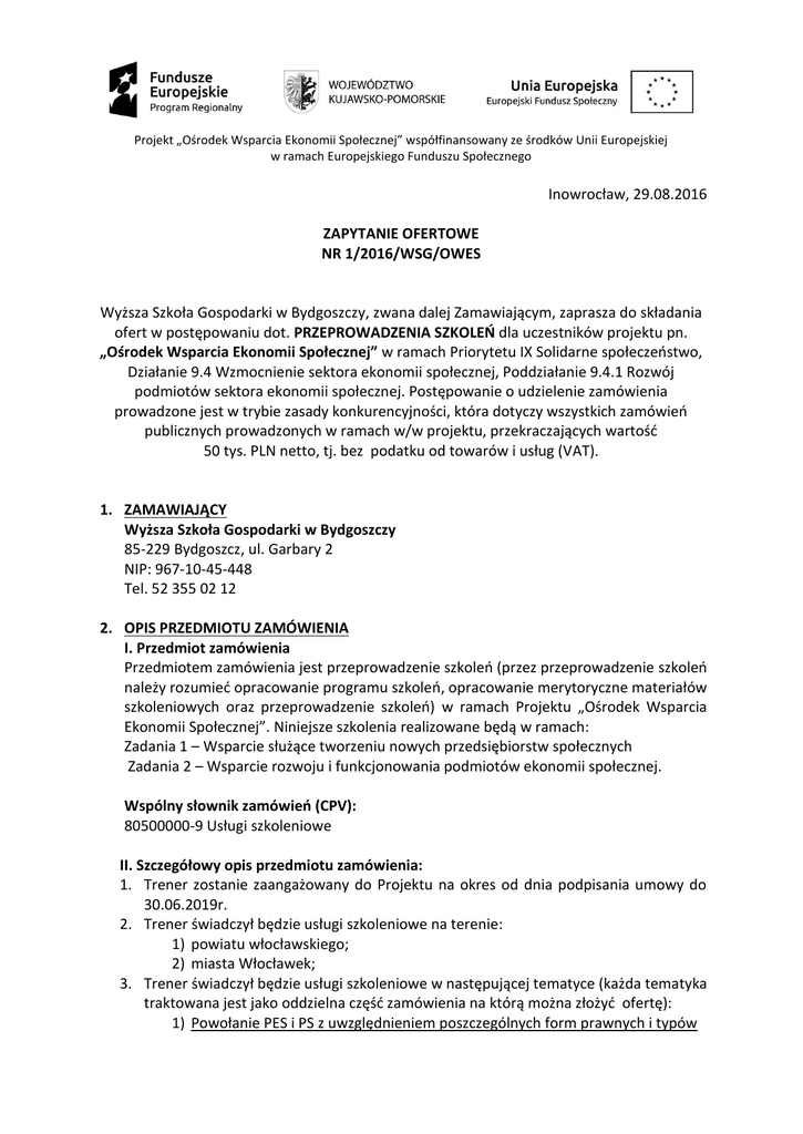 Projekt „Ośrodek Wsparcia Ekonomii Społecznej” współfinansowany ze środków Unii Europejskiej w ramach Europejskiego Funduszu Społecznego Inowrocław, 29.08.2016 ZAPYTANIE OFERTOWE NR 1/2016/WSG/OWES Wyższa Szkoła Gospodarki w Bydgoszczy, zwana dalej Zamawiającym, zaprasza do składania ofert w postępowaniu dot. PRZEPROWADZENIA SZKOLEŃ dla uczestników projektu pn. „Ośrodek Wsparcia Ekonomii Społecznej” w ramach Priorytetu IX Solidarne społeczeństwo, Działanie 9.4 Wzmocnienie sektora ekonomii społecznej, Poddziałanie 9.4.1 Rozwój podmiotów sektora ekonomii społecznej. Postępowanie o udzielenie zamówienia prowadzone jest w trybie zasady konkurencyjności, która dotyczy wszystkich zamówień publicznych prowadzonych w ramach w/w projektu, przekraczających wartość 50 tys. PLN netto, tj. bez podatku od towarów i usług (VAT). 1. ZAMAWIAJĄCY Wyższa Szkoła Gospodarki w Bydgoszczy 85-229 Bydgoszcz, ul. Garbary 2 NIP: 967-10-45-448 Tel. 52 355 02 12 2. OPIS PRZEDMIOTU ZAMÓWIENIA I. Przedmiot zamówienia Przedmiotem zamówienia jest przeprowadzenie szkoleń (przez przeprowadzenie szkoleń należy rozumieć opracowanie programu szkoleń, opracowanie merytoryczne materiałów szkoleniowych oraz przeprowadzenie szkoleń) w ramach Projektu „Ośrodek Wsparcia Ekonomii Społecznej”. Niniejsze szkolenia realizowane będą w ramach: Zadania 1 – Wsparcie służące tworzeniu nowych przedsiębiorstw społecznych Zadania 2 – Wsparcie rozwoju i funkcjonowania podmiotów ekonomii społecznej. Wspólny słownik zamówień (CPV): 80500000-9 Usługi szkoleniowe II. Szczegółowy opis przedmiotu zamówienia: 1. Trener zostanie zaangażowany do Projektu na okres od dnia podpisania umowy do 30.06.2019r. 2. Trener świadczył będzie usługi szkoleniowe na terenie: 1) powiatu włocławskiego; 2) miasta Włocławek; 3. Trener świadczył będzie usługi szkoleniowe w następującej tematyce (każda tematyka traktowana jest jako oddzielna część zamówienia na którą można złożyć ofertę): 1) Powołanie PES i PS z uwzględnieniem poszczególnych form prawnych i typów Projekt „Ośrodek Wsparcia Ekonomii Społecznej” współfinansowany ze środków Unii Europejskiej w ramach Europejskiego Funduszu Społecznego Zadanie 1: 3 szkolenia x 2 powiaty x 8 godz. dla grup liczących min. 12 osób 2) Prowadzenie działalności gospodarczej i statutowej w sferze ekonomii społecznej z uwzględnieniem poszczególnych form prawnych i typów PES Zadanie 1: 3 szkolenia x 2 powiaty x 8 godz. dla grup liczących min. 12 osób Zadanie 2: 3 szkolenia x 2 powiaty x 8 godz. dla grup liczących min. 12 osób 3) Zarządzanie organizacją, planowanie strategiczne, zarządzanie finansowe, zarządzanie zasobami ludzkimi Zadanie 1: 3 szkolenia x 2 powiaty x 8 godz. dla grup liczących min. 12 osób Zadanie 2: 3 szkolenia x 2 powiaty x 8 godz. dla grup liczących min. 12 osób 4) Aspekty prawne, finansowe, rachunkowe działalności w sferze ekonomii społecznej Zadanie 1: 6 szkoleń x 2 powiaty x 8 godz. dla grup liczących min. 12 osób Zadanie 2: 3 szkolenia x 2 powiaty x 8 godz. dla grup liczących min. 12 osób 5) Tworzenie biznesplanów oraz marketing w tym badanie rynku, tworzenie strategii cenowej, pozyskiwanie klientów Zadanie 1: 6 szkoleń x 2 powiaty x 8 godz. dla grup liczących min. 12 osób Zadanie 2: 6 szkoleń x 2 powiaty x 8 godz. dla grup liczących min. 12 osób 6) Budowanie powiązań kooperacyjnych Zadanie 2: 6 szkolenia x 2 powiaty x 8 godz. dla grup liczących min. 12 osób 7) Zakładanie i prowadzenie PES o charakterze reintegracyjnym Zadanie 1: 3 szkolenia x 2 powiaty x 8 godz. dla grup liczących min. 12 osób Zadanie 2: 3 szkolenie x 2 powiaty x 8 godz. dla grup liczących min. 12 osób 8) Umiejętności społeczne (budowanie szerokich powiązań kooperacyjnych w ramach partnerstw, sieci współpracy lokalnych podmiotów w celu rozwoju PS), kompetencje związane z pracą z osobami zagrożonymi wykluczeniem społecznym Zadanie 2: 6 szkoleń x 2 powiaty x 8 godz. dla grup liczących min. 12 osób 4. Pełny dzień szkoleniowy to 8 godzin lekcyjnych + 2 przerwy cateringowe. 5. Zamawiający zapewnia salę szkoleniową wraz z wyposażeniem oraz druk materiałów szkoleniowych opracowanych przez Wykonawcę. Sale szkoleniowe zapewnione przez Zamawiającego znajdują się w budynkach, których stan techniczny nie będzie zagrażał życiu lub zdrowiu uczestników szkoleń. 6. Trener świadczył będzie usługi na podstawie umowy cywilnoprawnej. 7. Ogólny przedmiot zamówienia podlega wstępnemu podziałowi – śr. 26 grupy szkoleniowe w roku 2016, śr. 36 grupy szkoleniowe w roku 2017, śr. 36 grupy szkoleniowe w roku 2018, oraz śr. 10 grupy szkoleniowe w roku 2019. 8. Wykonawcy przysługiwać będzie wynagrodzenie za przeprowadzone szkolenie. Zamawiający zastrzega, że czas dojazdu do miejsca realizacji szkolenia oraz czas przerw cateringowych nie podlega wliczeniu do czasu świadczenia usługi szkoleniowej. 9. Zamawiający nie zapewnia środka transportu w celu świadczenia usługi szkoleniowej – trener zapewnia sobie środek transportu we własnym zakresie. 10. Trener będzie ściśle współpracował z kadrą OWES, a jego praca będzie poddana stałemu monitoringowi w/w osób. Projekt „Ośrodek Wsparcia Ekonomii Społecznej” współfinansowany ze środków Unii Europejskiej w ramach Europejskiego Funduszu Społecznego 11. Trener rozlicza wykonanie usługi szkoleniowej poprzez przedłożenie Zamawiającemu kompletnej, wypełnionej dokumentacji szkoleniowej, udostępnionej przez Zamawiającego, oraz wypełnionej Karty Pracy Trenera. 12. Zamawiający dopuszcza możliwość zamówień uzupełniających. 13. Zamawiający dopuszcza możliwości składania ofert częściowych na wyżej wymienione szkolenia (za część oferty uznaje się oddzielnie każdą ze wskazanych tematyk szkoleń). Każdy oferent może złożyć ofertę na przeprowadzenie jednego, lub więk