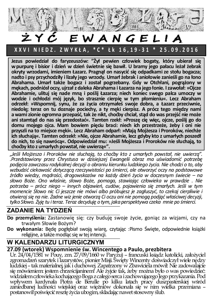 XXVI NIEDZ. ZWYKŁA, *C* Łk 16,19-31 * 25.09.2016 Jezus powiedział do faryzeuszów: ”Żył pewien człowiek bogaty, który ubierał się w purpurę i bisior i dzień w dzień świetnie się bawił. U bramy jego pałacu leżał żebrak okryty wrzodami, imieniem Łazarz. Pragnął on nasycić się odpadkami ze stołu bogacza; nadto i psy przychodziły i lizały jego wrzody. Umarł żebrak i aniołowie zanieśli go na łono Abrahama. Umarł także bogacz i został pogrzebany. Gdy w Otchłani, pogrążony w mękach, podniósł oczy, ujrzał z daleka Abrahama i Łazarza na jego łonie. I zawołał: »Ojcze Abrahamie, ulituj się nade mną i poślij Łazarza; niech koniec swego palca umoczy w wodzie i ochłodzi mój język, bo strasznie cierpię w tym płomieniu«. Lecz Abraham odrzekł: »Wspomnij, synu, że za życia otrzymałeś swoje dobra, a Łazarz przeciwnie, niedolę; teraz on tu doznaje pociechy, a ty męki cierpisz. A prócz tego między nami a wami zionie ogromna przepaść, tak że nikt, choćby chciał, stąd do was przejść nie może ani stamtąd do nas się przedostać«. Tamten rzekł: »Proszę cię więc, ojcze, poślij go do domu mojego ojca. Mam bowiem pięciu braci: niech ich przestrzeże, żeby i oni nie przyszli na to miejsce męki«. Lecz Abraham odparł: »Mają Mojżesza i Proroków, niechże ich słuchają«. Tamten odrzekł: »Nie, ojcze Abrahamie, lecz gdyby kto z umarłych poszedł do nich, to się nawrócą«. Odpowiedział mu: »Jeśli Mojżesza i Proroków nie słuchają, to choćby kto z umarłych powstał, nie uwierzą«”. „Jeśli Mojżesza i Proroków nie słuchają, to choćby kto z umarłych powstał, nie uwierzą”. .Przedstawiony przez Chrystusa w dzisiejszej Ewangelii obraz ma uświadomić potrzebę podjęcia zawczasu radykalnej decyzji o obraniu kierunku ludzkiego życia. Nie chodzi o to, aby wzbudzić ciekawość dotyczącą rzeczywistości po śmierci, ale otworzyć oczy na podstawowe źródło wiedzy, mądrości, drogowskazów na każdy dzień życia w doczesnym świecie – na słowo Boże. Ono właśnie, słowo Boże, pomaga, stawiając człowieka w prawdzie . Nie potrzeba – prócz niego – innych objawień, cudów, pojawienia się zmarłych. Jeśli w tym momencie Słowo nic Ci jeszcze nie mówi albo próbujesz je zagłuszyć, to czekaj cierpliwie i otwieraj się na nie. Żadne wiz jenie otworzą Ci oczu ani nie pomogą podjąć właściwej decyzji, tylko Słowo. Żyję tu i teraz. Teraz decyduję o tym, jaka perspektywa czeka mnie po śmierci. ZADANIE NA TYDZIEŃ Do przemyślenia: Zastanowię się: czy buduję swoje życie, goniąc za wizjami, czy na trwałym Słowie Bożym? Do wykonania: Będę pogłębiał swoją wiarę, czytając :Pismo Święte, odpowiednie książki religijne, a także modląc się w tej intencji. W KALENDARZU LITURGICZNYM 27.09 (wtorek) Wspomnienie św. Wincentego a Paulo, prezbitera Ur. 24/04/1581 w Pouy, zm. 27/09/1660 w ParyŜu) – francuski ksiądz katolicki, załoŜyciel zgromadzeń szarytek i lazarystów, pionier Misji. Święty Wincenty doświadczył wiele nędzy ludzkiej – tak materialnej, jak i duchowej. Zapatrzony w Zbawiciela mówił: Nie zadowalajcie się mówieniem: jestem chrześcijaninem! Ale Ŝyjcie tak, Ŝeby moŜna było o was powiedzieć: widziałem człowieka kochającego Boga z całego serca i zachowującego Jego przykazania. Pod wpływem kardynała Piotra de Berulle po kilku latach pracy duszpasterskiej wśród zaniedbanej ludności wiejskiej oraz więźniów dokonała się w nim wielka przemiana – postanowił poświęcić resztę Ŝycia ubogim, składając nawet stosowny ślub. 28.09 (środa) Wspomnienie św. Wacława, męczennika Postać króla św. Wacława przenosi nas do początków X wieku, a więc do czasów jeszcze sprzed Chrztu Polski. Jak Polacy mają św. Stanisława, biskupa i męczennika, Węgrzy świętego króla Stefana, tak Czesi czczą św. Wacława - króla i męczennika. Święty ten oświeca wielkim blaskiem początki dziejów naszych południowych sąsiadów, którzy przyjęli chrzest wcześniej niŜ my, Polacy, a którzy niestety dziś są jednym z najbardziej ateistycznych krajów Europy. 29.09 (czwartek) Święto św. Archaniołów Michała, Gabriela i Rafała. Na posłannictwo pierwszego z trzech znanych nam archaniołów wskazuje samo jego imię „Michał” - wywodzące się z języka hebrajskiego (Mika-el – dosł. „KtóŜ jak Bóg”). Imię to stanowi bowiem zarazem zawołanie, które archanioł ten miał wypowiedzieć stając do walki z szatanem. Posłannictwem Archanioła Michała jest zatem walka o chwałę i cześć NajwyŜszego, na czele zastępów niebieskich, którymi dowodzi on w zmaganiach z duchami ciemności (Ap 12,7-9). Archanioł Michał ma równieŜ pojawić się w czasach ostatecznych jako ten, na którego głos umarli powstaną do Ŝycia. Imię Archanioła Gabriela posiada rodowód hebrajski (Gabri-el) i znaczy tyle, co „moc BoŜa” bądź „wojownik BoŜy”, niekiedy zaś tłumaczone bywa przy pomocy obszerniejszego wyraŜenia: „Bóg okazał się mocnym”. Teksty biblijne wskazują na fakt, Ŝe Archanioł Gabriel spełnia misje o szczególnej doniosłości np. :w Nowym Testamencie jako BoŜy Posłaniec zwiastuje Maryi poczęcie i narodziny Mesjasza (Łk 1, 26-38), wcześniej zaś zjawia się Zachariaszowi, zapowiadając przyjście na świat św. Jana Chrzciciela. Na posłannictwo Archanioła Rafała wskazuje jego imię pochodzące z języka greckiego (Rafa-el), z hebrajskiego (repa’el), które na polski przełoŜyć moŜna jako „Bóg jest uzdrowieniem” czy „Bóg uleczył (zbawił)” bądź teŜ „lekarstwo Boga”. Archanioł Rafał jako jedyny spośród archaniołów przedstawia się, Ŝe jest jednym z siedmiu aniołów stojących przed Majestatem Boga (Tb 12,15). Pojawia się w Biblii jako wysłannik BoŜej Opatrzności, towarzysząc młodemu Tobiaszowi w niebezpiecznej i dalekiej drodze. Opiekuje się nim, radzi i