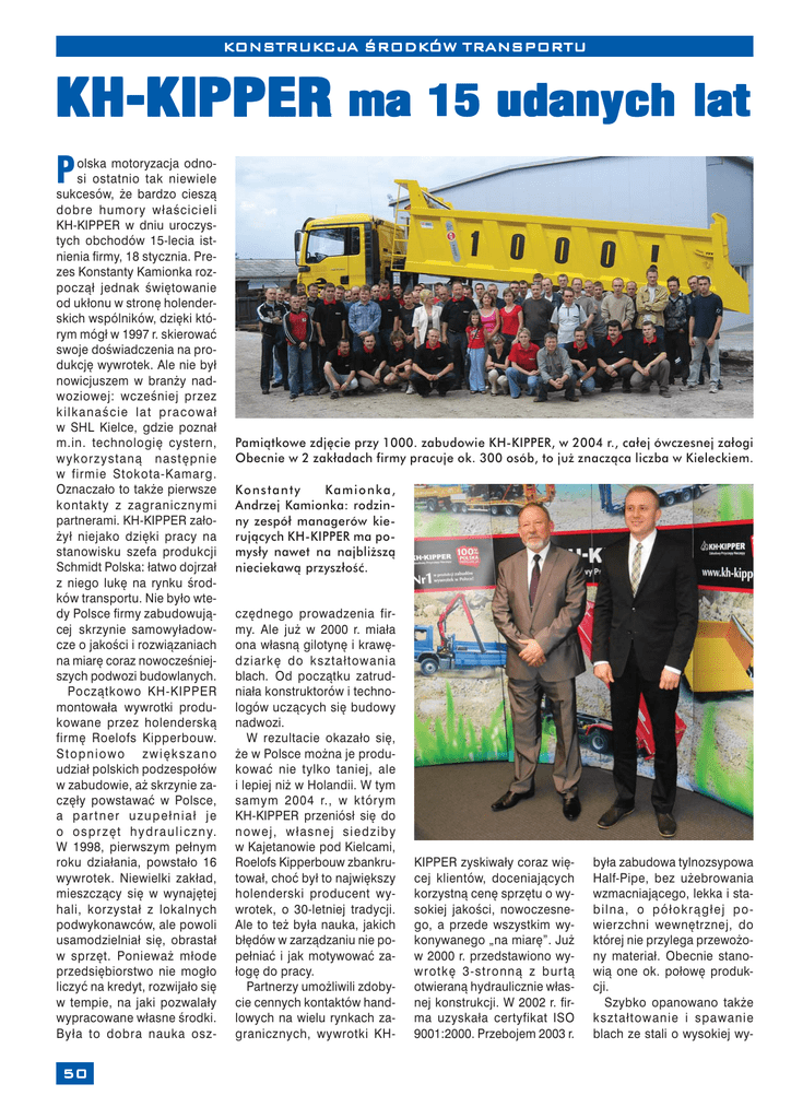KONSTRUK CJ A ŚRODK ÓW TR ANSPORTU ONSTRUKCJ CJA ŚRODKÓW TRANSPORTU KH-KIPPER ma 15 udanych lat P olska motoryzacja odnosi ostatnio tak niewiele sukcesów, że bardzo cieszą dobre humory właścicieli KH-KIPPER w dniu uroczystych obchodów 15-lecia istnienia firmy, 18 stycznia. Prezes Konstanty Kamionka rozpoczął jednak świętowanie od ukłonu w stronę holenderskich wspólników, dzięki którym mógł w 1997 r. skierować swoje doświadczenia na produkcję wywrotek. Ale nie był nowicjuszem w branży nadwoziowej: wcześniej przez kilkanaście lat pracował w SHL Kielce, gdzie poznał m.in. technologię cystern, wykorzystaną następnie w firmie Stokota-Kamarg. Oznaczało to także pierwsze kontakty z zagranicznymi partnerami. KH-KIPPER założył niejako dzięki pracy na stanowisku szefa produkcji Schmidt Polska: łatwo dojrzał z niego lukę na rynku środków transportu. Nie było wtedy Polsce firmy zabudowującej skrzynie samowyładowcze o jakości i rozwiązaniach na miarę coraz nowocześniejszych podwozi budowlanych. Początkowo KH-KIPPER montowała wywrotki produkowane przez holenderską firmę Roelofs Kipperbouw. Stopniowo zwiększano udział polskich podzespołów w zabudowie, aż skrzynie zaczęły powstawać w Polsce, a partner uzupełniał je o o s p r z ę t h y d r a u l i c z n y. W 1998, pierwszym pełnym roku działania, powstało 16 wywrotek. Niewielki zakład, mieszczący się w wynajętej hali, korzystał z lokalnych podwykonawców, ale powoli usamodzielniał się, obrastał w sprzęt. Ponieważ młode przedsiębiorstwo nie mogło liczyć na kredyt, rozwijało się w tempie, na jaki pozwalały wypracowane własne środki. Była to dobra nauka osz- 50 Pamiątkowe zdjęcie przy 1000. zabudowie KH-KIPPER, w 2004 r., całej ówczesnej załogi Obecnie w 2 zakładach firmy pracuje ok. 300 osób, to już znacząca liczba w Kieleckiem. Ko n s t a n t y Ka m i o n k a , Andrzej Kamionka: rodzinny zespół managerów kierujących KH-KIPPER ma pomysły nawet na najbliższą nieciekawą przyszłość. czędnego prowadzenia firmy. Ale już w 2000 r. miała ona własną gilotynę i krawędziarkę do kształtowania blach. Od początku zatrudniała konstruktorów i technologów uczących się budowy nadwozi. W rezultacie okazało się, że w Polsce można je produkować nie tylko taniej, ale i lepiej niż w Holandii. W tym samym 2004 r., w którym KH-KIPPER przeniósł się do nowej, własnej siedziby w Kajetanowie pod Kielcami, Roelofs Kipperbouw zbankrutował, choć był to największy holenderski producent wywrotek, o 30-letniej tradycji. Ale to też była nauka, jakich błędów w zarządzaniu nie popełniać i jak motywować załogę do pracy. Partnerzy umożliwili zdobycie cennych kontaktów handlowych na wielu rynkach zagranicznych, wywrotki KH- KIPPER zyskiwały coraz więcej klientów, doceniających korzystną cenę sprzętu o wysokiej jakości, nowoczesnego, a przede wszystkim wykonywanego „na miarę”. Już w 2000 r. przedstawiono wywrotkę 3-stronną z burtą otwieraną hydraulicznie własnej konstrukcji. W 2002 r. firma uzyskała certyfikat ISO 9001:2000. Przebojem 2003 r. była zabudowa tylnozsypowa Half-Pipe, bez użebrowania wzmacniającego, lekka i stabilna, o półokrągłej powierzchni wewnętrznej, do której nie przylega przewożony materiał. Obecnie stanowią one ok. połowę produkcji. Szybko opanowano także kształtowanie i spawanie blach ze stali o wysokiej wy- KONSTRUK CJ A ŚRODK ÓW TR ANSPORTU ONSTRUKCJ CJA ŚRODKÓW TRANSPORTU trzymałości i odporności na ścieranie Hardox/Domex lub Raex/Optim, dzięki którym skrzynie mają znacznie większa trwałość, a są lżejsze. Są jednak granice tego „odchudzania” wywrotek, w praktyce do grubości blachy 5 mm. Na naprawdę ciężkie przypadki KH-KIPPER ma opracowaną unikalną konstrukcję skrzyni z podłogą przekładkową, w której między dwoma warstwami stali znajduje się guma tłumiąca uderzenia urobku. Takie stosuje się w ciężkich pojazdach kopalnianych. Nowa hala szybko okazała się za mała, w 2007 r. dobudowano do niej kolejne 2500 m2, umożliwiając stworzenie ciągu produkcyjnego. Ale w tym czasie KH-KIPPER wszedł mocno na rynki wschodnie, co było wynikiem zarówno własnych kilkuletnich wysiłków, jak i porozumień kooperacyjnym z głównymi producentami podwozi. Trzeba było uruchomić osobny zakład spawający skrzynie w Skarżysku-Kamiennej. W 2007 r. produkcja przekroczyła 1000 sztuk, w 2008 r. 1500, a w 2009 r. firma weszła z... pełnym podwórkiem nie odebranych pojazdów. Nastąpiło gwałtowne załamanie rynku budowlanego, któremu właściwie nie ma końca. Sytuacja zmusiła kierownictwo firmy (do którego dołączył syn prezesa Andrzej Kamionka, jako dyrektor handlowy) do obmyślenia sposobów na kryzys. Jednym z nich jest stałe ulepszanie podstawowego produktu KH-KIPPER, jakim są wywrot- 2004 2007 1997 2008 ki. Co rok są prezentowane nowe rozwiązania konstrukcyjne, dzięki którym firma zdobywa i utrzymuje przy sobie klientów nawet w krajach z mocnymi lokalnymi producentami we Francji czy Niemczech. Także rynek skandynawski okazał się bardzo chłonny. Stałymi kierunkami eksportu są Rosj i Ukraina; KH-KIPPER sięga już Afryki i Japonii! Taki promień działania wymaga oczywiście bardzo aktywnego marketingu, a także równie sprawnego serwisu. Handlowcy KH-KIPPER wykorzystują każdą okazję, by spotkać się z potencjalnymi klientami i z reguły udaje się przekonać ich o najlepszej relacji ceny wywrotek do jakości i wykonania zgodnie z ich specyficznymi potrzebami. „Wielcy” producenci nie są tak elastyczni. Firma stawia na rozsądną innowacyjność, z rozwiązań ostatnich lat można wymienić wywrotkę 2-stronną ze stałą prawą burtą i lewą otwieraną hydraulicznie. Skrzynia jest wtedy lekka i sztywna, ma dużą szerokość wewnętrzną, a prawą burtę można wykorzystać np. do bezpiecznego montowania opończy albo mechanizm