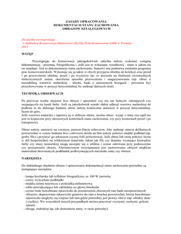 ZASADY OPRACOWANIA DOKUMENTACJI STANU ZACHOWANIA OBRAZOW SZTALUGOWYCH Do uŜytku wewnętrznego w Zakładzie Konserwacji Malarstwa i Rzeźby Polichromowanej UMK w Toruniu. 2011 WSTĘP Przystępując do konserwacji jakiegokolwiek zabytku naleŜy wykonać wstępną dokumentację - pisemną, fotograficzną i, jeśli jest to wskazane, rysunkową - stanu w jakim się on znajduje. Jest to dokumentacja stanu zachowania. Stanowi ona podstawę ustalania programu prac konserwatorskich. Wykonuje się ją takŜe w chwili przyjęcia obiektu do kolekcji oraz przed i po przewoŜeniu obiektu, przed i po wystawie itp, co pozwala na śledzenie ewentualnych niekorzystnych zmian, określenie sposobu przewoŜenia i magazynowania (np. obraz o niestabilnej warstwie malarskiej - ubytki, łuski o uniesionych brzegach - powinien być przechowywany w pozycji horyzontalnej, by uniknąć dalszych strat). TECHNIKA OBSERWACJI Po pierwsze trzeba obejrzeć lico obrazu i sprawdzić czy nie ma luźnych, odstających czy osypujących się łusek farby. Jeśli są jakiekolwiek oznaki słabej adhezji warstwy malarskiej do podłoŜa to do dalszego badania obraz naleŜy koniecznie umieścić w pozycji horyzontalnej, licem do góry. Jeśli warstwa malarska i zaprawa są w dobrym stanie, moŜna obraz wyjąć z ramy (na ogół nie jest to konieczne przy okresowych kontrolach stanu zachowania, czy przy kontrolach przed i po transporcie). Obraz naleŜy umieścić na czystym, pustym blacie roboczym. Aby uniknąć otarcia delikatnych powierzchni w czasie badania lica i odwrocia dzieła na blat naleŜy połoŜyć miękki podkład (np. gruby filc) i przykryć go arkuszem czystej folii poliestrowej. Jeśli obraz lub ramę połoŜyć licem w dół bezpośrednio na włóknistym materiale, takim jak filc czy tkanina, wystające krawędzie farby czy masy ramiarskiej mogą zaczepić się o włókna i zostać oderwane przy podnoszeniu czy przesuwaniu obrazu. Alternatywnym rozwiązaniem jest zastosowanie obitych miękkim materiałem drewnianych podkładek podtrzymujących naroŜniki ramy czy obrazu. NARZĘDZIA Do dokładnego zbadania obrazu i opracowania dokumentacji stanu zachowania potrzebne są następujące narzędzia: - lampa kreślarska lub reflektor fotograficzny ze 100 W Ŝarówką - cztery wyściełane podkładki - miękka taśma miernicza z podziałką milimetrową - szkło powiększające lub zakładany na głowę binokular - czyste białe bawełniane rękawiczki do przenoszenia złoconych ram bądź nieoprawionych obrazów, dopasowane rękawiczki gumowe do ram o kruchej powierzchni, której bawełniane rękawiczki mogłyby się czepiać lub tam gdzie potrzebny jest pewny chwyt (np. obiekty duŜe i cięŜkie). We wszystkich innych przypadkach moŜna pracować czystymi, suchymi, gołymi rękami. - obcęgi, śrubokręt itp. (do demontaŜu ramy, w razie potrzeby) TECHNIKA OŚWIETLANIA Stosując światło rozproszone, skośne lub przechodzące moŜna określić róŜne aspekty stanu zachowania obrazu. MoŜna do tego celu uŜywać jednej lub kilku przenośnych lamp ze zwykłymi 100 W Ŝarówkami. śarówki 100 W dostarczają wystarczająco jasnego światła i są lepsze od silniejszych, które emitują zbyt wiele ciepła. Jednak nawet stosując zwykłe 100 W Ŝarówki trzeba uwaŜać by nie przegrzać badanej powierzchni. PoniewaŜ emitowane ciepło nie od razu rozgrzewa powietrze pomiędzy źródłem światła a powierzchnią obrazu, oświetlaną powierzchnię trzeba co jakiś czas delikatnie sprawdzać dłonią czy się nie nagrzewa. Jeśli wyczuwamy dłonią ciepło to znaczy Ŝe lampa umieszczona jest za blisko obrazu. MoŜna uŜywać świetlówek, co eliminuje problem przegrzewania. Światło rozproszone uzyskuje się umieszczając źródło światła pod kątem 45o do powierzchni obrazu. Takie oświetlenie pozwala ocenić ogólny stan obrazu, zwłaszcza obecność zabrudzeń powierzchniowych, pociemniałego werniksu, spękań czy ubytków warstwy malarskiej. Światło skośne uzyskuje się umieszczając źródło światła z boku obrazu pod ostrym kątem tak by padało równolegle do jego powierzchni. Takie oświetlenie pozwala ocenić deformacje powierzchni takie jak sfalowanie płótna czy uniesione łuski warstwy malarskiej. Kąt padania światła naleŜy ustawić tak, by jak najbardziej uwypuklić deformacje. Zazwyczaj taką obserwację przeprowadza się na obrazie ustawionym pionowo, jeśli jednak istnieje ryzyko osypania się łusek obserwacja obrazu leŜącego poziomo jest równie skuteczna. Światło przechodzące uzyskuje się umieszczając źródło światła za obrazem. Światło prześwieca wtedy przez pęknięcia, rozdarcia, ubytki zaprawy czy miejsca bardzo cienko malowane, przez co stają się one lepiej widoczne. Obserwację taką naleŜy wykonywać w zaciemnionym pomieszczeniu z jednym tylko źródłem światła umieszczonym za obrazem. Lampa nie moŜe znajdować się bliŜej niŜ 70cm od odwrocia. Obraz naleŜy ustawić pionowo na sztaludze. Jeśli to konieczne lampę moŜna połoŜyć na podłodze a obraz umieścić poziomo nad nią opierając go na krawędzi dwóch stołów. Obraz bez krosien moŜna w tym przypadku połoŜyć na szybie. Podczas obserwacji naleŜy sprawdzać ręką czy powierzchnia odwrocia nie nagrzewa się. SPECJALNE ŹRÓDŁA ŚWIATŁA Stosując odpowiedni sprzęt moŜna uczytelnić informacje niewidoczne w świetle widzialnym. Dodatkowe informacje o stanie werniksu czy obecności przemalowań lub dawnych retuszy pozwala uzyskać ultrafiolet. Obecność podrysowania uwidacznia się w podczerwieni. Wszystkie wspomniane sposoby oświetlania wykorzystuje się takŜe do wykonania dokumentacji fotograficznej. OPIS STANU ZACHOWANIA Wykonuje się go zgodnie z instrukcją Schematu Dokumentacji Konserwatorskiej jako opis ciągły lub w punktach. Powinien zawierać szczegółowe informacje o stanie wszystkich elementów konstrukcyjnych i warstw technologicznych. PoniewaŜ obrazy mogą być bardzo złoŜo