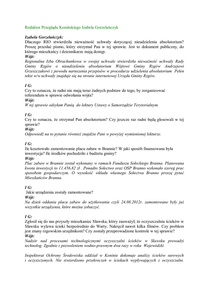 Redaktor Przeglądu Konińskiego Izabela Gorzelańczyk Izabela Gorzelańczyk: Dlaczego RIO stwierdziła nieważność uchwały dotyczącej nieudzielenia absolutorium? Proszę przesłać pismo, który otrzymał Pan w tej sprawie. Jest to dokument publiczny, do którego mieszkańcy i dziennikarze mają dostęp. Wójt: Regionalna Izba Obrachunkowa w swojej uchwale stwierdziła nieważność uchwały Rady Gminy Rzgów o nieudzieleniu absolutorium Wójtowi Gminy Rzgów Andrzejowi Grzeszczakowi z powodu naruszenia przepisów w procedurze udzielenia absolutorium Pełen tekst w/w uchwały znajduje się na stronie internetowej Urzędu Gminy Rzgów. I G: Czy to oznacza, że radni nie mają teraz żadnych podstaw do tego, by zorganizować referendum w sprawie odwołania wójta? Wójt: W tej sprawie odsyłam Panią do lektury Ustawy o Samorządzie Terytorialnym. I G: Czy to oznacza, że otrzymał Pan absolutorium? Czy jeszcze raz radni będą głosowali w tej sprawie? Wójt: Odpowiedź na to pytanie również znajdzie Pani w powyżej wymienionej lekturze. I G: Ile kosztowało zamontowanie placu zabaw w Brannie? W jaki sposób finansowana była inwestycja? Ile środków pochodziło z budżetu gminy? Wójt: Plac zabaw w Brannie został wykonany w ramach Funduszu Sołeckiego Branna. Planowana kwota inwestycji to 11.456,82 zł . Ponadto Sołectwo oraz OSP Branno wykonało szereg prac sposobem gospodarczym. O wysokość wkładu własnego Sołectwa Branno proszę pytać Mieszkańców Branna. I G: Jakie urządzenia zostały zamontowane? Wójt: Na dzień oddania placu zabaw do użytkowania czyli 24.08.2012r. zamontowane były już wszystkie urządzenia, które można zobaczyć. I G: Zgłosił się do nas przyszły mieszkaniec Sławska, który zauważył, że oczyszczalnia ścieków w Sławsku wylewa ścieki bezpośrednio do Warty. Nakręcił nawet kilka filmów. Czy problem jest znany rzgowskim urzędnikom? Czy zostały przeprowadzone kontrole w tej sprawie? Wójt: Nadzór nad procesami technologicznymi oczyszczalni ścieków w Sławsku prowadzi technolog. Zgodnie z pozwoleniem wodno-prawnym dwa razy w roku Wojewódzki Inspektorat Ochrony Środowiska oddział w Koninie dokonuje analizy ścieków surowych i oczyszczonych. Nie stwierdzono przekroczeń w ściekach wypływających z oczyszczalni. Do Urzędu Gminy nie wpłynęły uwagi dotyczące złego funkcjonowania oczyszczalni ścieków w Sławsku. I G: Czy strażacy z OSP Kowalewek będą musieli zwrócić dotację na utrzymanie Izby Pamięci? Wiem, że Kolegium Odwoławcze skierowało sprawę do ponownego rozpatrzenia i nie stwierdziło, żeby druhowie popełnili jakikolwiek błąd. Czy to oznacza, że urzędnicy zawiedli? Proszę dokładnie wyjaśnić problem. Wójt: Sprawa zwrotu dotacji na Izbę Pamięci Zofii Urbanowskiej za 2010r. jest rozpatrywana w Regionalnej Izbie Obrachunkowej w Poznaniu. Na dzień dzisiejszy nie można jednoznacznie stwierdzić czy jednostka OSP Kowalewek będzie zobowiązana zwrócić dotację. Umowa zawarta była przez poprzedniego Wójta i Prezesa OSP Kowalewek. Regionalna Izba Obrachunkowa zakwestionowała sposób realizacji tej umowy.