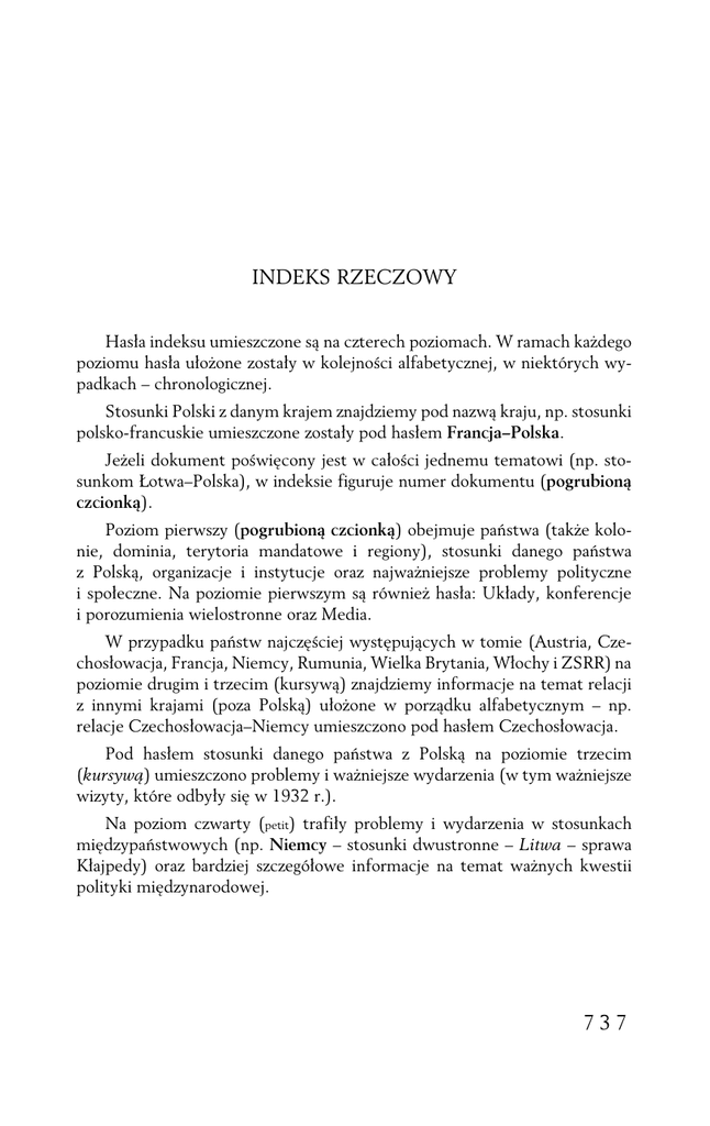 INDEKS RZECZOWY Hasła indeksu umieszczone są na czterech poziomach. W ramach każdego poziomu hasła ułożone zostały w kolejności alfabetycznej, w niektórych wypadkach – chronologicznej. Stosunki Polski z danym krajem znajdziemy pod nazwą kraju, np. stosunki polsko-francuskie umieszczone zostały pod hasłem Francja–Polska. Jeżeli dokument poświęcony jest w całości jednemu tematowi (np. stosunkom Łotwa–Polska), w indeksie figuruje numer dokumentu (pogrubioną czcionką). Poziom pierwszy (pogrubioną czcionką) obejmuje państwa (także kolonie, dominia, terytoria mandatowe i regiony), stosunki danego państwa z Polską, organizacje i instytucje oraz najważniejsze problemy polityczne i społeczne. Na poziomie pierwszym są również hasła: Układy, konferencje i porozumienia wielostronne oraz Media. W przypadku państw najczęściej występujących w tomie (Austria, Czechosłowacja, Francja, Niemcy, Rumunia, Wielka Brytania, Włochy i ZSRR) na poziomie drugim i trzecim (kursywą) znajdziemy informacje na temat relacji z innymi krajami (poza Polską) ułożone w porządku alfabetycznym – np. relacje Czechosłowacja–Niemcy umieszczono pod hasłem Czechosłowacja. Pod hasłem stosunki danego państwa z Polską na poziomie trzecim (kursywą) umieszczono problemy i ważniejsze wydarzenia (w tym ważniejsze wizyty, które odbyły się w 1932 r.). Na poziom czwarty (petit) trafiły problemy i wydarzenia w stosunkach międzypaństwowych (np. Niemcy – stosunki dwustronne – Litwa – sprawa Kłajpedy) oraz bardziej szczegółowe informacje na temat ważnych kwestii polityki międzynarodowej. 737 INDEKS RZECZOWY Afganistan, s. 149 Afryka Południowa – zob. Związek Południowej Afryki Albania, s. 331 Arabia Saudyjska, s. 33410 Argentyna, s. 11, 330, 331 Australia, s. 88, 107, 110, 331, 726 Austria, s. 11, 101, 152, 157, 178, 245, 246, 24627, 247, 250, 253, 272, 273, 275–277, 325, 331, 466, 479, 632 stosunki dwustronne: – Francja, s. 155, 245 – Niemcy, dok. nr 209; s. 68, 6868, 152, 15215, 157, 245, 250, 253, 275, 277, 325, 632 – Węgry, s. 246, 24627 – Wielka Brytania, s. 245 – Włochy, s. 157, 245, 24627 Austria–Polska, s. 178, 272, 273, 331, 646 Azerbejdżan, s. 6985 314, 330–332, 390, 416, 417, 483, 571, 624, 628, 632, 646, 691, 692, 721, 728, 729 stosunki dwustronne: – Francja, s. 36, 221, 222, 253, 628 – Jugosławia, s. 24627 – Niemcy, s. 218–220, 250, 252, 253, 256, 632, 692 – Rumunia, s. 24627, 704 – Węgry, s. 24627 sytuacja wewnętrzna, s. 219, 220 Czechosłowacja–Polska, dok. nr 7, 41, 86, 125, 182, 270; s. 16123, 273 stosunki gospodarcze, dok. nr 270 stosunki wojskowe, dok. nr 7, 41, 86, 182 Dania, s. 101, 227, 331, 344, 382, 38234, 416, 420, 506, 56330, 647, 68428 Dania–Polska, dok. nr 181, 219; s. 331, 647 Dominikana, s. 330 Egipt, s. 204, 2043, 583 Estonia, s. 2627, 59, 5956, 6057, 135, 16123, 173, 188, 195, 330, 429, 732, 291, 624 Belgia, s. 101, 1282, 2765, 314, 330, 331, 377, Etiopia, s. 331 380, 382, 38234, 383, 416, 432, 438, 439, Finlandia, s. 2627, 59, 5956, 6057, 79, 80, 101, 455, 466, 568, 645, 646, 721 135, 136, 16123, 186, 188, 331, 332, 414, 18 Besarabia, s. 20 , 60, 168, 290, 484, 494, 415, 428 518, 524, 550 Finlandia–Polska, dok. nr 177; s. 135, 16123, Boliwia, s. 330, 477, 478 331 wojna o Chaco, dok. nr 208; s. 571 Francja, passim Brazylia, s. 11, 62, 101 polityka zagraniczna, dok. nr 29, 63–65, Bułgaria, s. 11, 148, 150, 161, 16123, 247, 79, 99, 123, 216, 233; s. 30, 31, 54, 155 315, 331, 399, 400, 42010, 555, 556, 569, stosunki dwustronne: 632, 704 – Belgia, s. 380, 383 Bułgaria–Polska, dok. nr 180; s. 161, 16123, 556 Chile, s. 330, 646 Chiny, s. 113, 11325, 127, 1282, 148, 149, 185, 186, 189, 192, 283, 331, 477, 645, 646, 675, 678, 711–713, 723–726 konflikt o Mandżurię, dok. nr 53, 75, 189, 315; s 113, 11325, 147–149, 258, 283, 284, 464, 570, 571, 648, 675, 711–713 Chiny–Polska, s. 149, 331 Czechosłowacja, s. 36, 3640, 4948, 81, 97, 98, 101, 16123, 186, 188, 189, 207, 218–222, 235, 24627, 250, 252, 256, 273, 275, 313, 738 – Japonia, s. 726 – Litwa, s. 733 – Niemcy, dok. nr 17, 93, 109, 118, 145, 165, 169, 175, 220, 228, 233, 235, 312; s. 36, 54, 68, 69, 133, 151–153, 155, 158, 252, 253, 309, 310, 320, 336, 357, 380, 381, 433, 455, 463, 467, 498–500, 519, 521, 522, 591, 596, 597, 632, 607–610, 683, 684, 695, 699, 700 – Rumunia, s. 288, 289, 469–471, 475, 497, 606, 635–638, 649, 657 – Stany Zjednoczone, s. 309, 310, 380, 498–500, 535, 542, 699 – Stolica Apostolska, s. 678 – Turcja, s. 149 – Węgry, s. 246 INDEKS RZECZOWY – Wielka Brytania, dok. nr 188, 195, 200, 202, 265; s. 84, 155, 158, 309, 327, 380, 381, 409, 440, 498, 528, 535, 591, 593, 596, 597, 672, 673, 683, 712 – Włochy, s. 31, 155, 157, 309, 348, 498–500, 620 – Wolne Miasto Gdańsk, s. 35, 265, 269, 292, 325, 573, 612, 683 – ZSRR, dok. nr 8, 67, 264, 313; s. 84, 154, 469, 471, 483–485, 500, 610, 611, 635, 657, 679 – pakt o nieagresji, dok. nr 8, 264, 313; s. 30, 79, 84, 154, 168, 469, 471, 483–485 sytuacja wewnętrzna, dok. nr 132, 160; s. 1110, 30, 31, 3135, 69, 88, 155, 158, 324 zob. Układy, konferencje i porozumienia wielostronne – Międzynarodowa Konferencja Rozbrojeniowa – plan francuski Francja–Polska, dok. nr 12, 37, 56, 58, 63, 65, 79, 92, 93, 113, 133, 134, 137, 142, 203, 206, 211, 212, 259, 273, 285, 296, 303, 313 stosunki gospodarcze, dok. nr 137, 212, 303; s. 30, 85, 154, 155, 237 stosunki polityczne, dok. nr 12, 37, 56, 58, 63, 65, 79, 93, 113, 133, 134, 137, 142, 203, 206, 211, 259, 273, 285, 296, 313; s. 35, 154, 155, 162, 264, 271, 274, 321, 374, 433, 494–496, 511, 527, 537, 557–559, 569, 606, 608, 609, 626, 635, 636, 720, 721, 733 stosunki wojskowe, dok. nr 92, 206; s. 134, 293, 335 – wycofanie misji wojskowych, dok. nr 92, 206; s. 293, 335 Grecja, s. 4948, 148, 150, 188, 247, 330, 331, 399, 400, 466, 555, 556, 696, 698, 725 Grecja–Polska, dok. n