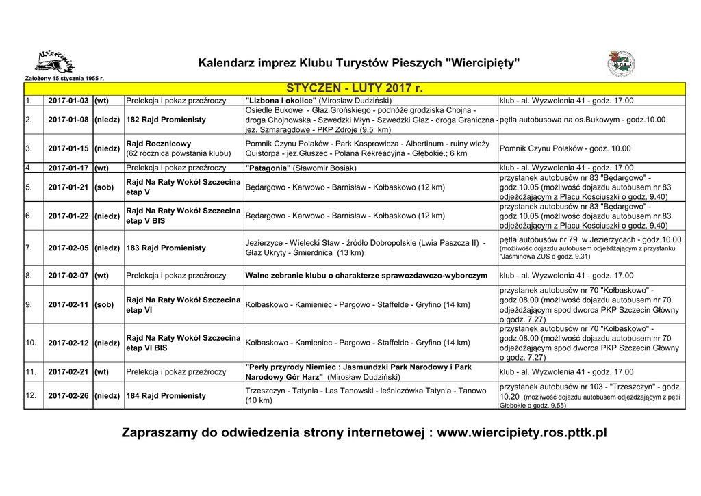 Kalendarz imprez Klubu Turystów Pieszych "Wiercipięty" Założony 15 stycznia 1955 r. STYCZEŃ - LUTY 2017 r. 1. Prelekcja i pokaz przeźroczy 2017-01-03 (wt) klub - al. Wyzwolenia 41 - godz. 17.00 "Lizbona i okolice" (Mirosław Dudziński) Osiedle Bukowe - Głaz Grońskiego - podnóże grodziska Chojna droga Chojnowska - Szwedzki Młyn - Szwedzki Głaz - droga Graniczna - pętla autobusowa na os.Bukowym - godz.10.00 jez. Szmaragdowe - PKP Zdroje (9,5 km) 2. 2017-01-08 (niedz) 182 Rajd Promienisty 3. 2017-01-15 (niedz) Rajd Rocznicowy (62 rocznica powstania klubu) Pomnik Czynu Polaków - Park Kasprowicza - Albertinum - ruiny wieży Quistorpa - jez.Głuszec - Polana Rekreacyjna - Głębokie.; 6 km 4. 2017-01-17 (wt) Prelekcja i pokaz przeźroczy "Patagonia" (Sławomir Bosiak) 5. 2017-01-21 (sob) Rajd Na Raty Wokół Szczecina Będargowo - Karwowo - Barnisław - Kołbaskowo (12 km) etap V 6. 2017-01-22 (niedz) Rajd Na Raty Wokół Szczecina Będargowo - Karwowo - Barnisław - Kołbaskowo (12 km) etap V BIS 7. 2017-02-05 (niedz) 183 Rajd Promienisty 8. 2017-02-07 (wt) Prelekcja i pokaz przeźroczy 9. 2017-02-11 (sob) Rajd Na Raty Wokół Szczecina Kołbaskowo - Kamieniec - Pargowo - Staffelde - Gryfino (14 km) etap VI 10. 2017-02-12 (niedz) Rajd Na Raty Wokół Szczecina Kołbaskowo - Kamieniec - Pargowo - Staffelde - Gryfino (14 km) etap VI BIS 11. 2017-02-21 (wt) Prelekcja i pokaz przeźroczy 12. 2017-02-26 (niedz) 184 Rajd Promienisty Pomnik Czynu Polaków - godz. 10.00 klub - al. Wyzwolenia 41 - godz. 17.00 przystanek autobusów nr 83 "Będargowo" godz.10.05 (możliwość dojazdu autobusem nr 83 odjeżdżąjącym z Placu Kościuszki o godz. 9.40) przystanek autobusów nr 83 "Będargowo" godz.10.05 (możliwość dojazdu autobusem nr 83 odjeżdżąjącym z Placu Kościuszki o godz. 9.40) Jezierzyce - Wielecki Staw - źródło Dobropolskie (Lwia Paszcza II) Głaz Ukryty - Śmierdnica (13 km) pętla autobusów nr 79 w Jezierzycach - godz.10.00 Walne zebranie klubu o charakterze sprawozdawczo-wyborczym klub - al. Wyzwolenia 41 - godz. 17.00 (możliwość dojazdu autobusem odjeżdżającym z przystanku "Jaśminowa ZUS o godz. 9.31) przystanek autobusów nr 70 "Kołbaskowo" godz.08.00 (możliwość dojazdu autobusem nr 70 odjeżdżąjącym spod dworca PKP Szczecin Główny o godz. 7.27) przystanek autobusów nr 70 "Kołbaskowo" godz.08.00 (możliwość dojazdu autobusem nr 70 odjeżdżąjącym spod dworca PKP Szczecin Główny o godz. 7.27) "Perły przyrody Niemiec : Jasmundzki Park Narodowy i Park Narodowy Gór Harz" (Mirosław Dudziński) klub - al. Wyzwolenia 41 - godz. 17.00 Trzeszczyn - Tatynia - Las Tanowski - leśniczówka Tatynia - Tanowo (10 km) przystanek autobusów nr 103 - "Trzeszczyn" - godz. 10.20 (możliwość dojazdu autobusem odjeżdżającym z pętli Głebokie o godz. 9.55) Zapraszamy do odwiedzenia strony internetowej : www.wiercipiety.ros.pttk.pl
