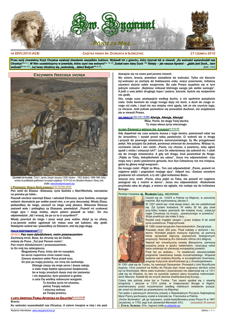 PÓJDŹ ZA MNĄ…« » NR XXVI/2010 (428) GAZETKA PARAFII ŚW. ZYGMUNTA W SŁOMCZYNIE 27 CZERWCA 2010 Przez swój chwalebny Krzyż Chrystus wysłużył zbawienie wszystkim ludziom. Wybawił ich z grzechu, który trzymał ich w niewoli; „Ku wolności wyswobodził nas Chrystus”Ga 5, 1. W Nim uczestniczymy w prawdzie, która czyni nas wolnymiPor. J 8, 32. Został nam dany Duch 782 Święty – jak naucza Apostoł – „gdzie jest Duch… tam wolność”2 Kor 3,17. Już teraz chlubimy się „wolnością… dzieci Bożych”Rz 8, 21. [KKK, 1741] TRZYNASTA NIEDZIELA ZWYKŁA dawajcie się na nowo pod jarzmo niewoli. Wy zatem, bracia, powołani zostaliście do wolności. Tylko nie bierzcie tej wolności za zachętę do hołdowania ciału, wręcz przeciwnie, miłością ożywieni służcie sobie wzajemnie. Bo całe Prawo wypełnia się w tym jednym nakazie: „Będziesz miłował bliźniego swego jak siebie samego”. A jeśli u was jeden drugiego kąsa i pożera, baczcie, byście się wzajemnie nie zjedli. Oto, czego uczę: postępujcie według ducha, a nie spełnicie pożądania ciała. Ciało bowiem do czego innego dąży niż duch, a duch do czego innego niż ciało, i stąd nie ma między nimi zgody, tak że nie czynicie tego, co chcecie. Jeśli jednak pozwolicie się prowadzić duchowi, nie znajdziecie się w niewoli Prawa. AKLAMACJA1 Sm 3,9; J 6,68b Alleluja, Alleluja, Alleluja! Mów, Panie, bo sługa Twój słucha; Ty masz słowa życia wiecznego. SŁOWA EWANGELII WEDŁUG ŚW. ŁUKASZAŁk 9,51-62 CZŁOWIEK ZA PŁUGIEM, TISSOT, James Joseph Jacques (1836, Nantes – 1902, Buillon), 1886-1894, farby wodne na podkładzie grafitowym na szarym papierze, 13.7×13.5 cm, Brooklyn Museum, Nowy Jork; źródło: www.brooklynmuseum.org Z PIERWSZEJ KSIĘGI KRÓLEWSKIEJ1 Krl 19,16b.19-21 Pan rzekł do Eliasza: »Elizeusza, syna Szafata z Abel-Mechola, namaścisz na proroka po tobie«. Poszedł wkrótce stamtąd Eliasz i odnalazł Elizeusza, syna Szafata, orzącego wołami: dwanaście par wołów przed nim, a on przy dwunastej. Wtedy Eliasz, podszedłszy do niego, zarzucił na niego swój płaszcz. Wówczas Elizeusz zostawił woły i pobiegłszy za Eliaszem, powiedział: „Pozwól mi ucałować mego ojca i moją matkę, abym potem poszedł za tobą”. On mu odpowiedział: „Idź i wracaj, bo po co to ci uczyniłem?”. Wtedy powrócił do niego i zaraz wziął parę wołów, złożył ją na ofiarę, a na jarzmie wołów ugotował ich mięso oraz dał ludziom, aby zjedli. Następnie wybrał się i poszedłszy za Eliaszem, stał się jego sługą. PSALM RESPONSORYJNYPs 16 REFREN: Pan mym dziedzictwem, moim przeznaczeniem Zachowaj mnie, Boże, bo chronię się do Ciebie, mówię do Pana: „Tyś jest Panem moim”. Pan moim dziedzictwem i przeznaczeniem, to On mój los zabezpiecza. Błogosławię Pana, który dał mi rozsądek, bo serce napomina mnie nawet nocą. Zawsze stawiam sobie Pana przed oczy, On jest po mojej prawicy, nic mną nie zachwieje. Dlatego cieszy się moje serce i dusza raduje, a ciało moje będzie spoczywać bezpiecznie, bo w kraju zmarłych duszy mej nie zostawisz i nie dopuścisz, bym pozostał w grobie. a usta Cię wielbią radosnymi wargami. Ty ścieżkę życia mi ukażesz, pełnię Twojej radości i wieczną rozkosz po Twojej prawicy. Z LISTU ŚWIĘTEGO PAWŁA APOSTOŁA DO GALATÓWGa 5,1.13-18 Bracia: Ku wolności wyswobodził nas Chrystus. A zatem trwajcie w niej i nie podWydanie internetowe: www.swzygmunt.knc.pl Gdy dopełniał się czas wzięcia Jezusa z tego świata, postanowił udać się do Jerozolimy i wysłał przed sobą posłańców. Ci wybrali się w drogę i przyszli do pewnego miasteczka samarytańskiego, by Mu przygotować pobyt. Nie przyjęto Go jednak, ponieważ zmierzał do Jerozolimy. Widząc to, uczniowie Jakub i Jan rzekli: „Panie, czy chcesz, a powiemy, żeby ogień spadł z nieba i zniszczył ich?”. Lecz On odwróciwszy się zabronił im. I udali się do innego miasteczka. A gdy szli drogą, ktoś powiedział do Niego: „Pójdę za Tobą, dokądkolwiek się udasz”. Jezus mu odpowiedział: »Lisy mają nory i ptaki powietrzne gniazda, lecz Syn Człowieczy nie ma miejsca, gdzie by głowę mógł wesprzeć«. Do innego rzekł: »Pójdź za Mną«. Ten zaś odpowiedział: „Panie, pozwól mi najpierw pójść i pogrzebać mojego ojca”. Odparł mu: »Zostaw umarłym grzebanie ich umarłych, a ty idź i głoś królestwo Boże«. Jeszcze inny rzekł: „Panie, chcę pójść za Tobą, ale pozwól mi najpierw pożegnać się z moimi w domu”. Jezus mu odpowiedział: »Ktokolwiek przykłada rękę do pługa, a wstecz się ogląda, nie nadaje się do królestwa Bożego«. PATRON TYGODNIA: BŁ. RAJMUND LULL, MĘCZENNIK Urodził się ok. 1232/5 w Palmie na Majorce, w zamożnej rodzinie. Był wychowawcą Jakuba II. W 1257 ożenił się i miał dwoje dzieci, ale nie ustabilizował się. Żył życiem trubadura. W wieku 30 lat, gdy pisał przy łóżku kolejny poemacik dla kolejnej muzy, zobaczył nagle Chrystusa na krzyżu, „zawieszonego w powietrzu”. Wizja powtórzyć się miała 5 razy… Rozdał swój majątek ubogim i przez kolejne 9 lat wiódł życie pustelnicze. Pielgrzymował. W 1265 został tercjarzem franciszkańskim. Zaczął pisać… Powstało około 300 prac. Pisał traktaty o alchemii i botanice. Wynalazł pojęcie maszyny logicznej, za pomocą której sprawdzał logiczną poprawność teologicznych propozycji. Nazwał ją Ars Generalis Ultima (Ars Magna). Napisał też romantyczną nowelę Blanquerna, pierwszą poważną pracę w języku katalońskim, roszczącą sobie także pretensje do pierwszej europejskiej powieści. Pisał też po arabsku… Ta działalność odzwierciedlała pragnienie nawrócenia świata muzułmańskiego. Wspierał badania nad arabską filozofią, w szczególności Averroesa, pragnąć krytycznie skonfrontować ją z chrześcijaństwem. W 1291 udał się do Tunisu, by nawracać Saracenów. Prowadził z ni