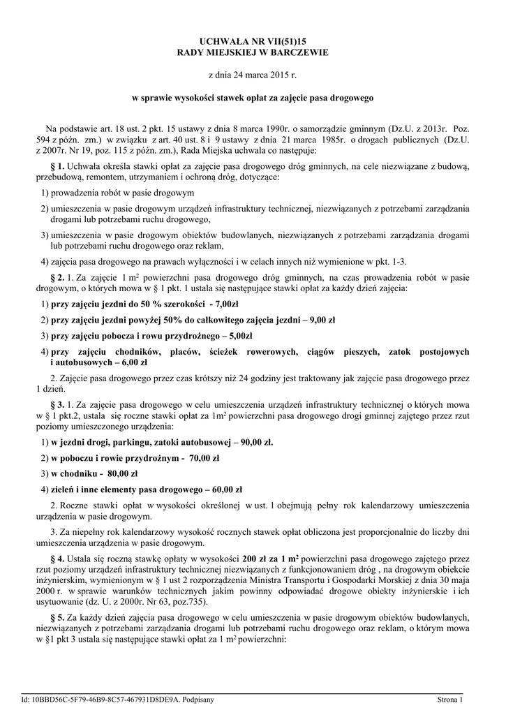 UCHWAŁA NR VII(51)15 RADY MIEJSKIEJ W BARCZEWIE z dnia 24 marca 2015 r. w sprawie wysokości stawek opłat za zajęcie pasa drogowego Na podstawie art. 18 ust. 2 pkt. 15 ustawy z dnia 8 marca 1990r. o samorządzie gminnym (Dz.U. z 2013r. Poz. 594 z późn. zm.) w związku z art. 40 ust. 8 i 9 ustawy z dnia 21 marca 1985r. o drogach publicznych (Dz.U. z 2007r. Nr 19, poz. 115 z późn. zm.), Rada Miejska uchwala co następuje: § 1. Uchwała określa stawki opłat za zajęcie pasa drogowego dróg gminnych, na cele niezwiązane z budową, przebudową, remontem, utrzymaniem i ochroną dróg, dotyczące: 1) prowadzenia robót w pasie drogowym 2) umieszczenia w pasie drogowym urządzeń infrastruktury technicznej, niezwiązanych z potrzebami zarządzania drogami lub potrzebami ruchu drogowego, 3) umieszczenia w pasie drogowym obiektów budowlanych, niezwiązanych z potrzebami zarządzania drogami lub potrzebami ruchu drogowego oraz reklam, 4) zajęcia pasa drogowego na prawach wyłączności i w celach innych niż wymienione w pkt. 1-3. § 2. 1. Za zajęcie 1 m2 powierzchni pasa drogowego dróg gminnych, na czas prowadzenia robót w pasie drogowym, o których mowa w § 1 pkt. 1 ustala się następujące stawki opłat za każdy dzień zajęcia: 1) przy zajęciu jezdni do 50 % szerokości - 7,00zł 2) przy zajęciu jezdni powyżej 50% do całkowitego zajęcia jezdni – 9,00 zł 3) przy zajęciu pobocza i rowu przydrożnego – 5,00zł 4) przy zajęciu chodników, placów, ścieżek rowerowych, ciągów pieszych, zatok postojowych i autobusowych – 6,00 zł 2. Zajęcie pasa drogowego przez czas krótszy niż 24 godziny jest traktowany jak zajęcie pasa drogowego przez 1 dzień. § 3. 1. Za zajęcie pasa drogowego w celu umieszczenia urządzeń infrastruktury technicznej o których mowa w § 1 pkt.2, ustala się roczne stawki opłat za 1m2 powierzchni pasa drogowego drogi gminnej zajętego przez rzut poziomy umieszczonego urządzenia: 1) w jezdni drogi, parkingu, zatoki autobusowej – 90,00 zł. 2) w poboczu i rowie przydrożnym - 70,00 zł 3) w chodniku - 80,00 zł 4) zieleń i inne elementy pasa drogowego – 60,00 zł 2. Roczne stawki opłat w wysokości określonej w ust. 1 obejmują pełny rok kalendarzowy umieszczenia urządzenia w pasie drogowym. 3. Za niepełny rok kalendarzowy wysokość rocznych stawek opłat obliczona jest proporcjonalnie do liczby dni umieszczenia urządzenia w pasie drogowym. § 4. Ustala się roczną stawkę opłaty w wysokości 200 zł za 1 m2 powierzchni pasa drogowego zajętego przez rzut poziomy urządzeń infrastruktury technicznej niezwiązanych z funkcjonowaniem dróg , na drogowym obiekcie inżynierskim, wymienionym w § 1 ust 2 rozporządzenia Ministra Transportu i Gospodarki Morskiej z dnia 30 maja 2000 r. w sprawie warunków technicznych jakim powinny odpowiadać drogowe obiekty inżynierskie i ich usytuowanie (dz. U. z 2000r. Nr 63, poz.735). § 5. Za każdy dzień zajęcia pasa drogowego w celu umieszczenia w pasie drogowym obiektów budowlanych, niezwiązanych z potrzebami zarządzania drogami lub potrzebami ruchu drogowego oraz reklam, o którym mowa w §1 pkt 3 ustala się następujące stawki opłat za 1 m2 powierzchni: Id: 10BBD56C-5F79-46B9-8C57-467931D8DE9A. Podpisany Strona 1 1) pasa drogowego zajętego przez rzut poziomy obiektu budowlanego (handlowego lub usługowego) w wysokości - 0,30 zł 2) pasa drogowego zajętego przez rzut poziomy innych obiektów budowlanych (wiaty, schody), w wysokości 0,20 zł 3) umieszczenie reklamy w wysokości - 1,30 zł § 6. Za zajęcie pasa drogowego, o którym mowa w § 1 pkt 4, ustala się następujące stawki opłat za każdy dzień zajęcia 1 m2 powierzchni na: 1) ogródki gastronomiczne, handlowe i usługowe – 0,50 zł 2) stragany nie będące obiektami budowlanymi i inne urządzenia eksponujące towar – 2,50 zł inne nie wymienione w pkt 1-2 pozwalające na korzystanie z pasa drogowego na prawach wyłączności - 2,00 zł . § 7. 1. Przy umieszczaniu urządzeń i sieci wodociągowej i kanalizacyjnej stosuje się obniżone stawki w wysokości 50% opłat określonych w § 3 i § 4. 2. Przy umieszczaniu urządzeń, obiektów i sieci telekomunikacyjnej stosuje się obniżone stawki w wysokości 10% opłat określonych w § 3 i § 4. § 8. Nie pobiera się opłat: 1) Za zajęcie pasa drogowego na reklamę imprez organizowanych przez Gminę Barczewo i jej jednostki organizacyjne. 2) Za posadowienie w pasie drogowym urządzeń i przyłączy wodociągowych kanalizacyjnych, przekazanych do eksploatacji Zakładowi Wodociągów i Kanalizacji w Barczewie oraz w przypadku inwestycji realizowanych przez gminę Barczewo i jej jednostki organizacyjne. § 9. Wykonanie uchwały powierza się Burmistrzowi Barczewa . § 10. Traci moc uchwała nr IX(67)2011 Rady Miejskiej w Barczewie z dnia 30 maja 2011roku w sprawie wysokości stawek opłat za zajęcie pasa drogowego dróg gminnych. § 11. Uchwała wchodzi w życie po upływie 14 dni od ogłoszenia w Dzienniku Urzędowym Województwa Warmińsko-Mazurskiego. Przewodniczący Rady Miejskiej Andrzej Maciejewski Id: 10BBD56C-5F79-46B9-8C57-467931D8DE9A. Podpisany Strona 2