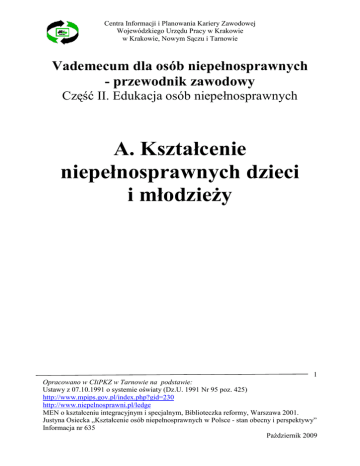 Centra Informacji i Planowania Kariery Zawodowej Wojewódzkiego Urzędu Pracy w Krakowie w Krakowie, Nowym Sączu i Tarnowie Vademecum dla osób niepełnosprawnych - przewodnik zawodowy Część II. Edukacja osób niepełnosprawnych A. Kształcenie niepełnosprawnych dzieci i młodzieŜy 1 Opracowano w CIiPKZ w Tarnowie na podstawie: Ustawy z 07.10.1991 o systemie oświaty (Dz.U. 1991 Nr 95 poz. 425) http://www.mpips.gov.pl/index.php?gid=230 http://www.niepelnosprawni.pl/ledge MEN o kształceniu integracyjnym i specjalnym, Biblioteczka reformy, Warszawa 2001. Justyna Osiecka „Kształcenie osób niepełnosprawnych w Polsce - stan obecny i perspektywy” Informacja nr 635 Październik 2009 Centra Informacji i Planowania Kariery Zawodowej Wojewódzkiego Urzędu Pracy w Krakowie w Krakowie, Nowym Sączu i Tarnowie SPIS TREŚCI:………………………………………………………2 A. Kształcenie niepełnosprawnych dzieci i młodzieŜy Edukacja szkolna osób niepełnosprawnych……………………………….…….…..3 Dziecko niepełnosprawne a integracja……………………………………….………4 Prawa niepełnosprawnych uczniów………………………………………………….7 2 Opracowano w CIiPKZ w Tarnowie na podstawie: Ustawy z 07.10.1991 o systemie oświaty (Dz.U. 1991 Nr 95 poz. 425) http://www.mpips.gov.pl/index.php?gid=230 http://www.niepelnosprawni.pl/ledge MEN o kształceniu integracyjnym i specjalnym, Biblioteczka reformy, Warszawa 2001. Justyna Osiecka „Kształcenie osób niepełnosprawnych w Polsce - stan obecny i perspektywy” Informacja nr 635 Październik 2009 Centra Informacji i Planowania Kariery Zawodowej Wojewódzkiego Urzędu Pracy w Krakowie w Krakowie, Nowym Sączu i Tarnowie Edukacja szkolna osób niepełnosprawnych KaŜde dziecko, takŜe niepełnosprawne, ma prawo do nauki Zapewnia to Konstytucja RP (art. 70), jak równieŜ kilka aktów prawnych, w tym Ustawa z dn. 7 września 1991 r. o systemie oświaty . Do kształcenia specjalnego i integracyjnego kwalifikują dzieci niepełnosprawne uprawnione do tego Zespoły Orzekające Poradni Psychologiczno - Pedagogicznych ( PPP ) Korzystanie z pomocy PPP jest dobrowolne i nieodpłatne. W poradni moŜna skonsultować wybór formy kształcenia najlepszej dla dziecka, ale ostateczna decyzja o wyborze odpowiedniej metody nauki oraz rodzaju szkoły naleŜy do rodziców lub opiekunów dziecka. Przedszkole Dzieci niepełnosprawne objęte są wychowaniem przedszkolnym od 3 do 6 lat, a w wieku 6 lat mają prawo do rocznego przygotowania przedszkolnego (tzw. "zerówka"). Pobyt w przedszkolu przedłuŜyć się moŜe do 10 roku Ŝycia, jeŜeli dziecko ma orzeczenie PPP. Do przedszkoli publicznych w pierwszej kolejności powinny być przyjęte m.in. dzieci matek z I lub II grupą inwalidzką oraz dzieci matek lub ojców samotnych. Szkoła podstawowa i gimnazjum Obowiązek szkolny dziecka rozpoczyna się z początkiem roku szkolnego, w tym roku kalendarzowym, w którym kończy ono 7 lat oraz trwa (od 1 września 1999 r. zgodnie z reformą oświatową) do ukończenia gimnazjum, nie dłuŜej jednak niŜ do ukończenia 18 lat. Uczniowie niepełnosprawni mogą kontynuować naukę w szkole podstawowej specjalnej do ukończenia 21 lat, a w szkole ponadpodstawowej specjalnej do jej ukończenia, ale nie dłuŜej niŜ do ukończenia 24 lat. Za spełnienie obowiązku szkolnego uznaje się równieŜ udział dzieci i młodzieŜy w zajęciach rewalidacyjno - wychowawczych. Rodzice mają obowiązek: Zgłosić dziecko do szkoły, zapewnić regularne uczęszczanie na zajęcia (pamiętajmy, Ŝe gmina ma obowiązek zapewnić bezpłatny transport i opiekę w czasie przewozu dzieci niepełnosprawnych, uczęszczających do publicznych szkół podstawowych i gimnazjów). Jeśli rodzice nie spełnią obowiązku szkolnego lub obowiązku nauki, grozi im kara pienięŜna. 3 Opracowano w CIiPKZ w Tarnowie na podstawie: Ustawy z 07.10.1991 o systemie oświaty (Dz.U. 1991 Nr 95 poz. 425) http://www.mpips.gov.pl/index.php?gid=230 http://www.niepelnosprawni.pl/ledge MEN o kształceniu integracyjnym i specjalnym, Biblioteczka reformy, Warszawa 2001. Justyna Osiecka „Kształcenie osób niepełnosprawnych w Polsce - stan obecny i perspektywy” Informacja nr 635 Październik 2009 Centra Informacji i Planowania Kariery Zawodowej Wojewódzkiego Urzędu Pracy w Krakowie w Krakowie, Nowym Sączu i Tarnowie Dla dzieci niepełnosprawnych organizowane są klasy i szkoły specjalne lub integracyjne w szkołach podstawowych (od września 1999 r. takŜe w gimnazjach) oraz szkoły zawodowe, przygotowujące do zawodu i licea profilowane. Dziecko np. niepełnosprawne ruchowo, przewlekle chore moŜe pobierać naukę w ramach nauczania indywidualnego - w miejscu pobytu, chociaŜ nie jest to forma popierana przez psychologów, poniewaŜ izoluje dziecko od rówieśników. Przeciwwagą jest nauczanie integracyjne, które zapewnia kontakt z innymi dziećmi. Po informacje dotyczące placówek integracyjnych, moŜna zgłaszać się do kuratoriów w całym kraju. Preferencje wobec dzieci niepełnosprawnych: 1. Niepełnosprawność uczniów (z wyjątkiem uczniów szkół specjalnych dla dzieci upośledzonych w stopniu umiarkowanym i znacznym) jest uwzględniana, gdy: - uczeń z deficytami rozwojowymi nie moŜe sprostać wymaganiom programowym - moŜna obniŜyć wymagania w zakresie wiedzy z danego przedmiotu; - uczeń jest w złej kondycji fizycznej, psychicznej - moŜe być zwolniony z wychowania fizycznego, plastyki, techniki, muzyki; - uczeń jest niedosłyszący - moŜe być zwolniony z nauki jednego języka obcego. 2. Absolwenci niepełnosprawni przystępują do egzaminu w powszechnie obowiązującym terminie. Jednak w uzasadnionych przypadkach przewodniczący komisji moŜe wyrazić zgodę na egzaminy pisemne i ustne w wydzielonej sali lub w domu absolwenta, ustalając sposób przeprowadzania egzaminów odpowiednio do moŜliwości mówieni