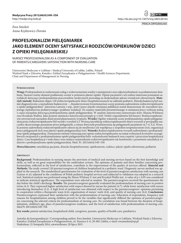 Medycyna Pracy 2015;66(4):549–556 http://medpr.imp.lodz.pl http://dx.doi.org/10.13075/mp.5893.00165 Ewa Smoleń Anna Ksykiewicz-Dorota PRACA ORYGINALNA PROFESJONALIZM PIELĘGNIAREK JAKO ELEMENT OCENY SATYSFAKCJI RODZICÓW/OPIEKUNÓW DZIECI Z OPIEKI PIELĘGNIARSKIEJ NURSES’ PROFESSIONALISM AS A COMPONENT OF EVALUATION OF PARENTS/CAREGIVERS SATISFACTION WITH NURSING CARE Uniwersytet Medyczny w Lublinie / Medical University of Lublin, Lublin, Poland Wydział Nauk o Zdrowiu, Katedra i Zakład Zarządzania w Pielęgniarstwie / Health Sciences Department, Chair and Department of Management in Nursing Streszczenie Wstęp: Profesjonalizm to realizowanie usług z wykorzystaniem wiedzy i umiejętności oraz odpowiedzialność za podejmowane działania. Stanowi ważny element poddawany ocenie w pomiarze jakości opieki. Opinie pacjentów i ich rodzin (mierzone poziomem satysfakcji) dotyczące profesjonalizmu pracowników medycznych pozwalają na doskonalenie jakości świadczeń zdrowotnych. Materiał i metody: Badaniem objęto 120 rodziców/opiekunów dzieci hospitalizowanych na oddziale pediatrii. Metodą badawczą był sondaż diagnostyczny, a narzędziem badawczym – „Standaryzowany kwestionariusz oceny poziomu zadowolenia rodziców/opiekunów z opieki pielęgniarskiej” autorstwa Latoura i wsp., który przez autorki niniejszej publikacji został dostosowany do warunków krajowego szpitalnictwa pediatrycznego i poddany walidacji. Do analizy materiału prezentowanego w niniejszej pracy wybrano jedną z części narzędzia dotyczącą profesjonalizmu opieki pielęgniarskiej. W analizie statystycznej zastosowano testy: Manna-Whitneya oraz Kruskala-Wallisa. Jako poziom istotności statystycznej przyjęto p ≤ 0,05. Dobór respondentów był losowy. Rodzice/opiekunowie otrzymywali narzędzie dzień przed planowanym wypisem. Wyniki: Ogólny wskaźnik oceny profesjonalizmu opieki pielęgniarskiej przez rodziców/opiekunów był wysoki i wyniósł 4,3. Wyższą satysfakcję rodzice/opiekunowie dzieci wyrazili w przypadku szacunku okazywanego pacjentom przez pielęgniarki, a niższa dotyczyła przedstawiania się pielęgniarek pacjentom (4,7 vs 3,2). Wysoki poziom zadowolenia rodziców/opiekunów odnosi się do możliwości ich współpracy z zespołem terapeutycznym (4,6), organizacji pracy pielęgniarek (4,6) oraz jakości opieki pielęgniarskiej (4,6). Wnioski: Rodzice/opiekunowie wyrazili zadowolenie z profesjonalizmu opieki pielęgniarskiej. Zmiennymi istotnie różnicującymi opinie rodziców/opiekunów na temat wybranych kryteriów szczegółowych związanych z profesjonalizmem opieki pielęgniarskiej były: wykształcenie badanych oraz częstość i przyczyna hospitalizacji dzieci. Czas hospitalizacji i wiek dzieci oraz miejsce zamieszkania rodziców/opiekunów nie korelowały z poziomem satysfakcji rodziców z profesjonalizmu opieki pielęgniarskiej. Med. Pr. 2015;66(4):549–556 Słowa kluczowe: satysfakcja pacjenta, dziecko hospitalizowane, opiekunowie, rodzice, jakość opieki zdrowotnej, pediatria Abstract Background: Professionalism in nursing means the provision of medical and nursing services based on the best knowledge and skills, as well as on great responsibility for the undertaken actions. The opinions of patients and their families concerning professionalism, reflected in the level of satisfaction, contribute to the improvement of the quality of services offered. Material and Methods: The study covered 120 parents/caregivers of children hospitalized in a pediatric ward. Diagnostic survey method was applied in the research. The standardized questionnaire for evaluation of the level of parents/caregivers satisfaction with nursing care (Latour et al.) adjusted to the conditions of Polish pediatric hospital services and subjected to validation was adopted as a research tool. Statistical analysis was performed using the Mann-Whitney U test and Kruskal-Wallis test. A value of p ≤ 0.05 was considered to indicate statistical significance. The respondents were selected at random. The parents/caregivers received the questionnaire the day before the child’s discharge. Results: The parents/caregivers generally evaluated the professionalism of nursing care in positive terms (4.3). They expressed higher satisfaction with respect showed by nurses for patients (4.7), while lower satisfaction with nurses introducing themselves (3.2). A high level of satisfaction was obtained with respect to the parents/caregivers’ opinions pertaining to cooperation within a therapeutic team (4.6), organization of nurses’ work (4.6), and quality of nursing care (4.6). Conclusions: Parents/caregivers expressed their satisfaction with the professionalism of nursing care. Education of respondents, frequency and reasons for hospitalization among children proved to be the variables that significantly differed the opinions of parents/caregivers concerning the selected criteria for professionalism of nursing care. No correlation was found between the duration of hospitalization, children’s age, place of parents/caregivers residence, and the level of satisfaction with professionalism of nursing care. Med Pr 2015;66(4):549–556 Key words: patient satisfaction, hospitalized child, caregivers, parents, quality of health care, paediatrics Autorka do korespondencji / Corresponding author: Ewa Smoleń, Uniwersytet Medyczny w Lublinie, Wydział Nauk o Zdrowiu, Katedra i Zakład Zarządzania w Pielęgniarstwie, ul. Staszica 4–6, 20-081 Lublin, e-mail: [email protected] Nadesłano: 21 listopada 2014, zatwierdzono: 20 lipca 2015 550 E. Smoleń, A. Ksykiewicz-Dorota Nr 4 WSTĘP MATERIAŁ I METODY System ochrony zdrowia w Polsce podlega transformacji od ponad 2 dekad [1]. Zmieniają się potrzeby odbiorców usług, z czego wynikają coraz wyższe wymagania wobec świadczeniodawców. Zarządzający zakładami opieki zdrowotnej dążą do zapewnienia większej sprawności i efektywności pracy w instytucjach medyczny