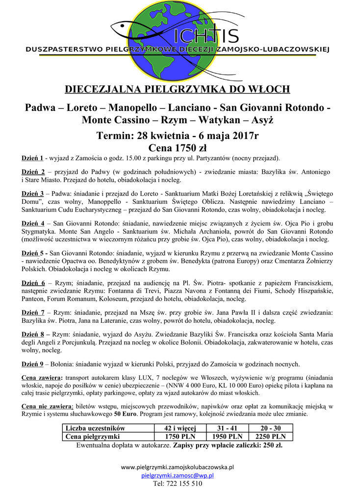 DIECEZJALNA PIELGRZYMKA DO WŁOCH Padwa – Loreto – Manopello – Lanciano - San Giovanni Rotondo Monte Cassino – Rzym – Watykan – Asyż Termin: 28 kwietnia - 6 maja 2017r Cena 1750 zł Dzień 1 - wyjazd z Zamościa o godz. 15.00 z parkingu przy ul. Partyzantów (nocny przejazd). Dzień 2 – przyjazd do Padwy (w godzinach południowych) - zwiedzanie miasta: Bazylika św. Antoniego i Stare Miasto. Przejazd do hotelu, obiadokolacja i nocleg. Dzień 3 – Padwa: śniadanie i przejazd do Loreto - Sanktuarium Matki Bożej Loretańskiej z relikwią „Świętego Domu”, czas wolny, Manoppello - Sanktuarium Świętego Oblicza. Następnie nawiedzimy Lanciano – Sanktuarium Cudu Eucharystyczneg – przejazd do San Giovanni Rotondo, czas wolny, obiadokolacja i nocleg. Dzień 4 – San Giovanni Rotondo: śniadanie, nawiedzenie miejsc związanych z życiem św. Ojca Pio i grobu Stygmatyka. Monte San Angelo - Sanktuarium św. Michała Archanioła, powrót do San Giovanni Rotondo (możliwość uczestnictwa w wieczornym różańcu przy grobie św. Ojca Pio), czas wolny, obiadokolacja i nocleg. Dzień 5 - San Giovanni Rotondo: śniadanie, wyjazd w kierunku Rzymu z przerwą na zwiedzanie Monte Cassino - nawiedzenie Opactwa oo. Benedyktynów z grobem św. Benedykta (patrona Europy) oraz Cmentarza Żołnierzy Polskich. Obiadokolacja i nocleg w okolicach Rzymu. Dzień 6 – Rzym; śniadanie, przejazd na audiencję na Pl. Św. Piotra- spotkanie z papieżem Franciszkiem, następnie zwiedzanie Rzymu: Fontanna di Trevi, Piazza Navona z Fontanną dei Fiumi, Schody Hiszpańskie, Panteon, Forum Romanum, Koloseum, przejazd do hotelu, obiadokolacja, nocleg. Dzień 7 – Rzym: śniadanie, przejazd na Mszę św. przy grobie św. Jana Pawła II i dalsza część zwiedzania: Bazylika św. Piotra, Jana na Lateranie, czas wolny, powrót do hotelu, obiadokolacja, nocleg. Dzień 8 – Rzym: śniadanie, wyjazd do Asyżu. Zwiedzanie Bazyliki Św. Franciszka oraz kościoła Santa Maria degli Angeli z Porcjunkulą. Przejazd na nocleg w okolice Bolonii. Obiadokolacja, zakwaterowanie w hotelu, czas wolny, nocleg. Dzień 9 – Bolonia: śniadanie wyjazd w kierunki Polski, przyjazd do Zamościa w godzinach nocnych. Cena zawiera: transport autokarem klasy LUX, 7 noclegów we Włoszech, wyżywienie w/g programu (śniadania włoskie, napoje do posiłków w cenie) ubezpieczenie – (NNW 4 000 Euro, KL 10 000 Euro) opiekę pilota i kapłana na całej trasie pielgrzymki, opłaty parkingowe, opłaty za wjazd autokarów do miast włoskich. Cena nie zawiera: biletów wstępu, miejscowych przewodników, napiwków oraz opłat za komunikację miejską w Rzymie i systemu słuchawkowego 50 Euro. Program jest ramowy, kolejność zwiedzania może ulec zmianie. Liczba uczestników 42 i więcej 31 - 41 20 - 30 Cena pielgrzymki 1750 PLN 1950 PLN 2250 PLN Ewentualna dopłata w autokarze. Zapisy przy wpłacie zaliczki: 250 zł. www.pielgrzymki.zamojskolubaczowska.pl [email protected] Tel: 722 155 510