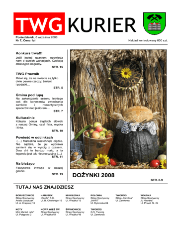 Ŝ TWG KURIER Poniedziałek, 8 września 2008 Nr 7, Cena 1zł Nakład kontrolowany 600 szt. Konkurs trwa!!! Jeśli jesteś uczniem, opowiedz nam o swoich wakacjach. Czekają atrakcyjne nagrody. STR. 15 TWG Prawnik Mówi się, Ŝe na świecie są tylko dwie pewne rzeczy: śmierć i podatki… STR. 5 Gmina pod lupą Na zakończenie sezonu letniego coś dla koneserów zwiedzania zamków i romantycznych spacerów nad jeziorem… STR. 7 Kulturalnie Kolejna porcja śląskich słówek z naszej Gminy, czyli fiśla, mycka i tinta. STR. 10 Powieść w odcinkach (…) Marcelina westchnęła cięŜko. Nie sądziła, Ŝe jej wyprawa zamieni się w wyścig z czasem. Dwa dni to bardzo mało, a ta legenda jest tak nieprecyzyjna (…) STR. 11 Na bieŜąco Festynowa gminie. inwazja w naszej STR. 13 DOśYNKI 2008 STR. 8-9 TUTAJ NAS ZNAJDZIESZ BORUSZOWICE Sklep SpoŜywczy Aniela Lukoszek Ul. A. Krajowej 13 HANUSEK „DŜelfa” S.C. Ul. B. Chrobrego 16 MIKOŁESKA Sklep SpoŜywczy Ul. Wiejska 13 POŁOMIA Sklep SpoŜywczy „MART” Ul. Bytomska 64 KOTY Mini Market „Mix” Ul. Potępska 2 NOWA WIEŚ TW. Sklep SpoŜywczy Ul. Wiejska 61 ŚWINIOWICE Sklep SpoŜywczy Ul. Wiejska 48 TWORÓG G.S. Tworóg Ul. Zamkowa TWORÓG Sklep „Karolina” Ul. Zamkowa WOJSKA Sklep SpoŜywczy „U Nowaka” Ul. Powst. Śl. 64 TWG KURIER WSTĘPNIAK Spis treści Od redakcji LISTONOSZ……………….…………..……………..s.3 Drodzy Mieszkańcy! W tym numerze Kuriera znajdziecie przede wszystkim relacje z imprez, które w sierpniu królowały w naszych sołectwach. SESJA…………………....…………………………...s.4 PRAWNIK…………...………………………………..s.5 - Spadek i dziedziczenie cd. Miłośnikom podniebnych akrobacji polecamy wrześniowego „Hobbystę”, a w nim pasję rodziny Jonecko z Tworoga. HOBBYSTA…………………………………………..s.6 - „Jak malowany ptak” Czekają na was takŜe, kolejne przygody Marceliny Grambli w drugiej części opowiadania Ady Kroll „Kufer”. Serwujemy równieŜ następną porcję wyrazów śląskich w naszym słowniku „TWG po śląsku”. Dla zainteresowanych problemami prawniczymi przygotowaliśmy ciąg dalszy porad na temat dziedziczenia i spadku. GMINA POD LUPĄ………………………………….s.7 - Rowerem na zakończenie sezonu KULTURALNIE………………………………………s.8 - DoŜynki 2008 za nami - Nowy zamek - TWG po Śląsku - „Kufer”, cz.2 - TWG Kurier poleca Z okazji nowego roku szkolnego uczniom naszej gminy Ŝyczymy dobrych ocen i zapału - byle nie słomianego! Zapraszamy was równieŜ do wzięcia udziału w konkursie (szczegóły strona 15). Dyrektorom, nauczycielom i wychowawcom Ŝyczymy owocnej pracy, cierpliwości i nie sprawiających problemów podopiecznych. NA BIEśĄCO…………………………...………......s.13 - Chcesz zagrać w tenisa? Wybierz się do Wojski - Festyn rodzinny w Boruszowicach - Samochód straŜacki - Krioterapia w Ośrodku Zdrowia w Tworogu - Rewizyta w Kozakowicach - Konkurs trwa! www.twgkurier.pl [email protected] SPORT………………………………….……………s.16 - To my chłopcy z Górnika! Zna nas cała liga! Redakcja Agata Ziaja – Redaktor naczelny GraŜyna Chmiel – Redaktor kulturalny Damian Potempa – Redaktor sportowy Marcin Musioł – Dziennikarz terenowy / Fotoreporter Łukasz Frączek – Redaktor prawny Kreacja Łukasz Krain – Dyrektor kreatywny Mecenat GraŜyna Chmiel – Dyrektor Gminnego Ośrodka Kultury Gościnnie Mateusz Kościelny, Fryderyk Zgadzaj, Łukasz Ziob Wydawca Gminny Ośrodek Kultury w Tworogu, ul. Zamkowa 1, 42-690 Tworóg, tel. (32) 285 74 92 Druk TextPartner 2 TWG KURIER LISTONOSZ Co miesiąc „Kurier” w naszych chałpach gości, sprawio łon nom zawsze duŜo radości. JuŜ łod pora miesiyncy króluje, ło wszystkim co cza nos informuje. Co nom nasza Gminno Rada uradzi, bo przeca łona wszystko poradzi. Co sie w naszych wsiach dzieje? Ftoro fojerwera lepij woda leje? Fto wiencyj trefi do bramy, co w bala grajom? Kaj się lepiej bawiom i śpewajom? Wiymy tyŜ łod kogo ptoki sie ścigajom, za te furganie jakie gyszynki dostajom. Kaj we gminie co stare, ło to dbomy, co piyrwyj boło - łopisane momy. Jak nosz Bank nos fajnie łobsuguje, pomogo, jak piniyndzy nom brakuje. Ło tym, Ŝe nikaj jechać nie muszymy, bo we Gminie sie leczymy. Jak ftoś od nos zachoruje abo sie źle czuje, pomoc ze ośrodka zdrowia wartko przylatuje. Kaj we gminie łodpocząć sie mogymy, ło wszystkim we „Kurierze” sie dowiymy. Po śląsku tyŜ trocha pogodomy, bo przeca naszo godka momy. Za to, Ŝe ło wszystkim sie dowiadujymy całej radakcyji za ta robota dziynkujymy. Irena Jonecko R E K L A M --W związku z tym, Ŝe w liście do redakcji w ostatnim numerze gazety zostało wymienione moje nazwisko, chciałbym się ustosunkować do wątpliwości co do daty załoŜenia OSP Świniowice i braku informacji o działalności OSP na przestrzeni lat. Próbowałem się skontaktować ze wszystkimi ludźmi w kraju i za granicą, którzy mieli coś wspólnego z OSP w Świniowicach, i niczego konkretnego się nie dowiedziałem. To, Ŝe moja mama była straŜaczką wiem z przekazu rodzinnego (od mamy). śyczę Pani Irenie Weintritt owocnych poszukiwań, moŜe będzie miała więcej szczęścia niŜ ja. Natomiast co do daty załoŜenia, posiadam stosowny dokument pochodzący z archiwum, w którym są zdeponowane wszystkie materiały dotyczące działalności StraŜy PoŜarnej w Świniowicach w czasach jej załoŜeniach. Kopię dokumentu oraz jego tłumaczenie dołączam do listu. Fryderyk Zgodzaj A tłumaczenie: Statut Dla gmin Wielowieś, Świniowice, Czarków, Odmuchów oraz majątków rolnych tych miejscowości powiatu toszecko – gliwickiego powstałych Związków Sikawkowych. (...) Wielowieś dni 11 lutego 1888r. Zarząd Związku Sikawkowego (11 podpisów) 3 TWG KURIER NIEZBĘDNIK GMINY SESJA Pod uwagę mogą być równieŜ