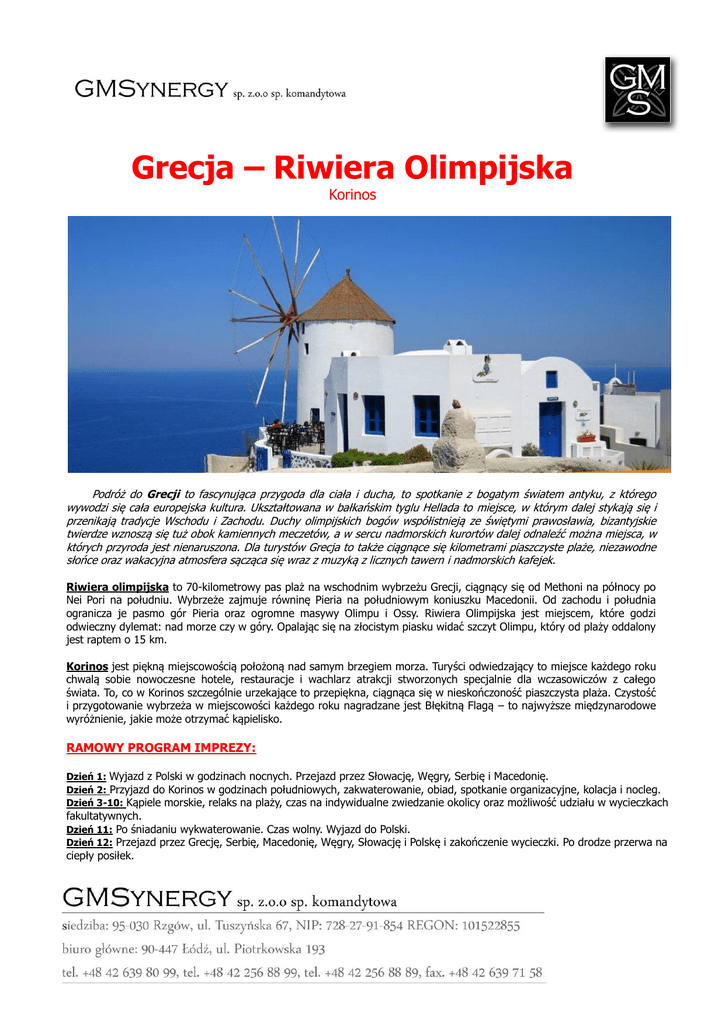 Grecja – Riwiera Olimpijska Korinos Podróż do Grecji to fascynująca przygoda dla ciała i ducha, to spotkanie z bogatym światem antyku, z którego wywodzi się cała europejska kultura. Ukształtowana w bałkańskim tyglu Hellada to miejsce, w którym dalej stykają się i przenikają tradycje Wschodu i Zachodu. Duchy olimpijskich bogów współistnieją ze świętymi prawosławia, bizantyjskie twierdze wznoszą się tuż obok kamiennych meczetów, a w sercu nadmorskich kurortów dalej odnaleźć można miejsca, w których przyroda jest nienaruszona. Dla turystów Grecja to także ciągnące się kilometrami piaszczyste plaże, niezawodne słońce oraz wakacyjna atmosfera sącząca się wraz z muzyką z licznych tawern i nadmorskich kafejek. Riwiera olimpijska to 70-kilometrowy pas plaż na wschodnim wybrzeżu Grecji, ciągnący się od Methoni na północy po Nei Pori na południu. Wybrzeże zajmuje równinę Pieria na południowym koniuszku Macedonii. Od zachodu i południa ogranicza je pasmo gór Pieria oraz ogromne masywy Olimpu i Ossy. Riwiera Olimpijska jest miejscem, które godzi odwieczny dylemat: nad morze czy w góry. Opalając się na złocistym piasku widać szczyt Olimpu, który od plaży oddalony jest raptem o 15 km. Korinos jest piękną miejscowością położoną nad samym brzegiem morza. Turyści odwiedzający to miejsce każdego roku chwalą sobie nowoczesne hotele, restauracje i wachlarz atrakcji stworzonych specjalnie dla wczasowiczów z całego świata. To, co w Korinos szczególnie urzekające to przepiękna, ciągnąca się w nieskończoność piaszczysta plaża. Czystość i przygotowanie wybrzeża w miejscowości każdego roku nagradzane jest Błękitną Flagą – to najwyższe międzynarodowe wyróżnienie, jakie może otrzymać kąpielisko. RAMOWY PROGRAM IMPREZY: Dzień 1: Wyjazd z Polski w godzinach nocnych. Przejazd przez Słowację, Węgry, Serbię i Macedonię. Dzień 2: Przyjazd do Korinos w godzinach południowych, zakwaterowanie, obiad, spotkanie organizacyjne, kolacja i nocleg. Dzień 3-10: Kąpiele morskie, relaks na plaży, czas na indywidualne zwiedzanie okolicy oraz możliwość udziału w wycieczkach fakultatywnych. Dzień 11: Po śniadaniu wykwaterowanie. Czas wolny. Wyjazd do Polski. Dzień 12: Przejazd przez Grecję, Serbię, Macedonię, Węgry, Słowację i Polskę i zakończenie wycieczki. Po drodze przerwa na ciepły posiłek. Zakwaterowanie: Hotel Anais*** Trzygwiazdkowy, niedawno odremontowany Hotel Anais położonym ok 40 metrów w miejscowości Korinos na Riwierze Olimpijskiej. Miejscowość ta jest miejscem chętnie odwiedzanym przez turystów z całej Europy, którzy chwalą sobie nowoczesne hotele, restauracje oraz wachlarz atrakcji stworzonych specjalnie dla wczasowiczów z całego świata. Czystość i przygotowanie plaż w miejscowości każdego roku nagradzane jest Błękitną Flagą - najwyższym międzynarodowym wyróżnieniem, jakie może otrzymać kąpielisko. Oznacza, że spełnia restrykcyjne kryteria w zakresie jakości wody, czystości plaży i bezpieczeństwa. Obiekt posiada elegancko i funkcjonalnie urządzone, klimatyzowane pokoje gwarantujące komfortowy relaks i wypoczynek. Hotel oferuje swoim klientom komfortowy, przyhotelowy basen oraz piękny ogród idealny do odpoczynku po całym dniu spędzonym na słońcu i plaży. Dodatkowo na terenie obiektu boisko do siatkówki plażowej, darmowy Internet Wi-Fi oraz kantor wymiany walut. Cena: 1700zł Cena całkowita to - Koszt liczony od osoby 1299zł (IPA Jastrzębie-Zdrój dokłada 400 zł), - Koszt dotyczy każdej osoby bez względu na wiek , - Wpłatę w wysokości 300 zł od osoby należy dokonać do połowy października – (wpłata-kaucja jest bez zwrotna), - Bliższych informacji udziela R. Sierszulski (telefon ewentualnie na email), Cena obejmuje: - 9 noclegów w hotelu ***, - dwa posiłki dziennie wraz z napojami, - transport klimatyzowanym komfortowym autokarem (z barkiem, DVD, WC), - realizację programu, - ubezpieczenie KL i NNW Signal Iduna (KL: 10.000 euro, NNW: 10.000 zł, Bagaż 800 zł), - opieka rezydenta podczas pobytu, - opłatę klimatyczną. Wycieczki fakultatywne (dodatkowo płatne) : Ateny Ateny to największe miasto i stolica kraju, niekwestionowana perła Attyki. Nie można zrozumieć greckiej kultury, zarówno współczesnej jak i antycznej, bez wizyty w tym przedziwnym miejscu. Właśnie tutaj, przed setkami lat narodziła się kultura, która uznawana jest za kolebkę całej europejskiej cywilizacji. To tu zostały sformułowane podstawowe pojęcia humanistyczne, takie jak sprawiedliwość, demokracja, filozofia czy etyka. Dumnie wznoszący się nad miastem Partenon uznawany jest za symbol greckiej kultury i jedno z jej szczytowych osiągnięć. W trakcie wycieczki obejrzymy m.in. port Pireus, stadion Kalimarmaro (miejsce pierwszych Igrzysk Olimpijskich), Pałac Prezydencki, park Zapion, Łuk Hadriana, Aeropag, Akropol oraz starożytną Agorę grecką i rzymską. Zobaczymy również nowszą część Aten - Parlament, przy którym znajduje się słynny Pomnik Nieznanego Żołnierza, gdzie zobaczymy uroczystą zmianę warty. W drodze powrotnej z wycieczki zatrzymamy się w Termopilach przy pomniku Leonidasa. Dwa serca greckiej Macedonii - Wergina i Saloniki Wyprawa przez wieki do dwóch najsłynniejszych miast starożytnej Macedonii, Werginy i Salonik. Wergina była pierwszą stolicą Macedonii. Swoją dzisiejszą sławę zawdzięcza m.in. Grobowcom Królewskim, odkrytym w trakcie prowadzenia wykopalisk archeologicznych, zaliczanych do najbogatszych od czasu odkrycia Myken.Wszystkie odnalezione przedmioty stanowią świadectwo przepychu i bogactwa królestwa Macedonii. Po wizycie w kompleksie muzealnym przejedziemy do Salonik, drugiego co do wielkości miasta Grecji. Nazwa miasta, określanego często „drugą stolicą Grecji” pochodzi od imienia siostry Aleksandra Wielkiego Macedońskiego – Saloniki. Zobaczymy symbol Salonik – Bia