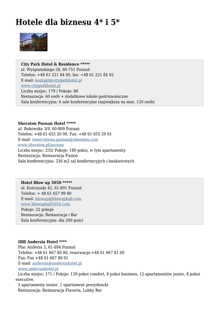 Hotele dla biznesu 4* i 5* City Park Hotel & Residence ***** ul. Wyspiańskiego 26, 60-751 Poznań Telefon: +48 61 221 84 00, fax: +48 61 221 84 02 E-mail: [email protected] www.cityparkhotel.pl Liczba miejsc: 179 / Pokoje: 88 Restauracja: 60 osób + dodatkowe lokale gastronomiczne Sala konferencyjna: 4 sale konferencyjne (największa na max. 120 osób) Sheraton Poznan Hotel ***** uI. Bukowska 3/9, 60-809 Poznań Telefon: +48 61 655 20 00, Fax: +48 61 655 20 01 E-mail: [email protected] www.sheraton.pl/poznan Liczba miejsc: 235/ Pokoje: 180 pokoi, w tym apartamenty Restauracja: Restauracja Fusion Sala konferencyjna: 336 m2 sal konferencyjych i bankietowych Hotel Blow up 5050 ***** ul. Kościuszki 42, 61-891 Poznań Telefon: + 48 61 657 99 80 E-mail: [email protected] www.blowuphall5050.com Pokoje: 22 pokoje Restauracja: Restauracja i Bar Sala konferencyjna: dla 200 gości IBB Andersia Hotel **** Plac Andersa 3, 61-894 Poznań Telefon: +48 61 667 80 00, rezerwacje:+48 61 667 81 00 Fax: Fax +48 61 667 80 01 E-mail: [email protected] www.andersiahotel.pl Liczba miejsc: 171 / Pokoje: 139 pokoi comfort, 8 pokoi business, 12 apartamentów junior, 8 pokoi executive, 3 apartamenty senior, 1 apartament prezydencki Restauracja: Restauracja Flavoria, Lobby Bar Sala konferencyjna: 8 sal wyposażonych w najnowocześniejszy sprzęt City Solei Boutique Hotel**** ul. Wenecjańska 1-8, 61-101 Poznań Telefon: +48 61 858 80 10, kom: +48 512 36 88 18 E-mail: [email protected] http://www.citysolei.pl Pokoje: 22 (1, 2 osobowe i apartamenty) Restauracja: Restauracja, Bar City Cocktail, Coffee Bar Sala konferencyjna: 3 sale w pełni wyposażone Hotel Kolegiacki **** Plac Kolegiacki 5, 61-841 Poznań Telefon: +48 61 855 05 05, Fax: +48 61 855 00 25 E-mail: [email protected] www.hotelkolegiacki.pl Pokoje: 24 pokoje jedno i dwuosobowe, studio i apartament Restauracja: Restauracja, Kawiarnia Sala konferencyjna: sala klimatyzowana na 30 osób Hotel Mercure Poznań **** (Accor Hotels) ul. Roosevelta 20, 60-829 Poznań Telefon: +48 61 855 80 00 Fax: +48 61 855 89 55 E-mail: [email protected] www.mercure.com/pl/hotel-3393-hotel-mercure-poznan-centrum/index.shtml Liczba miejsc: 451 / Pokoje: 228 Restauracja: Restauracja Brasserie de l'Opera, Bar oraz cukiernia Sala konferencyjna: 11 sal do 300 gości Hotel NH Poznań **** ul. Święty Marcin 67, 61-806 Poznań Telefon: +48 61 624 88 00, Fax: +48 61 624 88 01 E-mail: [email protected] www.nhpoznan.pl Liczba miejsc: 186 / Pokoje: 93 pokoje, każdy pokój może być jedno lub dwuosobowy Restauracja: Restauracja, Drink bar, Kawiarnia, Kasyno Sala konferencyjna: 3 sale konferencyjne - łącznie 160 miejsc Novotel Poznań Centrum**** (Accor Hotels) pl. Wł. Andersa 1, 61-898 Poznań Telefon: +48 61 858 70 00, Fax: +48 61 833 29 61 E-mail: [email protected] www.novotel.com Liczba miejsc: 800 / Pokoje: 480 pokoi, w tym 10 apartamentów Restauracja: 70 miejsc, kuchnia regionalna i międzynarodowa Sala konferencyjna: od 10 do 900 osób Hotel Rezydencja Solei **** ul. Wałecka 2, 61-461 Poznań Telefon: +48 61 847 58 38, 61 847 51 16; 510 110 140 Fax: +48 61 847 51 14 E-mail: [email protected] www.hotel-solei.pl/walecka/ Liczba miejsc: 52 / Pokoje: 23 pokoje Restauracja: 26 miejsc Sala konferencyjna: 3 sale konferencyjne od 10 do 120 osób Hotel Twardowski **** ul. Głogowska 358a, 60-004 Poznań Telefon: +48 61 83 99 800 Fax: +48 61 83 99 801 E-mail: [email protected] www.hoteltwardowski.pl Liczba miejsc: 78 / Pokoje: 26 jednoosobowych pokoi, 32 pokoje dwuosobowe, 4 apartamenty Restauracja: "Pani Twardowska", na około 120 osób Sala konferencyjna: 3 sale o łącznej pow. 220m2, mogące pomieścić w sumie 300 osób Hotel Vivaldi**** ul. Winogrady 9, 61-663 Poznań Telefon: +48 61 858 81 00 Fax: +48 61 853 29 77 E-mail: [email protected] www.vivaldi.pl Liczba miejsc: 87 Pokoje: 48 Restauracja: Cztery Pory Roku, 60 - 75 miejsc, kuchnia europejska Sala konferencyjna: 5 sal konferecyjnych o różnych wielkościach