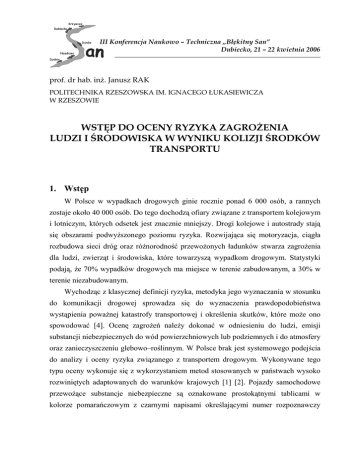 Krzywcza Dubiecko Dynów Nozdrzec III Konferencja Naukowo – Techniczna „Błękitny San” Dubiecko, 21 – 22 kwietnia 2006 Dydnia prof. dr hab. inŜ. Janusz RAK POLITECHNIKA RZESZOWSKA IM. IGNACEGO ŁUKASIEWICZA W RZESZOWIE WSTĘP DO OCENY RYZYKA ZAGROśENIA LUDZI I ŚRODOWISKA W WYNIKU KOLIZJI ŚRODKÓW TRANSPORTU 1. Wstęp W Polsce w wypadkach drogowych ginie rocznie ponad 6 000 osób, a rannych zostaje około 40 000 osób. Do tego dochodzą ofiary związane z transportem kolejowym i lotniczym, których odsetek jest znacznie mniejszy. Drogi kolejowe i autostrady stają się obszarami podwyŜszonego poziomu ryzyka. Rozwijająca się motoryzacja, ciągła rozbudowa sieci dróg oraz róŜnorodność przewoŜonych ładunków stwarza zagroŜenia dla ludzi, zwierząt i środowiska, które towarzyszą wypadkom drogowym. Statystyki podają, Ŝe 70% wypadków drogowych ma miejsce w terenie zabudowanym, a 30% w terenie niezabudowanym. Wychodząc z klasycznej definicji ryzyka, metodyka jego wyznaczania w stosunku do komunikacji drogowej sprowadza się do wyznaczenia prawdopodobieństwa wystąpienia powaŜnej katastrofy transportowej i określenia skutków, które moŜe ono spowodować [4]. Ocenę zagroŜeń naleŜy dokonać w odniesieniu do ludzi, emisji substancji niebezpiecznych do wód powierzchniowych lub podziemnych i do atmosfery oraz zanieczyszczeniu glebowo–roślinnym. W Polsce brak jest systemowego podejścia do analizy i oceny ryzyka związanego z transportem drogowym. Wykonywane tego typu oceny wykonuje się z wykorzystaniem metod stosowanych w państwach wysoko rozwiniętych adaptowanych do warunków krajowych [1] [2]. Pojazdy samochodowe przewoŜące substancje niebezpieczne są oznakowane prostokątnymi tablicami w kolorze pomarańczowym z czarnymi napisami określającymi numer rozpoznawczy Janusz Rak pojazdu i numer niebezpiecznej substancji według międzynarodowych oznaczeń. Tablice znajdują się z przodu i z tyłu pojazdu. Komunikacja drogowa i kolejowa nie ma tak duŜego wpływu na wody powierzchniowe i podziemne jak gospodarka wodna, przemysł, czy rolnictwo. W sytuacjach nadzwyczajnych moŜe wywierać jednak znaczący wpływ lokalny, zwłaszcza gdy szlaki transportowe przechodzą przez tereny stref ochronnych ujęć wody dla potrzeb zaopatrzenia aglomeracji miejskich. Oprócz nadzwyczajnych zagroŜeń środowiska związanych z powaŜnymi awariami z udziałem środków transportu występują stałe zanieczyszczenia pasmowe, punktowe i przestrzenne związane z komunikacją lądową. Ten rodzaj zagroŜeń nie będzie poruszany w treści tej pracy. 2. ZałoŜenia metody oceny zagroŜenia Przez powaŜną katastrofę rozumie się zdarzenie, które moŜe wywołać jeden z następujących skutków: • utratę Ŝycia co najmniej 10 osób, • zanieczyszczenie wód powierzchniowych płynących (rzek) − ładunek powyŜej 15 g/cm2, w wypadku ropopochodnych i powyŜej 5 g/cm2, w wypadku innych substancji, które mogą w istotny sposób zmienić jakość wód na długości 10 km, − j.w. na obszarze 1 km2 w wypadku wód powierzchniowych stojących (jeziora, zbiorniki wodne), • zanieczyszczenie wód podziemnych przekraczające normatyw jakości ujmowanych wód, wyznaczone na podstawie współczynników przepuszczalności gruntu i miąŜszości warstwy wodonośnej. Prawdopodobieństwo wystąpienia wypadku transportowego o znamionach powaŜnej awarii wyznacza się przy następujących załoŜeniach: • w wypadku ludności, jest sumą prawdopodobieństw scenariuszy o powaŜnych skutkach, związanych z uwolnieniem substancji niebezpiecznych (toksycznych), poŜarem i wybuchem, • w wypadku wód powierzchniowych i podziemnych, jest sumą prawdopodobieństw scenariuszy o powaŜnych skutkach, związanych z 140 Wstęp do oceny ryzyka zagroŜenia ludzi i środowiska… uwolnieniem do nich związków węglowodowych i innych substancji niebezpiecznych znacząco zmieniających jakość tych wód. Podział obszarów prawdopodobieństw przedstawia się następująco: • obszar prawdopodobieństw nieakceptowanych – ofiar śmiertelnych/rok powyŜej 10-3, • obszar prawdopodobieństw kontrolowanych – pomiędzy 10-5 a 10-3, • obszar prawdopodobieństw tolerowanych – poniŜej 10-5. 3. Opis metody Ogólny algorytm obliczeń prawdopodobieństwa wystąpienia wypadku transportowego o powaŜnych skutkach wymaga znajomości następujących danych: • opisu otoczenia drogi, • podziału gęstości zaludnienia na grupy, podziału drogi na odcinki, • określeniu intensywności i struktury ruchu drogowego, • podziału na grupy moŜliwych scenariuszy wypadkowych, • obliczeniu częstości wypadków z udziałem niebezpiecznych substancji w poszczególnych grupach, • wyznaczeniu prawdopodobieństwa kaŜdego scenariusza awaryjnego. W wypadku braku rzetelnych danych statystycznych moŜna posłuŜyć się oszacowaniami z rozwiniętych krajów europejskich odnoszących się do intensywności wypadków w skali roku: • autostrady 0,25 ÷ 0,65 . 10-6 km . pojazd, • drogi szybkiego ruchu 0,4 ÷ 0,6 . 10-5 km . pojazd, • główne drogi poza obszarem zabudowanym 0,8 ÷ 1,6 . 10-6 km . pojazd, • główne drogi w obszarach miejskich 1,7 ÷ 2,5 . 10-6 km . pojazd. Wyznaczenie prawdopodobieństwa wypadku transportowego o powaŜnych skutkach oddzielnie oblicza się dla ludności, a oddzielnie dla środowiska wodnego (wody powierzchniowe i wody podziemne). Prawdopodobieństwo katastrofy transportowej kaŜdorazowo wyznacza się według formuły: P = 365 . A . B . C . D . E . F . G . H (1) 141 Janusz Rak gdzie: Parametry ruchu pojazdów na drodze 365 . A – intensywność ruchu samochodów 1/rok, wartość średniodobowa ekstrapolowana na okres 1 roku, B – udział samochodów cięŜarowych w ruchu pojazdów, C – intensywność wypadków w transporcie cięŜarowym (s.c..km)-1, D – udział w transporcie cięŜarowym materiałów niebezpiecznych, Parametry scenariuszy zagroŜeń E – udział