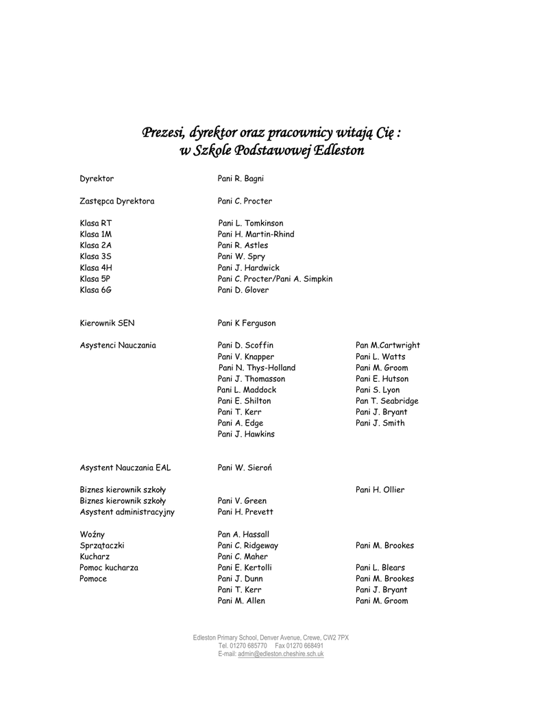 Prezesi, dyrektor oraz pracownicy witają Cię : w Szkole Podstawowej Edleston Dyrektor Pani R. Bagni Zastępca Dyrektora Pani C. Procter Klasa RT Klasa 1M Klasa 2A Klasa 3S Klasa 4H Klasa 5P Klasa 6G Pani L. Tomkinson Pani H. Martin-Rhind Pani R. Astles Pani W. Spry Pani J. Hardwick Pani C. Procter/Pani A. Simpkin Pani D. Glover Kierownik SEN Pani K Ferguson Asystenci Nauczania Pani D. Scoffin Pani V. Knapper Pani N. Thys-Holland Pani J. Thomasson Pani L. Maddock Pani E. Shilton Pani T. Kerr Pani A. Edge Pani J. Hawkins Asystent Nauczania EAL Pani W. Sieroń Biznes kierownik szkoły Biznes kierownik szkoły Asystent administracyjny Pani V. Green Pani H. Prevett Woźny Sprzątaczki Kucharz Pomoc kucharza Pomoce Pan A. Hassall Pani C. Ridgeway Pani C. Maher Pani E. Kertolli Pani J. Dunn Pani T. Kerr Pani M. Allen Edleston Primary School, Denver Avenue, Crewe, CW2 7PX Tel. 01270 685770 Fax 01270 668491 E-mail: [email protected] Pan M.Cartwright Pani L. Watts Pani M. Groom Pani E. Hutson Pani S. Lyon Pan T. Seabridge Pani J. Bryant Pani J. Smith Pani H. Ollier Pani M. Brookes Pani L. Blears Pani M. Brookes Pani J. Bryant Pani M. Groom Organ Zarządzający: Dyrektor: Pani R. Bagni Lokalne Władze Szkół : Pan E. A. Flood Rada Rodzicielska: Pani E Humphries (Przewodnicząca szkół) Pani C Salt Pani J. Vickers Rada Pedagogiczna: Pani L. Tomkinson Rada Społeczna/ Publiczna Pani J.Hardwick Pani E Szymura Pan J. Eagney Luka Kuratorium Oświaty : Education Offices: Mid Cheshire District Cheshire Education services Watling Street County Hall Northwich Chester CH1 1SQ Cheshire Edleston Primary School, Denver Avenue, Crewe, CW2 7PX Tel. 01270 685770 Fax 01270 668491 E-mail: [email protected] Cele Szkoły Naszym celem jest: 1. Bycie szkołą zintegrowaną i umieszczać praktykę we wszystkich aspktach naszych działań tak, aby zapewnić wszystkim uczniom równe możliwości oraz sprawiedliwe traktowanie. 2. Promować i osiągać przez wszystkich wysokie standardy poprzez nauczanie i naukę na wysokim poziomie. 3. Trakować uczniów indywidualnie oraz zapewnić im zróżnicowane nauczanie i uczenie uwzględniające ich potrzeby specjalne i indywidualne. 4. Uwzględniać potrzeby fizyczne, psychiczne, społeczne, duchowe, moralne oraz kulturalne osób uczących się . 5. Zapewniać uczniom opiekę, zdrowie i bezpieczeństwo. 6. Zapoznać się z dokumentem określającym wytyczne w sprawie każdego dziecka. 7. Zapewnić wszystkim osobom uczącym się korzyści płynące z bogatego, szerokiego i zbalansowanego programu nauczania zaprezentowanego w sposób ciekawy, ekscytujący oraz pomysłowy, dostarczającego mnóstwo możliwości uzyskiwania doświadczeń z ,,pierwszej ręki,, , praktycznej pracy, prowadzenia doświadczeń i uczenia się poprzez zabawę we wczesnych latach nauki. 8. Nauczać podstawowych umiejętności i kluczowych zagadnień oraz kłaść ogromny nacisk na przedmioty podstawowe oraz edukację religijną. 9. Wiązać ze sobą przedmioty i stosować podstawowe umiejętności w ramach programu nauczania. 10. Ożywiać i wzbogacać program nauczania poprzez wizyty, gości oraz szerokie wykorzystywanie środowiska naturalnego. 11. Przekazywać uczniom odpowiedzialność i rozwijać ich pewność siebie poprzez wkład dla społeczności. 12. Uczynić rodziców oraz szersze kręgi wspólnoty równouprawnionymi partnerami szkoły i obejmować ich w ewaluacji ich sukcesów. 13. Budować nastrój charakteryzujący się powitalnym, przyjaznym, jasnym i tętniącym życiem szczęśliwym miejscem, gdzie uczniowie czują się bezpiecznie;Szkołę, gdzie oczekuje się dobrego zachowania i gdzie uczniowie wzrastają w radości. 14. Uczynić szkołę przyjemnym miejscem, zachęcającym do uzyskiwania sukcesów, za które się nagradza oraz świętuje . Mottem naszej szkoły jest: Edleston Primary School, Denver Avenue, Crewe, CW2 7PX Tel. 01270 685770 Fax 01270 668491 E-mail: [email protected] Godziny i daty na rok szkolny 2016/2017 Szkolny dzień:Reception KS1 KS2 9.00 rano. – 12:00 po południu 1.10 po południu – 3.10 po południu 9.00 rano. – 12:00 po południu 1.10 po południu – 3.15 po południu 9.00 rano. – 12.10 po południu 1.10 po południu. – 3.15 po południu Cotygodniowy czas nauczania (włączając wspólny kult, przerwy i sprawdzanie obecności): Reception and KS1 21 godzin 40 minut KS2 23 godzinys 45 minut Rodzice dzieci z klasy reception oraz KS1 są zachęcani do przychodzenia na godzinę 8.45, aby czytać wraz ze swoim dzieckiem. GODZINY NADZORU DZIECI Uczniowie są pod opieką w szkole od godziny 8.45 rano do 3.15 po południu. Szkoła nie odpowiada za uczniów poza tym czasem chyba, że są to zatwierdzone zajęcia przed i poza szkolne. Przypominamy rodzicom, że szkoła nie odpowiada za wypadki, w które mogą być włączone dzieci nieuczęszczające jeszcze do szkoły, przeważnie spowodowane wspinaniem się na szkolny sprzęt znajdujący się na boisku szkolnym. Proszę wziąść pod uwagę, że w deszczowe dni wyposażenie boiska szkolnego może być mokre, a przez to bardzo śliskie, co może być przyczyną wypadku twojego dziecka. Edleston Primary School, Denver Avenue, Crewe, CW2 7PX Tel. 01270 685770 Fax 01270 668491 E-mail: [email protected] Daty w szkolnym semestrze na rok 2016/17 Jesień 1 Jesień 2 Wiosna 1 Wiosna 2 Lato 1 Lato 2 Data rozpoczęcia Wtorek 06 Września 2016 Poniedziałek 31 Października 2016 Poniedziałek 09 Stycznia 2017 Poniedziałek 27 Lutego 2017 Wtorek 18 Kwietnia 2017 Poniedziałek 05 Czerwca 2017 Data zakończenia Czwartek 20 Października 2016 Czwartek 22 Grudnia 2016 Bank holiday (szkoła jest zamknięta) Poniedziałek 01 maja 2017 (May Day) Dni treningu (szkoła jest zamknięta) Poniedziałek 05 Wrzesień 2016 Piątek 21 Października 2016 Poniedziałek 05 Grudnia 2016 Poniedziałek 12 Czerwca 2017 Poniedziałek 03 Lipca 2017 Edleston Primary School, Denver Avenue, Crewe, CW2 7PX Tel. 01270 685770 Fax 01270 668491 E-mail: [em