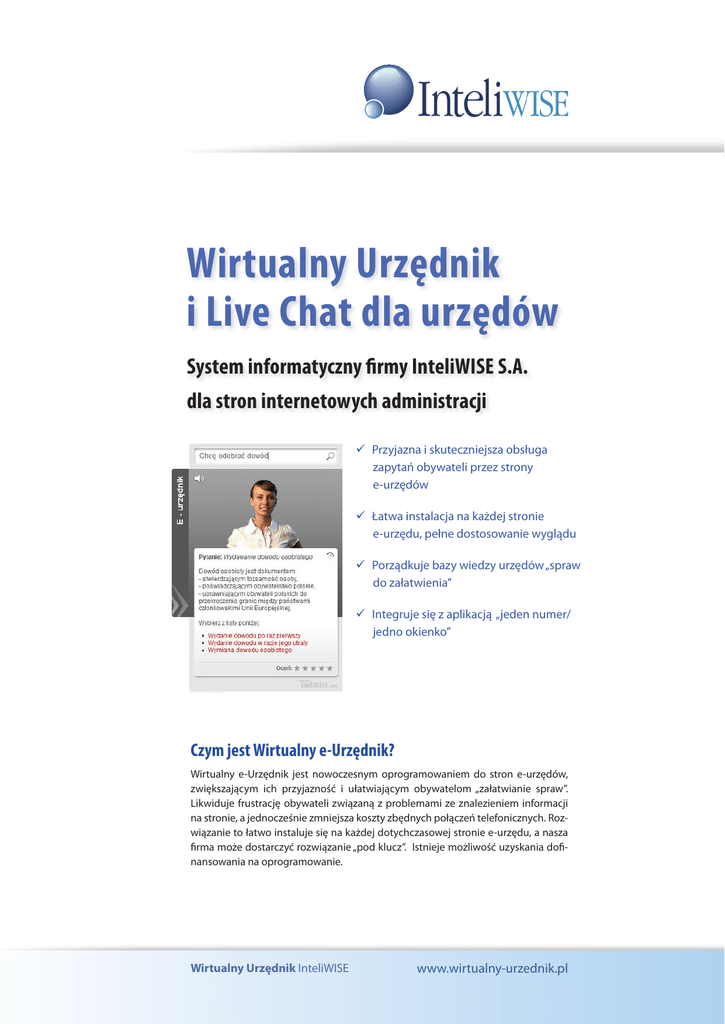Wirtualny Urzędnik i Live Chat dla urzędów System informatyczny firmy InteliWISE S.A. dla stron internetowych administracji . Przyjazna i skuteczniejsza obsługa zapytań obywateli przez strony e-urzędów Łatwa instalacja na każdej stronie e-urzędu, pełne dostosowanie wyglądu Porządkuje bazy wiedzy urzędów „spraw do załatwienia” Integruje się z aplikacją „jeden numer/ jedno okienko” Czym jest Wirtualny e-Urzędnik? Wirtualny e-Urzędnik jest nowoczesnym oprogramowaniem do stron e-urzędów, zwiększającym ich przyjazność i ułatwiającym obywatelom „załatwianie spraw”. Likwiduje frustrację obywateli związaną z problemami ze znalezieniem informacji na stronie, a jednocześnie zmniejsza koszty zbędnych połączeń telefonicznych. Rozwiązanie to łatwo instaluje się na każdej dotychczasowej stronie e-urzędu, a nasza firma może dostarczyć rozwiązanie „pod klucz”. Istnieje możliwość uzyskania dofinansowania na oprogramowanie. Wirtualny Urzędnik InteliWISE www.wirtualny-urzednik.pl Wirtualny Urzędnik i Live Chat dla urzędów Jak to działa? Dodanie do strony e-Urzędnik może być dodany do strony jako popularna zakładka, zawsze gotowa do pomocy… Zrozumienie problemu, prowadzenie „za rękę” ● Działa jak nowej generacji wyszukiwarka, prowadząca obywatela “za rękę” poprzez treść, aż do załatwienia sprawy; ● Po raz pierwszy, obywatel może zadać w serwisie pytanie na swój własny sposób, nawet robiąc błędy w pisowni, bez szukania informacji w serwisie; ● wraz z odpowiedzią użytkownicy otrzymują listę tematów pokrewnych, co ułatwia im zgłębianie wiedzy na dany temat; Obrazek przedstawia demonstracje przykładowego Wirtualnego Urzędnika dla wybranej JST. ● błyskawicznie drukowane formularze i druki urzędowe ● Obywatel może także poprosić o kontakt czy pozostawić informacje albo sugestie. Wizualizacja dostosowana do charakteru strony (kolory, design), z możliwością dodania wirtualnej postaci – awatara Wirtualne kompetencje, rozwiązywanie problemu ● Oprogramowanie e-Urzędnik może być wyposażone w wirtualne kompetencje ● Rozwiązuje problem, a nie pozostawia obywatela z pytaniami i frustracją. „Sprawy do załatwienia”... dla Firm Przykłady: ● Zarejestruj firmę przez Internet ● Wpis do / wykreślenie z / ewidencji działalności gospodarczej ● Wyszukiwarka przedsiębiorców „Sprawy do załatwienia”... dla Mieszkańców Przykłady: ● Dowód osobisty ● Meldunek ● Prawo Jazdy ● Urząd Stanu Cywilnego telefon: e-mail: Skype: + 48 503 007 654 lub +48 22 3797 442 [email protected] inteliwise Wirtualny Urzędnik i Live Chat dla urzędów Wykorzystanie Wirtualnych kompetencji Przykład wirtualnego czatu Wirtualny Doradca: Witaj na stronie Urzędu Miasta. Chętnie odpowiem na Twoje pytania dotyczące dowodów osobistych. Użytkownik: Muszę wyrobić nowy dowód WD: Z jakiego powodu chcesz wyrobić dowód osobisty? Wybierz z listy poniżej: • Wydanie dowodu po raz pierwszy • Wydanie dowodu w razie jego utraty • Wymiana dowodu osobistego U: Zgubiłem swój stary dowód U: Ile zdjęć potrzebuję WD: Do wniosku o wydanie dowodu osobistego potrzebnesą dwie wyraźne i jednakowe fotografie o wymiarach 35 x 45 mm, odzwierciedlające aktualny wizerunek osoby, której wniosek dotyczy. Osoba ta musi być bez nakrycia głowy i okularów z ciemnymi szkłami. Zdjęcia muszą ukazywać głowę w pozycji lewego półprofilu i z widocznym lewym uchem, z zachowaniem równomiernego oświetlenia twarzy. U: ile będę czekał na nowy dowód WD: Termin odpowiedzi w przypadku wymiany dowodu osobistego wynosi do 1 miesiąca. WD: Utraciłeś dowód? Nie przejmuj się. Tutaj znajdziesz wniosek o wydanie dowodu osobistego. Wypełniony wniosek prosimy złożyć w Delegaturze Biura Administracji i Spraw Obywatelskich. U: czy moze ktos za mnie odebrać? U: a ile kosztuje wyrobienie nowego dowodu WD: Ja również dziękuję. Jeśli nie potrzebujesz więcej pomocy, to czy mogę prosić o ocenę pracy e-Urzędu? WD: Wydanie oraz wymiana dowodu osobistego są bezpłatne. WD: Dowód osobisty odbiera się osobiście, z wyjątkiem przedstawionych tutaj przypadków. [...] U: ok, dzięki za pomoc Interfejs do zarzadzania aplikacją Dla wielu naszych klientów raporty i dane z działania Wirtualnego Doradcy są równie ważne jak jego działanie. Każdy klient otrzymuje bezpłatnie dostęp do narzędzia „Panel”, gdzie może śledzić historię i przebieg wirtualnych konwersacji, wskaźniki oraz statystyki. Panel umożliwia także podstawową konfigurację wyglądu Doradcy, skryptów czy wyzwalaczy. Co wchodzi w skład rozwiązania? ● Oprogramowanie ● Baza wiedzy, „wirtualne kompetencje” – oraz prawa do bazy wiedzy dla urzędu ● Usługa instalacji www.wirtualny-urzednik.pl Wirtualny Urzędnik i Live Chat dla urzędów Dlaczego warto ● Oszczędność dla urzędu – 180 uporządkowanych, gotowych spraw. – Gotowe do użycia karty spraw porządkują bazy wiedzy urzędów „spraw do załatwienia”. – Oprogramowanie znacząco obniża koszty codziennej obsługi obywateli i firm poprzez stronę www e-Urząd, nie każąc im także czekać na połączenie telefoniczne – nawet poniżej 10 groszy za wirtualnego czata – obsłużony problem. – Ilość klientów obsługiwanych przez Wirtualnych Agentów Pomocy jest praktycznie nieograniczona i zależy jedynie od ruchu na serwisie. ● Wreszcie przyjazny dla obywatela e-urząd, obsługa zapytań – Oprogramowanie umożliwia zrozumienie problemu, prowadzenie „za rękę” aż do rozwiązania sprawy, bez konieczności angażowana urzędników. ● Wyróżnia serwis e-Urzędu, pokazuje jego ‘przyjazną twarz’, czyni go bardziej dostępnym dla klientów, – Atrakcyjna strona – Awatar zwiększa unikalność strony miasta, gminy ● Mniejsze obciążenie urzędów korespondencją I telefonami – Urzędnicy mają rano mniej e-maili z p