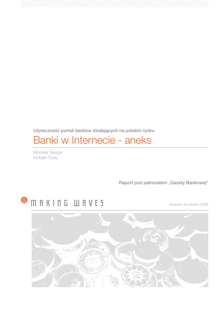 Użyteczność portali banków działających na polskim rynku Banki w Internecie - aneks Monika Telega Hubert Turaj Raport pod patronatem „Gazety Bankowej” Kraków, Grudzień 2008 Uwagi W aneksie do raportu „Banki w Internecie” prezentujemy kryteria, które stosowaliśmy przy ocenie użyteczności serwisów bankowych. Liczby w nawiasach oznaczają wagi, które zastosowaliśmy przy obliczaniu ostatecznej punktacji (istotniejsze elementy mają wyższe wagi). Strona główna i serwis Jakość strony głównej (5)1 6 5 4 3 2 1 Doskonały, przejrzysty projekt, priorytetowe treści wyróżnione Dobry projekt, dobrze opisane kategorie, nieco gorsza przejrzystość Umiarkowana przejrzystość, co może utrudniać dotarcie do informacji Niejasna organizacja, zbyt dużo lub brak informacji, nieczytelnie opisane kategorie Natłok lub brak informacji, bardzo słaba organizacja Układ chaotyczny, nie wzbudzający zaufania Nawigacja w serwisie (5) 6 5 4 3 2 1 Doskonała, spójna, intuicyjna Zrozumiała i dobrze widoczna Miejscami nieintuicyjna i niespójna Pewne problemy ze zrozumieniem logiki nawigacji Duże problemy z intuicyjnością i prostotą Nawigacja bardzo niejasna, niespójna, nielogiczna Informacje o banku – wyniki finansowe i władze2 (2) 6 5 4 3 2 1 Łatwe do znalezienia, pełne dane, dostępne bieżące raporty wraz z opisem Dość łatwe do znalezienia, pełne dane o banku Pełne, lecz trudne do znalezienia informacje o banku Skrótowe i trudne do znalezienia informacje, zawierające przynajmniej podsumowanie wyników banku, bez szczegółów Informacje bardzo skrótowe, trudne do znalezienia Brak bieżących informacji lub bardzo trudne do zlokalizowania 1 W nawiasach podane są wagi poszczególnych kryteriów 2 Wyniki finansowe, pozycja finansowa (w tym kapitał, wypłacalność i płynność), informacje o podstawowej działalności, zarządzie i nadzorze właścicielskim © Making Waves Polska 2008 www.makingwaves.pl 2/8 Numer infolinii (4) 6 5 4 3 2 1 Kontakt dobrze widoczny na każdej stronie Kontakt słabiej widoczny na niektórych stronach Kontakt słabiej widoczny na większości stron Pojawiają się problemy ze znalezieniem kontaktu Kontakt bardzo trudny do znalezienia Brak możliwości odnalezienia kontaktu lub tylko kontakt osobisty Wyszukiwarka (4) 6 Działa na wszystkie słowa kluczowe, podaje adekwatny i bardzo dobrze opisany link 5 Działa na wszystkie słowa kluczowe, poprawny i czytelny link 4 Działa na większość słów kluczowych, podaje poprawny link 3 Działa na niektóre słowa kluczowe, podaje link w niejasny sposób 2 Nie działa na żadne słowa kluczowe lub nie podaje właściwego linku 1 Brak wyszukiwarki Słowa kluczowe: kredyt hipoteczny, konto dla firm, rachunek maklerski, pożyczka, karta kredytowa Lista oddziałów i bankomatów wraz z lokalizacjami (4) 6 5 4 3 2 1 Łatwo dostępna, pełne dane Raczej dostępna, pełna, ale mało przejrzysta lista Niezbyt łatwa do znalezienia lub bardzo mało przejrzysta Trudna do znalezienia, bardzo nieczytelna, niekompletne dane Możliwa do znalezienia tylko przez wyszukiwarkę Brak listy Prezentacja i opis produktów Informacje o oprocentowaniu lokat (4) 6 5 4 3 2 1 Bardzo łatwo dostępne, bardzo szczegółowe, przejrzyste informacje Łatwe do znalezienia, pełne, choć mniej przejrzyste Trudne do zlokalizowania, ale pełne Czasochłonne lokalizowanie, mało szczegółowe Bardzo trudne do znalezienia, dostępne przez wyszukiwarkę, niekompletne Niemożliwe do znalezienia za pomocą wyszukiwarki Oprocentowanie kredytów hipotecznych (3) 6 5 4 3 2 1 Doskonała informacja o oprocentowaniu, łatwo dostępny kalkulator kredytów Wyczerpująca informacja o oprocentowaniu, dostępny kalkulator kredytów Mniej dokładna i trudno dostępna informacja o oprocentowaniu Zdawkowa, trudna do odszukania informacja o oprocentowaniu Ogólna informacja o oprocentowaniu Brak informacji o oprocentowaniu kredytów i/lub brak kalkulatora © Making Waves Polska 2008 www.makingwaves.pl 3/8 Wymagania dla osób biorących kredyt hipoteczny (3) 6 5 4 3 2 1 Łatwe do zlokalizowania, jasne, dostępne dokumenty do pobrania (regulaminy itp.) Nie sprawiające problemów ze znalezieniem, w miarę przejrzyste Raczej łatwe do znalezienia, ale niekompletne Trudne do znalezienia, mało przejrzyste Możliwe do znalezienia tylko przez wyszukiwarkę, ogólne informacje Brak informacji lub bardzo okrojone Opis konta bankowego (on-line) (3) 6 5 4 3 2 1 Zwięzły, zrozumiały opis łatwy do znalezienia Mniej przejrzysty, ale łatwy do znalezienia Trudniejszy do znalezienia i mniej czytelny opis Opis trudny do znalezienia, nieczytelny Opis produktu szczątkowy lub bardzo trudny do znalezienia Brak opisu produktu Zachęta do założenia konta bankowego (on-line) (2) 6 5 4 3 2 1 Czytelne i widoczne wezwanie do działania, podane korzyści Widoczne i czytelne wezwanie do działania Mniej wyraźna lub niejasna w treści Wezwanie do działania jest słabo widoczne albo niezrozumiałe Bardzo trudna do odnalezienia, niejasny komunikat Brak jakiejkolwiek zachęty Regulamin i zakładanie konta on-line (5) 6 5 4 3 2 1 Dostępny pełen regulamin, informacje o zabezpieczeniach, dokumentach itp. otwarcie on-line Dostępny regulamin, niekompletne informacje lub mało przystępna forma; zapisy on-line Informacje o warunkach szczątkowe. Zapisy przez Internet tylko częściowe – trzeba kontynuować telefonicznie z konsultantem lub osobiście w banku Za mało informacji o regulaminie, zabezpieczeniach itp. zapisy do banku tylko osobiście lub z pomocą konsultanta Brak informacji o warunkach, zapisy tylko osobiście, brak informacji o wymaganych dokumentach i zabezpieczeniach Brak regulaminu, informacji o zabezpieczeniach. Brak informacji o sposobach zakładania konta Logowanie do bankowości elektronicznej Link do logowania na stronie głównej (3) 6 5 4 3 2 1 Doskonale się wyróżnia, dobry opis Dobre wyróżnienie, widoczny opis Dostrzegalne, w miarę do