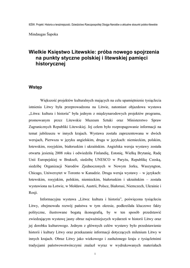 IEŚW. Projekt: Historia a teraźniejszość. Dziedzictwo Rzeczpospolitej Obojga Narodów a aktualne stosunki polsko-litewskie Mindaugas Šapoka Wielkie Księstwo Litewskie: próba nowego spojrzenia na punkty styczne polskiej i litewskiej pamięci historycznej Wstęp Większość projektów kulturalnych mających na celu upamiętnienie tysiąclecia istnienia Litwy była przeprowadzona na Litwie, natomiast objazdowa wystawa „Litwa: kultura i historia” była jednym z międzynarodowych projektów programu, promowanym przez Litewskie Muzeum Sztuki oraz Ministerstwo Spraw Zagranicznych Republiki Litewskiej. Jej celem było rozpropagowanie informacji na temat jubileuszu w innych krajach. Wystawa została zaprezentowana w dwóch wersjach, Pierwsza w języku angielskim, druga w językach: niemieckim, polskim, łotewskim, rosyjskim, białoruskim i ukraińskim. Angielska wersja wystawy została otwarta jesienią 2008 roku i odwiedziła Finlandię, Estonię, Wielką Brytanię, Radę Unii Europejskiej w Brukseli, siedzibę UNESCO w Paryżu, Republikę Czeską, siedzibę Organizacji Narodów Zjednoczonych w Nowym Jorku, Waszyngton, Chicago, Uniwersytet w Toronto w Kanadzie. Druga wersja wystawy – w językach: łotewskim, rosyjskim, polskim, niemieckim, białoruskim i ukraińskim – została wystawiona na Łotwie, w Mołdawii, Austrii, Polsce, Białorusi, Niemczech, Ukrainie i Rosji. Informacyjna wystawa „Litwa: kultura i historia”, poświęcona tysiącleciu Litwy, obejmowała rozwój państwa w tym okresie, podkreślała kluczowe fakty polityczne, ilustrowane bogatą ikonografią, by w ten sposób przedstawić zwiedzającym wystawę jasny obraz najważniejszych wydarzeń w historii Litwy oraz jej dorobku kulturowego. Jednym z głównych celów wystawy było przedstawienie historii i kultury Litwy oraz przekazanie informacji dotyczących milenium Litwy w innych krajach. Obraz Litwy jako wiekowego i zasłużonego kraju z tysiącletnimi tradycjami państwowotwórczymi znalazł wyraz w wydrukowanych materiałach 1 IEŚW. Projekt: Historia a teraźniejszość. Dziedzictwo Rzeczpospolitej Obojga Narodów a aktualne stosunki polsko-litewskie prezentujących podstawowe informacje na temat wystawionych eksponatów. Informacyjno-edukacyjna wystawa miała na celu przedstawienie historii państwa i kultury litewskiej, jak i zwrócenie uwagi na nasz kraj przy okazji świętowania przez niego swojego milenium. Na podstawie wyżej wspomnianej wystawy powstała książka Millennium Lithuaniae, poświęcona tysiącleciu istnienia Litwy. Publikację koordynowały Urząd Prezydenta Republiki Litewskiej oraz Litewskie Muzeum Sztuki. Na potrzeby książki wykorzystano szerszy zakres tekstów, niż w przypadku wystawy. Zważywszy na fakt, że wystawa była prezentowana w wielu krajach i prestiżowych instytucjach, zwrócono szczególną uwagę na dobór ilustracji i tekstów. Historyk sztuki, dr Irena Vaišvilaitė, napisała teksty, zrecenzowane przez dr. Vydasa Dolinskasa i prof. Mečislovasa Jučasa. Jako że były prezydent Litwy, Valdas Adamkus, był oficjalnym patronem tej publikacji, zawartość książki została odpowiednio dostosowana do oficjalnego stanowiska urzędu Prezydenta, co oznacza, że interpretacje wydarzeń historycznych prezentowane w książce Millenium Lithuaniae można uznać za oficjalne stanowisko Litwy. Jednakże, biorąc pod uwagę fakt, że badania historyczne ulegają ciągłym zmianom i ponownym ocenom wraz z pojawieniem się nowych źródeł i badań historycznych, stwierdzenia historyczne prezentowane w tej książce mogą ulec zmianie lub też zostać poddane naukowej krytyce. Książka Millenium Lithuaniae została opublikowana w 2009 roku, dlatego też wybrałem książkę autorstwa prof. Andrzeja Rachuby, prof. Juratė Kiaupienė i prof. Zigmantasa Kiaupy pt. Historia Litwy. Dwugłos polsko-litewski, również opublikowaną w 2009 roku, jako główny materiał porównawczy w celu ukazania, jak interpretowane są fakty historyczne oraz jakie konkluzje można wyciągnąć z najbardziej kontrowersyjnych faktów. Inicjatywa wydania tej książki wyszła od Sławomira Górzyńskiego, który przyznał, że „zdaje sobie sprawę z tego, jak wiele nieporozumień nadal pozostaje w historii Polski i Litwy z powodu różnych punktów widzenia i przeciwstawnych stanowisk, których powodem są różne interpretacje tego samego faktu ze wspólnej historii” 1. Jednakże, pomimo bardziej wyczerpujących tekstów, końcowa wersja książki okazała się podobna do Millenium Lithuaniae, obie książki mają bowiem charakter reprezentatywny dla współczesnego stanu badań historycznych, ale skierowane są raczej do masowego odbiorcy, nie zaś do 1 A. Rachuba, J. Kiaupienė, Z. Kiaupa, Historia Litwy. Dwugłos polsko-litewski, Warszawa 2009, s. 5. 2 IEŚW. Projekt: Historia a teraźniejszość. Dziedzictwo Rzeczpospolitej Obojga Narodów a aktualne stosunki polsko-litewskie środowiska akademickiego. Ten fakt sprawia, że porównanie jest tym bardziej sensowne i potrzebne. Chociaż mity historiograficzne są tworzone przez profesjonalnych historyków, są one powielane i rozwijane przez szerokie masy. Dlatego też głównym celem tego artykułu jest ukazanie tematów szczególnie budzących kontrowersje oraz przedstawienie kolejnych tematów do dyskusji w ramach projektu „Historia a teraźniejszość”. W pierwszej części artykułu zaprezentowany jest pierwszy rozdział Millenium Lithuaniae, zatytułowany Starożytne państwo i poświęcony historii Litwy od 1009 do 1795 roku. W drugiej części dokonano porównania kilku elementów z publikacji litewskiej na temat tysiąclecia Litwy z książką Historia Litwy. Dwugłos polsko-litewski. Starożytne państwo „W roku 1009 święty Bruno, znany również jako Bonifacy, arcybiskup i zakonnik, podczas jego jedenastego roku od zostania zakonnikiem został zamordowany przez pogan na granicy Rusi i Litwy 9 marca z 18 z jego braci, którzy