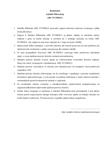 Regulamin Szkółki Piłkarskiej ABC FUTBOLU 1. Szkółka Piłkarska ABC FUTBOLU prowadzi zajęcia rekreacji ruchowej związanej z piłką nożną dla dzieci. 2. Zajęcia w Szkółce Piłkarskiej ABC FUTBOLU są płatne. Opłatę za szkolenie należy wpłacać z góry za każdy miesiąc w terminie do 1 każdego miesiąca na konto ABC FUTBOLU. Np. opłata za maj musi wpłynąć do 1 maja na konto szkółki. 3. Opuszczenie kilku treningów z powodu choroby lub innych przyczyn nie jest podstawą do obniżenia lub zwolnienia z opłaty miesięcznej dla członka szkółki. 4. W razie przypadków losowych ABC FUTBOLU zastrzega sobie możliwość odwołania zajęć, o czym opiekun prawny dziecka zostanie powiadomiony. 5. Opiekun prawny dziecka wyraża zgodę na wykorzystanie wizerunku dziecka (zdjęcia, filmy) do celów związanych z działalnością ABC FUTBOLU. 6. Opiekun prawny zaświadcza że dziecko jest ubezpieczone od następstw nieszczęśliwych wypadków NW. 7. Opiekun prawny dziecka zobowiązuje się do rzetelnego i zgodnego z prawdą wypełnienia formularza zgłoszeniowego, w tym przede wszystkim informacji o stanie zdrowia dziecka i ewentualnych przeciwwskazań do udziału w zajęciach. 8. Za ewentualne szkody związane z nieodpowiednim zachowaniem podopiecznego na zajęciach piłkarskich odpowiada opiekun prawny dziecka. 9. Osoba, która rezygnuje ze szkolenia w Szkółce Piłkarskiej musi powiadomić o tym fakcie trenera przed rozpoczęciem danego miesiąca tylko wówczas opłaty za kolejny miesiąc nie trzeba będzie realizować. W przeciwnym wypadku opłatę należy uregulować. …................................................. data i podpis rodzica (opiekuna prawnego)