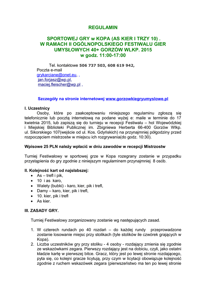 REGULAMIN SPORTOWEJ GRY w KOPA (AS KIER I TRZY 10) . W RAMACH II OGÓLNOPOLSKIEGO FESTIWALU GIER UMYSŁOWYCH 40+ GORZÓW WLKP. 2015 w godz. 11:00-17:00 Tel. kontaktowe 506 737 503, 608 619 942, Poczta e-mail [email protected], , [email protected], [email protected] , Szczegóły na stronie internetowej www.gorzowkiegryumyslowe.pl I. Uczestnicy Osoby, które po zaakceptowaniu niniejszego regulaminu zgłoszą się telefonicznie lub pocztą internetową na podane wyżej e: maile w terminie do 17 kwietnia 2015, lub zapiszą się do turnieju w recepcji Festiwalu – hol Wojewódzkiej i Miejskiej Biblioteki Publicznej im. Zbigniewa Herberta 66-400 Gorzów Wlkp. ul. Sikorskiego 107(wejście od ul. Kos. Gdyńskich) na przynajmniej półgodziny przed rozpoczęciem mistrzostw w miejscu ich rozgrywania(do godz. 10:30). Wpisowe 25 PLN należy wpłacić w dniu zawodów w recepcji Mistrzostw Turniej Festiwalowy w sportowej grze w Kopa rozegrany zostanie w przypadku przystąpienia do gry zgodnie z niniejszym regulaminem przynajmniej 8 osób. II. Kolejność kart od najsłabszej: As – trefl i pik, 10 i as karo, Walety (bubki) - karo, kier, pik i trefl, Damy – karo, kier, pik i trefl, 10. kier, pik i trefl As kier. III. ZASADY GRY. Turniej Festiwalowy zorganizowany zostanie wg następujących zasad. 1. W czterech rundach po 40 rozdań – do każdej rundy przeprowadzone zostanie losowanie miejsc przy stolikach (tyle stolików ile czwórek grających w Kopa). 2. Liczba uczestników gry przy stoliku - 4 osoby - rozdający zmienia się zgodnie ze wskazówkami zegara. Pierwszy rozdający jest na dobiciu, czyli, jako ostatni kładzie kartę w pierwszej bitce. Gracz, który jest po lewej stronie rozdającego, pyta się, co kolejni gracze licytują, przy czym w licytacji obowiązuje kolejność zgodnie z ruchem wskazówek zegara (pierwszeństwo ma ten po lewej stronie pytającego), licytacja toczy się nawet kilka razy w koło, aż do zakończenia. Gry: wesele oraz Zolo i Zolo-du muszą być zgłoszone w ramach swojego głosu w I kolejce licytacji. 3. Jeśli zawodnik będzie miał wolny los w danej rundzie otrzyma po 2,5 pkt. i zero punktów małych. W całym turnieju jeden zawodnik może mieć tylko raz wolny los. 4. Licytacja (rajcowanie) – do czterech poziomów: kontra – rej – bok – sup. 5. Pytający o licytację kładzie pierwszy kartę na stół, kolejni gracze jeśli mają możliwość muszą przebić najwyższą kartę, lub dodać innego trumfa posiadacz asa trefl lub pik może dołożyć je do lewej, gdy nie ma na ręce żadnego trumfa. Z tych dwóch kart można wyjść gdy się jest na zejściu, przy rozpoczynaniu gry lub po wzięciu lewej. 6. Bitkę bierze ten, kto położył najwyższą kartę ze wszystkich czterech graczy i to on wychodzi do następnej bitki. 7. Położenie karty nie w kolejności do przebiegu danej rozgrywki powoduje przegraną danej pary lub trójki przeciwników (przy wersji jeden na trzech – ciche wesele zolo - du, zolo, ciche wesele) lub grającego samodzielną grę. IV. RODZAJE GIER: A/ gra parami czyli – „starzy” na „młodych”. „Starzy” to posiadacze damy trefl i pik. Kto gra z kim okaże się w trakcie lub po grze. Wygrywa ta para która zdobędzie więcej oczek (pkt.) w ramach zdobytych lew – bitek. Jeśli liczba oczek jest równa tzn., że są boki (po 52 pkt.) wtedy przy grze bez kontry przegrywają „starzy’. W innych przypadkach przegrywa ta para, która wyżej licytowała. Tzw. wyjście dla „starych i młodych równe po 26 pkt. B/ wesele – jest to wersja gry parami, gdy jeden z zawodników posiada dwie stare damy (pik, trefl). Zgłoszenie wesela musi się odbyć w ramach pierwszej kolejki licytacji bez wskazania koloru wybranego waleta. Zasady wygranej i tzw. wyjścia są takie same jak w pkt. A. C/ - ciche wesele (cicha) – posiadacz obu starych dam gra sam. Zasady wygranej są takie same jak w dwóch poprzednich przypadkach (jeśli jest bok grający ciche wesele przegrywa). Grający cichą nie może licytować kontry, ale może podwyższać grę rej, bok i sup. D/ zolo – gracz, który chce grać mówi zolo, ale musi uzbierać sam 53 pkt., aby wygrać. W przypadku gdy zawodnik ma trzy karty z góry (najsilniejsze – obowiązuje również zasada na dobiciu) wykłada je na stół i wygrywa zolo bez gry. Na grę zolo można dać tylko kontrę i reja, ale trzeba się wtedy liczyć, że w przypadku boków się przegrywa. E/ zolo – du – gracz, który zalicytuje zolo – du musi zabrać wszystkie lewe. Przy zolo – du też obowiązuje zasada tylko ewentualnej kontry i reja. Gdy zawodnik ma cztery karty z góry (najsilniejsze) z uwzględnieniem zasady na dobiciu wykłada karty na stół i wygrywa zolo-du bez gry. V. Punktacja za poszczególne gry w kolejności: przegrana, przegrana bez wyjścia, przegrana bez bitki. gra bez kontry - z wyjściem 1 pkt., bez wyjścia 2 pkt., bez bitki 4 pkt. gra z kontrą – 2 – 4 – 8 pkt. gra kontra, rej – 4 – 8 – 16 pkt. gra kontra, rej, bok – 8 – 16 – 32 pkt. gra kontra, rej, bok, sup – 16 – 32- 64 pkt. Wesele tak jak od poziomu bez kontry czyli od 1 –2 –4 – do sup, czyli 16-3264 grający wesele nie może dać kontry, ale może podwyższać licytację. ciche wesele/cicha/ - bez kontry 4 z kontrą 8, z rej 16, z bok 32 z Sup 64, co oznacza, że jeśli grający cichą wygra otrzymuje odpowiednio następującą liczbę punktów – (+12), (+24), (+48), (+96) i (+192 – jeśli grający przegra cichą punktowe plusy zamieniają się na minusy), a trójka przegrywających odpowiednio – (-4), (-8), (-16), (-32) i (-64); jeśli trójka przeciwników wesela wygra to otrzymują odpowiednio +4,+8,+16, +32 i +64 pkt. zolo – 5 pkt., z kontrą 10 pkt., z rej. 20 pkt., czyli wygrywający zolo dostaje odpowiednio 15, 30 i 60 pkt., a przegrywający -5, -10, i -20 pkt. zolo – du – 10 pkt., z kontrą 20 pkt., z rej 40 pkt., czyli wygrywający zolo – du dostaje odpowiednio 30, 6