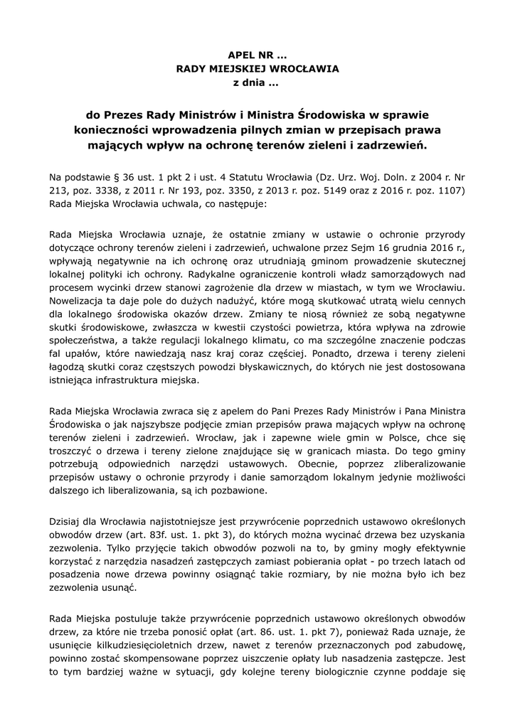 APEL NR ... RADY MIEJSKIEJ WROCŁAWIA z dnia ... do Prezes Rady Ministrów i Ministra Środowiska w sprawie konieczności wprowadzenia pilnych zmian w przepisach prawa mających wpływ na ochronę terenów zieleni i zadrzewień. Na podstawie § 36 ust. 1 pkt 2 i ust. 4 Statutu Wrocławia (Dz. Urz. Woj. Doln. z 2004 r. Nr 213, poz. 3338, z 2011 r. Nr 193, poz. 3350, z 2013 r. poz. 5149 oraz z 2016 r. poz. 1107) Rada Miejska Wrocławia uchwala, co następuje: Rada Miejska Wrocławia uznaje, że ostatnie zmiany w ustawie o ochronie przyrody dotyczące ochrony terenów zieleni i zadrzewień, uchwalone przez Sejm 16 grudnia 2016 r., wpływają negatywnie na ich ochronę oraz utrudniają gminom prowadzenie skutecznej lokalnej polityki ich ochrony. Radykalne ograniczenie kontroli władz samorządowych nad procesem wycinki drzew stanowi zagrożenie dla drzew w miastach, w tym we Wrocławiu. Nowelizacja ta daje pole do dużych nadużyć, które mogą skutkować utratą wielu cennych dla lokalnego środowiska okazów drzew. Zmiany te niosą również ze sobą negatywne skutki środowiskowe, zwłaszcza w kwestii czystości powietrza, która wpływa na zdrowie społeczeństwa, a także regulacji lokalnego klimatu, co ma szczególne znaczenie podczas fal upałów, które nawiedzają nasz kraj coraz częściej. Ponadto, drzewa i tereny zieleni łagodzą skutki coraz częstszych powodzi błyskawicznych, do których nie jest dostosowana istniejąca infrastruktura miejska. Rada Miejska Wrocławia zwraca się z apelem do Pani Prezes Rady Ministrów i Pana Ministra Środowiska o jak najszybsze podjęcie zmian przepisów prawa mających wpływ na ochronę terenów zieleni i zadrzewień. Wrocław, jak i zapewne wiele gmin w Polsce, chce się troszczyć o drzewa i tereny zielone znajdujące się w granicach miasta. Do tego gminy potrzebują odpowiednich narzędzi ustawowych. Obecnie, poprzez zliberalizowanie przepisów ustawy o ochronie przyrody i danie samorządom lokalnym jedynie możliwości dalszego ich liberalizowania, są ich pozbawione. Dzisiaj dla Wrocławia najistotniejsze jest przywrócenie poprzednich ustawowo określonych obwodów drzew (art. 83f. ust. 1. pkt 3), do których można wycinać drzewa bez uzyskania zezwolenia. Tylko przyjęcie takich obwodów pozwoli na to, by gminy mogły efektywnie korzystać z narzędzia nasadzeń zastępczych zamiast pobierania opłat - po trzech latach od posadzenia nowe drzewa powinny osiągnąć takie rozmiary, by nie można było ich bez zezwolenia usunąć. Rada Miejska postuluje także przywrócenie poprzednich ustawowo określonych obwodów drzew, za które nie trzeba ponosić opłat (art. 86. ust. 1. pkt 7), ponieważ Rada uznaje, że usunięcie kilkudziesięcioletnich drzew, nawet z terenów przeznaczonych pod zabudowę, powinno zostać skompensowane poprzez uiszczenie opłaty lub nasadzenia zastępcze. Jest to tym bardziej ważne w sytuacji, gdy kolejne tereny biologicznie czynne poddaje się presji urbanizacyjnej. Rada Miejska apeluje również o wprowadzenie przepisu o konieczności zgłoszenia chęci usunięcia drzewa przez osobę fizyczną na terenie prywatnym (analogicznie do zgłaszania budów w prawie budowlanym) i danie gminom możliwości wydania tzw. milczącej zgody lub wszczęcia postępowania, jeśli urzędnik uzna, że osoba fizyczna chce usunąć drzewo cenne z punktu widzenia przyrodniczego lub krajobrazowego. Do zgłoszenia powinny być dołączone fotografie, które pozwolą szybko podjąć decyzję, czy postępowanie powinno zostać wszczęte czy nie. Taka konstrukcja przepisów pozwoli gminom na monitoring wycinek w swoich granicach administracyjnych, a jednocześnie na zmniejszenie ilości pracy nad wnioskami składanymi przez osoby fizyczne. Dodatkowo, da możliwość zareagowania i odmowy usunięcia cennych okazów. Jednocześnie, realizując ideę decentralizacji, można dać samorządom możliwość określenia, wycięcia jakich drzew (jakich gatunków, czy rozmiarów) osoba fizyczna nie musiałaby zgłaszać. Zmiany powinny objąć również sferę przepisów dotyczących ustawowych stawek opłat za wycinkę drzew poprzez podniesienie maksymalnej stawki opłaty za 1 cm obwodu drzewa do min. 800 zł. Pozwoli to na realne kształtowanie lokalnych stawek opłat w zależności od wielkości drzewa i jego gatunku. Zbyt niskie kwoty za usunięcie drzewa oznaczają również niskie kary, które stanowią obecnie dwukrotność opłaty. Niesie to zagrożenie, że niektórzy inwestorzy nie będą legalnie wycinać drzew, tylko wliczać kary do kosztów przedsięwzięcia. Uniemożliwia to samorządom ochronę drzew na terenie inwestycji, nawet jeżeli byłoby możliwe jej przeprowadzenie bez wycinania wszystkich drzew. Ponadto, drzewa pełnią wiele funkcji środowiskowych o określonej wartości - ich usunięcie to pozbawienie gminy usług przez nie świadczonych, a więc konkretna strata. Odpowiednio wysokie stawki opłaty pełnią także funkcję zniechęcającą do wycinek w skali większej niż to konieczne. Rada Miejska Wrocławia wyraża przekonanie, że wprowadzenie postulowanych regulacji będzie skutkowało wymiernymi efektami w zakresie poprawy ochrony terenów zieleni i zadrzewień.