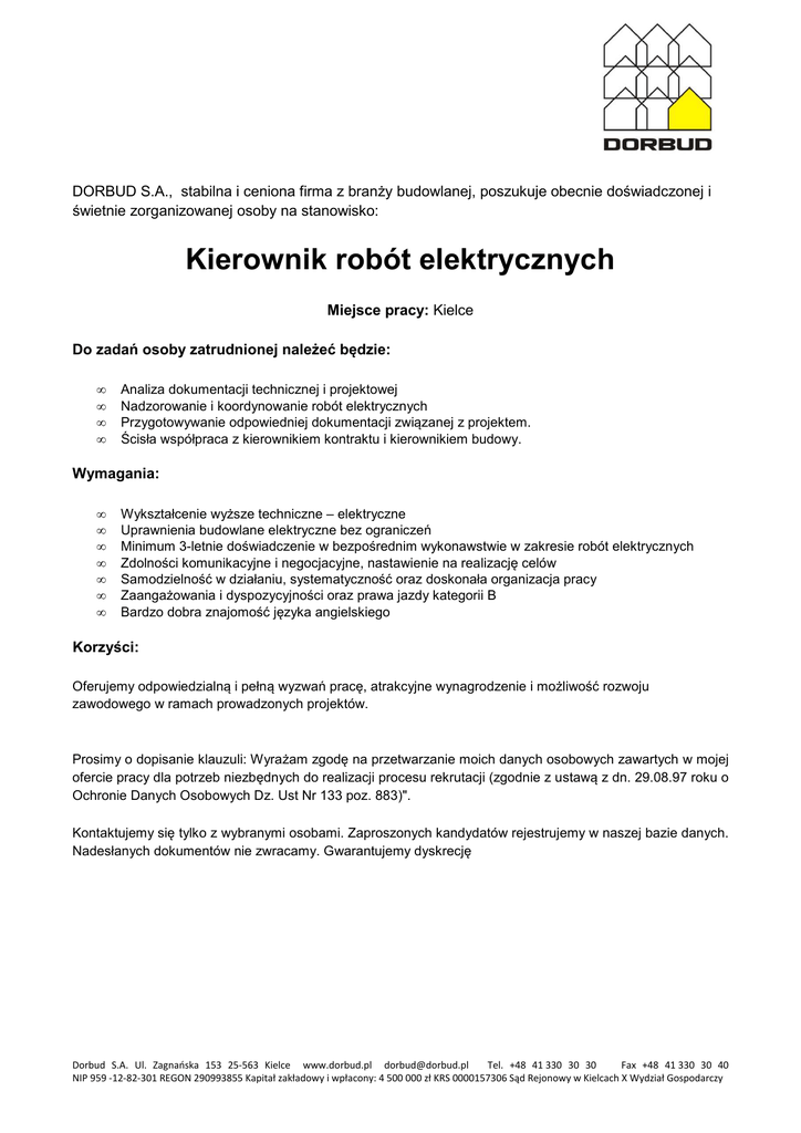 DORBUD S.A., stabilna i ceniona firma z branży budowlanej, poszukuje obecnie doświadczonej i świetnie zorganizowanej osoby na stanowisko: Kierownik robót elektrycznych Miejsce pracy: Kielce Do zadań osoby zatrudnionej należeć będzie: • • • • Analiza dokumentacji technicznej i projektowej Nadzorowanie i koordynowanie robót elektrycznych Przygotowywanie odpowiedniej dokumentacji związanej z projektem. Ścisła współpraca z kierownikiem kontraktu i kierownikiem budowy. Wymagania: • • • • • • • Wykształcenie wyższe techniczne – elektryczne Uprawnienia budowlane elektryczne bez ograniczeń Minimum 3-letnie doświadczenie w bezpośrednim wykonawstwie w zakresie robót elektrycznych Zdolności komunikacyjne i negocjacyjne, nastawienie na realizację celów Samodzielność w działaniu, systematyczność oraz doskonała organizacja pracy Zaangażowania i dyspozycyjności oraz prawa jazdy kategorii B Bardzo dobra znajomość języka angielskiego Korzyści: Oferujemy odpowiedzialną i pełną wyzwań pracę, atrakcyjne wynagrodzenie i możliwość rozwoju zawodowego w ramach prowadzonych projektów. Prosimy o dopisanie klauzuli: Wyrażam zgodę na przetwarzanie moich danych osobowych zawartych w mojej ofercie pracy dla potrzeb niezbędnych do realizacji procesu rekrutacji (zgodnie z ustawą z dn. 29.08.97 roku o Ochronie Danych Osobowych Dz. Ust Nr 133 poz. 883)". Kontaktujemy się tylko z wybranymi osobami. Zaproszonych kandydatów rejestrujemy w naszej bazie danych. Nadesłanych dokumentów nie zwracamy. Gwarantujemy dyskrecję Dorbud S.A. Ul. Zagnańska 153 25-563 Kielce www.dorbud.pl [email protected] Tel. +48 41 330 30 30 Fax +48 41 330 30 40 NIP 959 -12-82-301 REGON 290993855 Kapitał zakładowy i wpłacony: 4 500 000 zł KRS 0000157306 Sąd Rejonowy w Kielcach X Wydział Gospodarczy