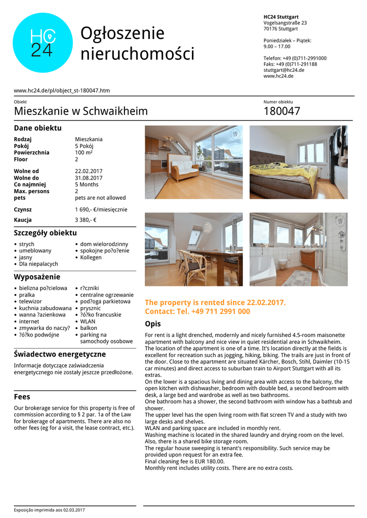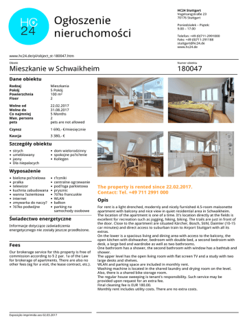 Ogłoszenie nieruchomości HC24 Stuttgart Vogelsangstraße 23 70176 Stuttgart Poniedziałek – Piątek: 9.00 – 17.00 Telefon: +49 (0)711-2991000 Faks: +49 (0)711-291188 [email protected] www.hc24.de www.hc24.de/pl/object_st-180047.htm Obiekt Numer obiektu Mieszkanie w Schwaikheim 180047 Dane obiektu Rodzaj Pokój Powierzchnia Floor Mieszkania 5 Pokój 100 m² 2 Wolne od Wolne do Co najmniej Max. persons pets 22.02.2017 31.08.2017 5 Months 2 pets are not allowed Czynsz 1 690,- €/miesięcznie Kaucja 3 380,- € Szczegóły obiektu strych umeblowany jasny Dla niepalacych dom wielorodzinny spokojne po?o?enie Kollegen Wyposażenie bielizna po?cielowa pralka telewizor kuchnia zabudowana wanna ?azienkowa internet zmywarka do naczy? ?ó?ko podwójne r?czniki centralne ogrzewanie pod?oga parkietowa prysznic ?ó?ko francuskie WLAN balkon parking na samochody osobowe Świadectwo energetyczne Informacje dotyczące zaświadczenia energetycznego nie zostały jeszcze przedłożone. Fees Our brokerage service for this property is free of commission according to § 2 par. 1a of the Law for brokerage of apartments. There are also no other fees (eg for a visit, the lease contract, etc.). Exposição imprimida aos 02.03.2017 Powered by TCPDF (www.tcpdf.org) The property is rented since 22.02.2017. Contact: Tel. +49 711 2991 000 Opis For rent is a light drenched, modernly and nicely furnished 4.5-room maisonette apartment with balcony and nice view in quiet residential area in Schwaikheim. The location of the apartment is one of a time. It's location directly at the fields is excellent for recreation such as jogging, hiking, biking. The trails are just in front of the door. Close to the apartment are situated Kärcher, Bosch, Stihl, Daimler (10-15 car minutes) and direct access to suburban train to Airport Stuttgart with all its extras. On the lower is a spacious living and dining area with access to the balcony, the open kitchen with dishwasher, bedroom with double bed, a second bedroom with desk, a large bed and wardrobe as well as two bathrooms. One bathroom has a shower, the second bathroom with window has a bathtub and shower. The upper level has the open living room with flat screen TV and a study with two large desks and shelves. WLAN and parking space are included in monthly rent. Washing machine is located in the shared laundry and drying room on the level. Also, there is a shared bike storage room. The regular house sweeping is tenant's responsibility. Such service may be provided upon request for an extra fee. Final cleaning fee is EUR 180.00. Monthly rent includes utility costs. There are no extra costs.