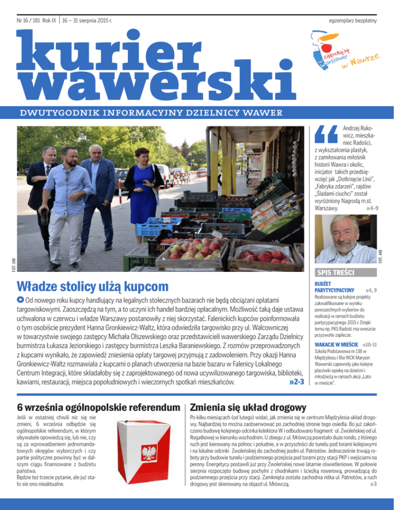 Nr 16 / 181 Rok IX 16 – 31 sierpnia 2015 r. egzemplarz bezpłatny fot. UM fot. am Andrzej Rukowicz, mieszkaniec Radości, z wykształcenia plastyk, z zamiłowania miłośnik historii Wawra i okolic, inicjator takich przedsięwzięć jak „Dotknięcie Linii”, „Fabryka zdarzeń”, rajdów „Śladami ciuchci” został wyróżniony Nagrodą m.st. Warszawy. »4-9 Spis treści Władze stolicy ulżą kupcom Od nowego roku kupcy handlujący na legalnych stołecznych bazarach nie będą obciążani opłatami targowiskowymi. Zaoszczędzą na tym, a to uczyni ich handel bardziej opłacalnym. Możliwość taką daje ustawa uchwalona w czerwcu i władze Warszawy postanowiły z niej skorzystać. Falenickich kupców poinformowała o tym osobiście prezydent Hanna Gronkiewicz-Waltz, która odwiedziła targowisko przy ul. Walcowniczej w towarzystwie swojego zastępcy Michała Olszewskiego oraz przedstawicieli wawerskiego Zarządu Dzielnicy burmistrza Łukasza Jeziorskiego i zastępcy burmistrza Leszka Baraniewskiego. Z rozmów przeprowadzonych z kupcami wynikało, że zapowiedź zniesienia opłaty targowej przyjmują z zadowoleniem. Przy okazji Hanna Gronkiewicz-Waltz rozmawiała z kupcami o planach utworzenia na bazie bazaru w Falenicy Lokalnego Centrum Integracji, które składałoby się z zaprojektowanego od nowa ucywilizowanego targowiska, biblioteki, kawiarni, restauracji, miejsca popołudniowych i wieczornych spotkań mieszkańców. »2-3 6 września ogólnopolskie referendum Zmienia się układ drogowy Jeśli w ostatniej chwili nic się nie zmieni, 6 września odbędzie się ogólnopolskie referendum, w którym obywatele opowiedzą się, lub nie, czy są za wprowadzeniem jednomandatowych okręgów wyborczych i czy partie polityczne powinny być w dalszym ciągu finansowane z budżetu państwa. Będzie też trzecie pytanie, ale już stało sie ono nieaktualne. Budżet parytycypacyjny »4, 9 Realizowane są kolejne projekty zakwalifikowane w wyniku powszechnych wyborów do realizacji w ramach budżetu partycypacyjnego 2015 r. Dzięki temu np. PKS Radość ma wreszcie przyzwoite zaplecze. wakacje w mieście »10-11 Szkoła Podstawowa nr 138 w Międzylesiu i filia WCK Marysin Wawerski zapewniły jako kolejne placówki opiekę na dziećmi i młodzieżą w ramach akcji „Lato w mieście”. Po kilku miesiącach (od lutego) widać, jak zmienia się w centrum Międzylesia układ drogowy. Najbardziej to można zaobserwować po zachodniej stronie tego osiedla. Bo już zakończono budowę kolejnego odcinka kolektora W i odbudowano fragment ul. Zwoleńskiej od ul. Rogatkowej w kierunku wschodnim. U zbiegu z ul. Mrówczą powstało duże rondo, z którego ruch jest kierowany na północ i południe, a w przyszłości do tunelu pod torami kolejowymi i na lokalne odcinki Zwoleńskiej do zachodniej jezdni ul. Patriotów. Jednocześnie trwają roboty przy budowie tunelu i podziemnego przejścia pod torami przy stacji PKP i wejściami na perony. Energetycy postawili już przy Zwoleńskiej nowe latarnie oświetleniowe. W połowie sierpnia rozpoczęto budowę pochylni z chodnikami i ścieżką rowerową, prowadzącą do podziemnego przejścia przy stacji. Zamknięta została zachodnia nitka ul. Patriotów, a ruch drogowy jest skierowany na objazd ul. Mrówczą. »3 2 OD MARYSINA PO FALENICĘ Kurier ekologiczny Kurier urzędowy | Korzystna dla kupców decyzja władz Warszawy Dobra wiadomość dla mieszkańców Wawra. Na skutek interwencji Zarządu Dzielnicy, od września wprowadzona jest zmiana częstotliwości odbioru odpadów zielonych. W ramach miejskiego systemu gospodarowania odpadami komunalnymi odbiór odpadów zielonych będzie prowadzony od kwietnia do listopada. W okresie od kwietnia do października odpady zielone będą odbierane raz na dwa tygodnie w zabudowie jednorodzinnej i raz w tygodniu w zabudowie wielolokalowej. Jedynie w listopadzie odpady zielone zostaną odebrane raz na cztery tygodnie. Zbiórka odpadów zielonych z zabudowy jednorodzinnej jest bezpośrednio sprzed posesji, a z nieruchomości o zabudowie wielolokalowej sprzed altan śmietnikowych. Odpady zielone powinny być umieszczane w półprzezroczystych workach o pojemności maksymalnie 120 litrów. Zapewnienie worków należy do właściciela nieruchomości. Od 1 stycznia 2016 r. handlujący na legalnych bazarach nie będą obciążani opłatami targowymi. Poinformowała o tym kupców falenickiego bazaru prezydent Warszawy Hanna Gronkiewicz-Waltz, podczas złożonej na nim wizyty. Zielone będą odbierane częściej Handel targowiskowy bezopłatowy mgr Konrada Wójcickiego wieloletniego Dyrektora XXVI Liceum Ogólnokształcącego im. gen. Henryka Jankowskiego „Kuby“ w warszawskim Aninie Wyrazy szczerego współczucia Rodzinie składa Zarząd i Rada Dzielnicy Wawer m.st. Warszawy fot. Um Michała Olszewskiego, także mieszkańca Wawra, oraz gospodarzy dzielnicy burmistrza Łukasza Jeziorskiego oraz zastępcy burmistrza Leszka Baraniewskiego. Wizyta nie była przypadkowa, falenickie targowisko zostało bowiem zakwalifikowane do kompletnej przebudowy, aby tworzyło Centrum Integracji Lokalnej, miejsca nie tylko czynnego w czasie pracy bazaru, ale także po godzinach jego zamknięcia, z osiedlową biblioteką, kawiarniami, restauracjami. Według wstępnych projektów powstaną nowe, estetyczne pawilony i wydzielone miejZ kupcami prezydent rozmawiała o zniesieniu opłaty targowej i planach modernisca do handlu ze stołów i ław. zacji falenickiego bazaru I o tym prezydent rozmawiała z kupcami oraz z mieszkańcami, którzy w tym czasie robili w Falenicy zakupy. Miłym akcentem dla Hanny Gronkiewicz-Waltz, która odwiedza ten bazar także jako osoba robiąca zakupy prywatnie, było wręczenie jej bukietu kwiatów przez Janinę Czajkę, która od lat sprzedaje warzywa oraz kwiaty w centralnej części targowiska. Panie rozmawiały nie tylko o problemach handlowych. Jeden z kupców owocowo-warzywnych zwrócił prezydent uwagę, 