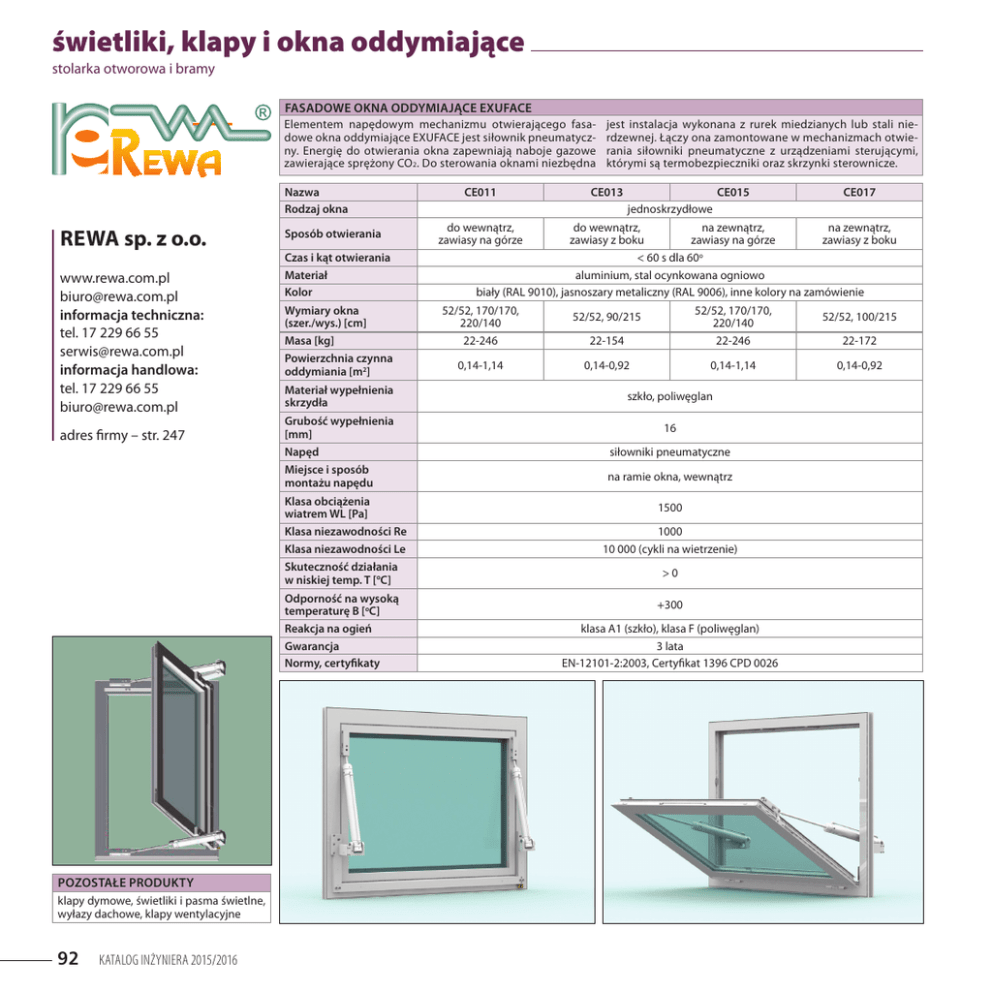 świetliki, klapy i okna oddymiające stolarka otworowa i bramy FASADOWE OKNA ODDYMIAJĄCE EXUFACE Elementem napędowym mechanizmu otwierającego fasadowe okna oddymiające EXUFACE jest siłownik pneumatyczny. Energię do otwierania okna zapewniają naboje gazowe zawierające sprężony CO2. Do sterowania oknami niezbędna Nazwa Rodzaj okna REWA sp. z o.o. www.rewa.com.pl [email protected] informacja techniczna: tel. 17 229 66 55 [email protected] informacja handlowa: tel. 17 229 66 55 [email protected] adres firmy – str. 247 Sposób otwierania Czas i kąt otwierania Materiał Kolor Wymiary okna (szer./wys.) [cm] Masa [kg] Powierzchnia czynna oddymiania [m2] 92 Katalog Inżyniera 2015/2016 CE013 CE015 CE017 jednoskrzydłowe do wewnątrz, do wewnątrz, na zewnątrz, na zewnątrz, zawiasy na górze zawiasy z boku zawiasy na górze zawiasy z boku < 60 s dla 60o aluminium, stal ocynkowana ogniowo biały (RAL 9010), jasnoszary metaliczny (RAL 9006), inne kolory na zamówienie 52/52, 170/170, 52/52, 170/170, 52/52, 90/215 52/52, 100/215 220/140 220/140 22-246 22-154 22-246 22-172 0,14-1,14 0,14-0,92 0,14-1,14 szkło, poliwęglan Grubość wypełnienia [mm] Napęd Miejsce i sposób montażu napędu siłowniki pneumatyczne Odporność na wysoką temperaturę B [oC] Reakcja na ogień Gwarancja Normy, certyfikaty POZOSTAŁE PRODUKTY CE011 Materiał wypełnienia skrzydła Klasa obciążenia wiatrem WL [Pa] Klasa niezawodności Re Klasa niezawodności Le Skuteczność działania w niskiej temp. T [oC] klapy dymowe, świetliki i pasma świetlne, wyłazy dachowe, klapy wentylacyjne jest instalacja wykonana z rurek miedzianych lub stali nierdzewnej. Łączy ona zamontowane w mechanizmach otwierania siłowniki pneumatyczne z urządzeniami sterującymi, którymi są termobezpieczniki oraz skrzynki sterownicze. 16 na ramie okna, wewnątrz 1500 1000 10 000 (cykli na wietrzenie) >0 +300 klasa A1 (szkło), klasa F (poliwęglan) 3 lata EN-12101-2:2003, Certyfikat 1396 CPD 0026 0,14-0,92