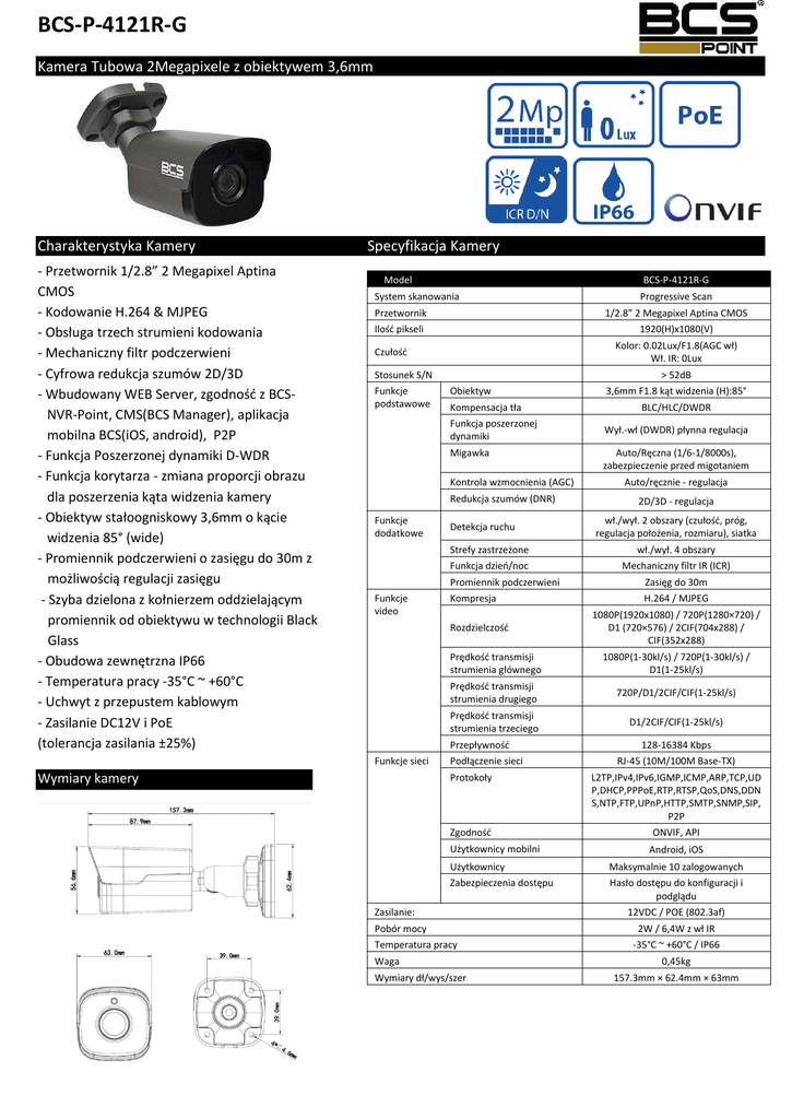 BCS-P-4121R-G Kamera Tubowa 2Megapixele z obiektywem 3,6mm Charakterystyka Kamery - Przetwornik 1/2.8” 2 Megapixel Aptina CMOS - Kodowanie H.264 & MJPEG - Obsługa trzech strumieni kodowania - Mechaniczny filtr podczerwieni - Cyfrowa redukcja szumów 2D/3D - Wbudowany WEB Server, zgodność z BCSNVR-Point, CMS(BCS Manager), aplikacja mobilna BCS(iOS, android), P2P - Funkcja Poszerzonej dynamiki D-WDR - Funkcja korytarza - zmiana proporcji obrazu dla poszerzenia kąta widzenia kamery - Obiektyw stałoogniskowy 3,6mm o kącie widzenia 85° (wide) - Promiennik podczerwieni o zasięgu do 30m z możliwością regulacji zasięgu - Szyba dzielona z kołnierzem oddzielającym promiennik od obiektywu w technologii Black Glass - Obudowa zewnętrzna IP66 - Temperatura pracy -35°C ~ +60°C - Uchwyt z przepustem kablowym - Zasilanie DC12V i PoE (tolerancja zasilania ±25%) Specyfikacja Kamery Model BCS-P-4121R-G System skanowania Przetwornik 1/2.8” 2 Megapixel Aptina CMOS Ilość pikseli 1920(H)x1080(V) Kolor: 0.02Lux/F1.8(AGC wł) Wł. IR: 0Lux Czułość Stosunek S/N Funkcje podstawowe > 52dB Obiektyw Kompensacja tła Funkcja poszerzonej dynamiki Migawka Kontrola wzmocnienia (AGC) Redukcja szumów (DNR) Funkcje dodatkowe Funkcje video Detekcja ruchu BLC/HLC/DWDR Wył.-wł (DWDR) płynna regulacja Auto/Ręczna (1/6-1/8000s), zabezpieczenie przed migotaniem Auto/ręcznie - regulacja 2D/3D - regulacja wł./wył. 2 obszary (czułość, próg, regulacja położenia, rozmiaru), siatka wł./wył. 4 obszary Funkcja dzień/noc Mechaniczny filtr IR (ICR) Promiennik podczerwieni Zasięg do 30m Kompresja H.264 / MJPEG 1080P(1920x1080) / 720P(1280×720) / D1 (720×576) / 2CIF(704x288) / CIF(352x288) Prędkość transmisji strumienia głównego 1080P(1-30kl/s) / 720P(1-30kl/s) / D1(1-25kl/s) Prędkość transmisji strumienia drugiego 720P/D1/2CIF/CIF(1-25kl/s) Prędkość transmisji strumienia trzeciego D1/2CIF/CIF(1-25kl/s) Przepływność Wymiary kamery 3,6mm F1.8 kąt widzenia (H):85° Strefy zastrzeżone Rozdzielczość Funkcje sieci Progressive Scan Podłączenie sieci Protokoły Zgodność Użytkownicy mobilni 128-16384 Kbps RJ-45 (10M/100M Base-TX) L2TP,IPv4,IPv6,IGMP,ICMP,ARP,TCP,UD P,DHCP,PPPoE,RTP,RTSP,QoS,DNS,DDN S,NTP,FTP,UPnP,HTTP,SMTP,SNMP,SIP, P2P ONVIF, API Android, iOS Użytkownicy Maksymalnie 10 zalogowanych Zabezpieczenia dostępu Hasło dostępu do konfiguracji i podglądu Zasilanie: Pobór mocy Temperatura pracy Waga Wymiary dł/wys/szer 12VDC / POE (802.3af) 2W / 6,4W z wł IR -35°C ~ +60°C / IP66 0,45kg 157.3mm × 62.4mm × 63mm BCS-P-4121R-G Akcesoria BCS-P-A32 BCS-P-A61
