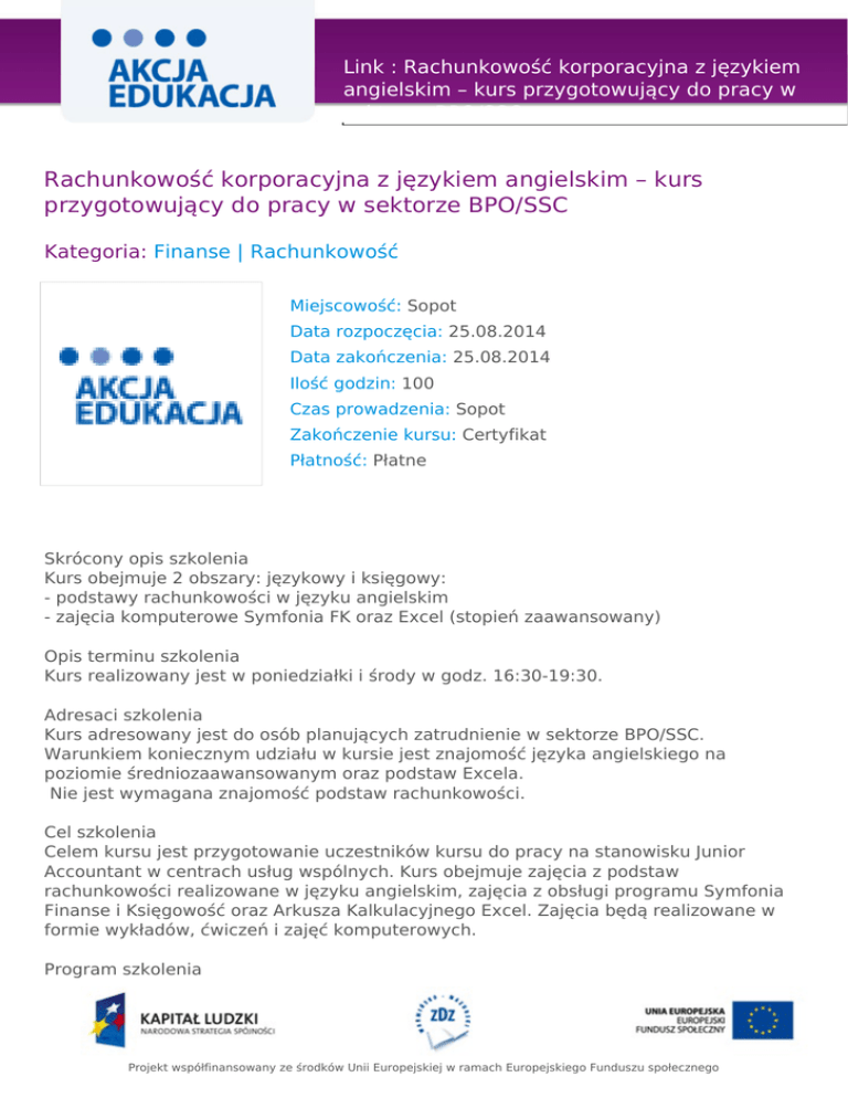 Link : Rachunkowość korporacyjna z językiem angielskim – kurs przygotowujący do pracy w sektorze BPO/SSC Rachunkowość korporacyjna z językiem angielskim – kurs przygotowujący do pracy w sektorze BPO/SSC Kategoria: Finanse | Rachunkowość Miejscowość: Sopot Data rozpoczęcia: 25.08.2014 Data zakończenia: 25.08.2014 Ilość godzin: 100 Czas prowadzenia: Sopot Zakończenie kursu: Certyfikat Płatność: Płatne Skrócony opis szkolenia Kurs obejmuje 2 obszary: językowy i księgowy: - podstawy rachunkowości w języku angielskim - zajęcia komputerowe Symfonia FK oraz Excel (stopień zaawansowany) Opis terminu szkolenia Kurs realizowany jest w poniedziałki i środy w godz. 16:30-19:30. Adresaci szkolenia Kurs adresowany jest do osób planujących zatrudnienie w sektorze BPO/SSC. Warunkiem koniecznym udziału w kursie jest znajomość języka angielskiego na poziomie średniozaawansowanym oraz podstaw Excela. Nie jest wymagana znajomość podstaw rachunkowości. Cel szkolenia Celem kursu jest przygotowanie uczestników kursu do pracy na stanowisku Junior Accountant w centrach usług wspólnych. Kurs obejmuje zajęcia z podstaw rachunkowości realizowane w języku angielskim, zajęcia z obsługi programu Symfonia Finanse i Księgowość oraz Arkusza Kalkulacyjnego Excel. Zajęcia będą realizowane w formie wykładów, ćwiczeń i zajęć komputerowych. Program szkolenia Projekt współfinansowany ze środków Unii Europejskiej w ramach Europejskiego Funduszu społecznego Link : Rachunkowość korporacyjna z językiem angielskim – kurs przygotowujący do pracy w sektorze BPO/SSC I. Podstawy rachunkowości (48 godzin) 1. Zasoby majątkowe i źródła ich finansowania. 2. Bilans. 3. Operacje gospodarcze i ich wpływ na składniki bilansu. 4. Konto księgowe i zapis operacji gospodarczych na kontach bilansowych. 5. Zestawienie obrotów i sald kont księgi głównej. 6. Podzielność kont (konta syntetyczne i analityczne, konto ”środki trwałe” i ”umorzenie środków trwałych”, konta rozrachunków - zasady funkcjonowania). 7. Zestawienie obrotów i sald kont księgi pomocniczej. 8. Środki pieniężne, rozrachunki i formy ich regulowania. 9. Wycena obrotu zapasami materiałów. 10. Ewidencja środków trwałych, sporządzanie tabeli amortyzacyjnych. 11. Wynagrodzenia i inne rozrachunki z pracownikami. 12. Konta wynikowe – przychody i koszty. 13. Podatek od towarów i usług (VAT) w systemie ewidencji księgowej. II. Excel (32 godziny) 1. Wykorzystanie zaawansowanych funkcji Excela: tekstowych, logicznych, finansowych, statystycznych, baz danych, dat, godzin i czasu. 2. Tworzenie raportów z wykorzystaniem tabeli przestawnej. 3. Importowanie danych do Excela z zewnętrznych źródeł. 4. Zastosowanie i tworzenie makr w Excelu. 5. Graficzne przedstawienie danych. 6. Ochrona arkusza i skoroszytu. III. System ERP SYMFONIA FK (20 godzin) 1. Zasady pracy w programie Symfonia Finanse i Księgowość. 2. Praca na kartotekach klientów i pracowników. 3. Wprowadzanie dowodów księgowych (z uwzględnieniem rejestrów VAT). 4. Raport kasowy i uzgodnienia stanu gotówki. 5. Rozliczanie rozrachunków. 6. Przeglądanie, wydruk rejestrów. 7. Przeglądanie, wydruk zapisów oraz obrotów na kontach. 8. Eksport danych księgowych do Excela oraz plików PDF. Opis metodyki szkolenia Zajęcia będą realizowane w formie wykładów, ćwiczeń i zajęć komputerowych. Kwalifikacje po ukończeniu szkolenia Kurs kończy się wydaniem zaświadczenia zgodnego z rozporządzeniem Ministra Projekt współfinansowany ze środków Unii Europejskiej w ramach Europejskiego Funduszu społecznego Link : Rachunkowość korporacyjna z językiem angielskim – kurs przygotowujący do pracy w sektorze BPO/SSC Edukacji Narodowej. ODDK Sp. z o.o. Sp.k. tel. 58 735 72 45 e-mail: [email protected] Osoba kontaktowa: Milena Jaroszuk Godziny pracy: 8-16 ul. Obrońców Westerplatte 32 a 80-317 Gdańsk Projekt współfinansowany ze środków Unii Europejskiej w ramach Europejskiego Funduszu społecznego Powered by TCPDF (www.tcpdf.org)