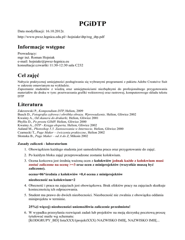 PGiDTP Data modyfikacji: 16.10.2012r. http://www.pwsz.legnica.edu.pl/~hojniakr/dtp/reg_dtp.pdf Informacje wstępne Prowadzący: mgr inż. Roman Hojniak e-mail: [email protected] konsultacje:czwartki 11:30-12:30 sala C232 Cel zajęć Nabycie praktycznej umiejętności posługiwania się wybranymi programami z pakietu Adobe Createive Suit w zakresie omawianym na wykładzie. Zapoznanie studentów z wiedzą oraz umiejętnościami niezbędnymi do profesjonalnego przygotowania materiałów do druku w tym: przetwarzania grafiki wektorowej oraz rastrowej, komputerowego składu tekstu DTP Literatura Zakrzewski P., Kompendium DTP, Helion, 2009 Busch D., Fotografia cyfrowa i obróbka obrazu. Wprowadzenie, Helion, Gliwice 2002 Kwaśny A., Od skanera do drukarki, Helion, Gliwice 2001 Phyllis D., Po prostu GIMP, Helion, Gliwice 2000 Kwaśny A., DTP - Księga eksperta, Helion, Gliwice 2002 Aaland M., Photoshop 5.5. Zastosowania w Internecie, Helion, Gliwice 2000 Czarnecki T., Page Maker – ćwiczenia praktyczne, Helion 2002 Słomska B., Page Maker – od A do Z, Mikom 2002 Zasady zaliczeń - laboratorium 1. Obowiązkiem każdego studenta jest samodzielna praca oraz przygotowanie do zajęć. 2. Po każdym bloku zajęć przeprowadzone zostanie kolokwium. 3. Ocena końcowa jest średnią ważoną ocen z kolokwiów jednak każde z kolokwium musi zostać zaliczone na ocenę >=3 oraz ocen z miniprojektów (wszystkie muszą być zaliczone). ocena=06*średnia z kolokwiów +0,4 ocena z miniprojektów nieobecność na kolokwium=2 4. Obecność i praca na zajęciach jest obowiązkowa. Brak efektów pracy na zajęciach skutkuje koniecznością ich odpracowania. 5. Student ma prawo do dwóch nieobecności. Nieobecność nie zwalnia z obowiązku oddania miniprojektu w terminie. 25%(i więcej) nieobecności uniemożliwia zaliczenie przedmiotu! 6. W wypadku przesyłania rozwiązań zadań lub projektów na moją skrzynkę pocztową proszę tytułować maile wg schematu: [KODGRUPY_BD] listaXXX/(projektXXX) NAZWISKO IMIĘ, NAZWISKO IMIĘ... Przykład: Jan Kowalski z grupy o kodzie s3GK2 wysyłają dokument dot projektu nr 2. Swój mail powinni zatytułować: [s1GK2] projekt2 Kowalski Jan UWAGA! Brak stosowania powyższej adresacji powoduje, że list traktowany jest jako SPAM i podlega skasowaniu bez przeczytania