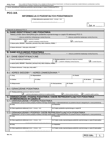 POLTAX POLA JASNE WYPEŁNIA PODATNIK, POLA CIEMNE WYPEŁNIA ORGAN PODATKOWY. WYPEŁNIĆ NA MASZYNIE, KOMPUTEROWO LUB RĘCZNIE, DUŻYMI, DRUKOWANYMI LITERAMI, CZARNYM LUB NIEBIESKIM KOLOREM. 1. Numer Identyfikacji Podatkowej podatnika wymienionego w części B deklaracji PCC-3 └────┴────┴────┴────┴────┴────┴────┴────┴────┴────┴────┴────┴────┘ PCC-3/A INFORMACJA O POZOSTAŁYCH PODATNIKACH 2. Data dokonania czynności (dzień - miesiąc - rok) └────┴────┘-└────┴────┘-└────┴────┴────┴────┘ 3. Zał. nr └────┴────┘ Załącznik do deklaracji PCC-3. A. DANE IDENTYFIKACYJNE PODATNIKA Należy podać dane identyfikacyjne podatnika wymienionego w części B deklaracji PCC-3. * - dotyczy podatnika niebędącego osobą fizyczną ** - dotyczy podatnika będącego osobą fizyczną 4. Rodzaj podatnika (zaznaczyć właściwy kwadrat): q 1. podatnik niebędący osobą fizyczną q 2. osoba fizyczna 5. Nazwa pełna, REGON* / Nazwisko, pierwsze imię, data urodzenia, PESEL ** 6. Nazwa skrócona* / Imię ojca, imię matki ** B. DANE KOLEJNEGO PODATNIKA * - dotyczy podatnika niebędącego osobą fizyczną ** - dotyczy podatnika będącego osobą fizyczną B.1. DANE IDENTYFIKACYJNE 7. Numer Identyfikacji Podatkowej 8. Rodzaj podatnika (zaznaczyć właściwy kwadrat): └────┴────┴────┴────┴────┴────┴────┴────┴────┴────┴────┴────┴────┘ q 1. podatnik niebędący osobą fizyczną q 2. osoba fizyczna 9. Nazwa pełna, REGON* / Nazwisko, pierwsze imię, data urodzenia, PESEL ** 10. Nazwa skrócona* / Imię ojca, imię matki ** B.2. ADRES SIEDZIBY * / ADRES ZAMIESZKANIA ** 11. Kraj 14. Gmina 12. Województwo 13. Powiat 15. Ulica 18. Miejscowość 16. Nr domu 19. Kod pocztowy 17. Nr lokalu 20. Poczta B.3. OZNACZENIE PODATNIKA 21. Rodzaj podmiotu (zaznaczyć właściwy kwadrat): q 1. podmiot zobowiązany solidarnie do zapłaty podatku q 2. strona umowy zamiany q 3. wspólnik spółki cywilnej C. OŚWIADCZENIE I PODPIS PODATNIKA I OSÓB REPREZENTUJĄCYCH PODATNIKA WYMIENIONEGO W CZĘŚCI B C.1. OŚWIADCZENIE I PODPIS PODATNIKA Oświadczam, że są mi znane przepisy Kodeksu karnego skarbowego o odpowiedzialności za podanie danych niezgodnych z rzeczywistością. 22. Imię 23. Nazwisko 24. Data wypełnienia deklaracji (dzień - miesiąc - rok) 25. Podpis podatnika wymienionego w części B └────┴────┘-└────┴────┘-└────┴────┴────┴────┘ C.2. OŚWIADCZENIA I PODPISY OSÓB REPREZENTUJĄCYCH PODATNIKA Oświadczam, że są mi znane przepisy Kodeksu karnego skarbowego o odpowiedzialności za podanie danych niezgodnych z rzeczywistością. 26. Imię 27. Nazwisko 28. Data wypełnienia deklaracji (dzień - miesiąc - rok) 29. Podpis osoby reprezentującej podatnika wymienionego w części B (pieczątka) └────┴────┘-└────┴────┘-└────┴────┴────┴────┘ 30. Imię 31. Nazwisko 32. Data wypełnienia deklaracji (dzień - miesiąc - rok) 33. Podpis osoby reprezentującej podatnika wymienionego w części B (pieczątka) └────┴────┘-└────┴────┘-└────┴────┴────┴────┘ Min. Fin. PCC-3/A(1) 1/1