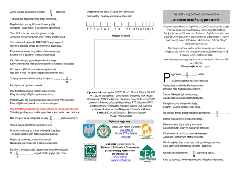 Za nią twierdza się znajduje, w której _ _ _ _ _ _ stacjonuje. 4 To batalion R. Traugutta co nie znosił nigdy knuta. Niegdyś roty tu służyły, które naród nasz gnębiły. Iwangorod - tak ją zwano, a przez Dehna zbudowaną. Teraz W P tu bazuje mosty i drogi nam buduje, A w czasie klęsk żywiołowych życie i mienie ludziom ratuje. Odgadnięte hasło powie Ci, gdzie jest skarb ukryty. „Szlakiem dęblińskiej przeszłości” 1 2 3 4 5 6 7 8 9 10 11 12 13 14 15 16 17 Miejsce na skarb Tuż za bramą do jednostki „MAŁPI GAJ” kiedyś zagościł. Na nim to żołnierza ćwiczą za sprawnością zasadniczą. Wędrówka po przygodę rozpoczyna się na dworcu PKP w Dęblinie. Czas przejścia: ok. 1 godz. Idąc dalej równą drogą na kasyno depniesz nogą. Kiedyś w nim bawiło wielu znanych jegomości, nawet car tutaj gościł. Od kasyna pójdź ku torom, które wiodą do reduty. Idąc dalej w lewo i na wprost wejdziesz na drogowy most. P rzyjedziesz_ _ _ _ _ _ _ _ _z daleka, Tuż przy torach na zielonej tablicy 3km jest do _ _ _ _ _ _ _ _ _ _, 13 Lecz ty tam nie będziesz zmierzał. Podejdź wyżej, aby z asfaltowej zatoki nacieszyć się Wisły widokiem, Którą z Dęblina od przeszło stu lat dwa mosty spina. Przed mostem przejdziesz przez drogę krajową nr 48 na pojazdy bacząc! Za trójkątnym drogowym znakiem pójdziesz w lewo, w dół czasu nie tracąc Nad brzegiem Wisły zatrzymasz się przy _ _ _ _ _ _ _ polskich żołnierzy, 3 Wielu z nich na cmentarzu komunalnym leży. Przekroczysz bramę do stanicy wodnej się skierujesz, Tam gdzie obecnie MDK dęblińską kulturę promuje. Możesz tu zaśpiewać, zatańczyć w zespole, Namalować, narysować coś w zainteresowań kole. Do MDK-u możesz przyjść każdego dnia z wyjątkiem niedzieli. W _ _ _ _ _ _ _ _ _ _ _ _ od godz.10.00, gdybyś tylko chciał. 8 Wyprawa po skarb w Dęblinie ukaże Ci zachodnią część miasta, jego niepowtarzalny urok i bogatą historię. Znajduje się tu XIX wieczna Twierdza Dęblin i zabytkowy zespół Dworca Kolei Nadwiślańskiej, a podczas II wojny światowej sława lotników z dęblińskiej „Szkoły Orląt” obiegła cały świat. Dęblin położony jest w południowej części ujścia Wieprza do Wisły, na skrzyżowaniu drogi krajowej nr 48 z drogą wojewódzką nr 801. Po przeciwnej stronie drogi piłkarz zdziera swoje nogi, Lecz nie robi to samotnie, tenisista wielokrotniej. Przed mostem po lewo z herbem witacz wyrasta, Który wita nie tylko Dęblina partnerskie miasta. Quest – wyprawa odkrywców Bądź uważny i cierpliwy oraz szczere chęci miał. 7 Tu skarb w Dęblinie na Ciebie już czeka. Wysiądziesz przed budynkiem drewnianym, Dworcem Kolei Nadwiślańskiej zwanym. Opracowanie: nauczyciele SOSW, SP nr 2, SP nr 6, ZS nr 3, LO, ZSZ nr 1, ZSZ nr 2 w Dęblinie, 1 LO w Rykach; pracownicy MDK i Klubu Uczelnianego WSOSP w Dęblinie; członkowie Grupy Historycznej 15 PP „Wilków” w Puławach, Oddziału Dęblińskiego PTT, Oddziałów PTTK z Dęblina i Puław, Towarzystwa Przyjaciół Dęblina, UKS „Czwórka” w Dęblinie; Kustosz Muzeum Nietypowych Rowerów w Gołębiu Korekta: Krzysztof Karbowski i Stanisław Sadurski Mapa: Anna Krawczak Opiekun wyprawy: Miejski Dom Kultury w Dęblinie www.deblin.pl Oddział PTT w Dęblinie www.ptt.pl Questing jest rozwijany na Zielonych Szlakach – Greenways przez Fundację Partnerstwo dla Środowiska www.fpds.pl www.greenways.pl Za cara Mikołaja II był wybudowany, A na początku XXI w.został rewitalizowany. Pamięta budowla Iwangorodu dzieje, Legendy i Dęblina burzliwe losów koleje. Na elewacji dworca znajdziesz tablicę pamiątkową _ _ _ _ _ _ _ _ _ _, Upamiętniającą śmierć Polaka niejednego. 2 Miejscowi przed laty tę tablicę wmurowali, Ku pamięci ludzi, którzy na stacji życie postradali. Kilka kroków na zachód od dworca kolejowego, Zabytkowa lokomotywka zdobi perony jego. Nim do niej dojdziesz przejdziesz obok granitowego pomnika, Który upamiętnia bohaterstwo kolejarza - bojownika. Niedaleko od lokomotywki _ _ _ _ _ ciśnień się wznosi, 12 Która od dawna już wody do parowozów i mieszkań nie przenosi. Obok niej wyrasta rząd XIX wiecznych willi drewnianych I XX wiecznych kamienic skromnie malowanych. W oddali po prawo zobaczysz PRL - owskie bloki, Ku którym następnie skierujesz swoje kroki. Dojdziesz do ulicy Dworcowej, tutaj skręcisz w lewo, Przejdziesz wzdłuż dworca do strzeżonego przejazdu kolejowego. Idąc dalej ulicą Wiślaną napotkasz z krzyżem słupową kaplicę, Ufundowaną przed laty przez mieszkańców wsi _ _ _ _ _ _ . 11 Za nią miniesz biegnącą w lewo pilota Skarżyńskiego ulicę, Co prowadzi przez osiedle domów jednorodzinnych - „Żwicę”. W jego sąsiedztwie miniesz pomnik Żołnierza _ _ _ _ _ _ _ _ _ _., 17 Następnie przejdziesz przez tory obok przedszkola i krzyża misyjnego. Gdy dotrzesz do ulicy Towarowej ujrzysz na wprost w niewielkiej oddali, Dwa kościoły, jeden modrzewiowy stary, drugi obecnie z cegły budowany. Kościół drewniany, XVIII wieczny, pierwotnie był w Łosicach cerkwią unicką, Później w Dęblinie – Irenie świątynią Rzymsko-katolicką. Następnie z centrum miasta w 1986 roku, Przeniesiony został w pobliże kolejarskich bloków. W pobliżu przejdziesz po pasach na drugą stronę Wiślanej ulicy, Aby pójść dalej skrajem noszącej tą samą nazwę dzielnicy. Idąc przed siebie dotrzesz do dawnego traktu Stężyckiego, Który wiedzie do reliktu fortu Nadwiślanka i cmentarza prawosławnego. Tą ulicą z fragmentami zabytkowej alei pójdziesz chodnikiem w lewo, Aż ujrzysz mury cmentarza _ _ _ _ _ _ _ _ _ _ _ . 6 1 Obok sklepów zwanych „podkówką” przejdziesz na drugą stronę, Następnie skręcisz w prawo i pójdziesz przed siebie. Będzie nadal świątynią kultu i kultury, Choć obok niej nowej wznoszą się potężne mury. Dotrzesz do cmentarza, przekroczysz jego wierzeje, By poznać jedną z nekropoli Dęblina oraz jej dzieje. Natomiast p