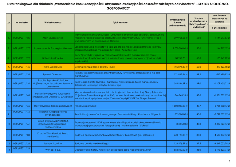 Lista rankingowa dla działania „Wzmocnienie konkurencyjności i utrzymanie atrakcyjności obszarów zależnych od rybactwa” – SEKTOR SPOŁECZNOGOSPODARCZY Limit środków L.p. Nr wniosku Wnioskodawca Tytuł wniosku Wzmocnienie konkurencyjności i utrzymanie atrakcyjności obszarów zależnych od rybactwa "Banga" poprzez przebudowę małej infrastruktury turystycznej wraz z wyposażeniem w miejscowości Oszkinie 1. LGR /I/2011/ 25 Albin Szuszczewicz 2. LGR /I/2011/ 77 Stowarzyszenie Euroregion Niemen Lokalna Telewizja Internetowa jako źródło promocji Lokalnej Strategii Rozwoju Obszaru Rybackiego "Pojezierze Suwalsko- Augustowskie" 3. LGR /I/2011/ 22 Bożena Kozłowska Rozwój turystyki wiejskiej w miejscowości Krzywólka poprzez remont małej infrastruktury turystycznej wraz z infrastrukturą towarzyszącą rozwojowi turystyki wędkarskiej 4. LGR /I/2011/ 45 Piotr Malczewski 5. LGR /I/2011/ 39 Ryszard Oberman 6. LGR /I/2011/ 20 Parafia Rzymsko- Katolicka Najświętszego Serca Pana Jezusa w Jeleniewie 7. LGR /I/2011/ 63 Wzmocnienie konkurencyjności i atrakcyjności obszaru Lokalnej Grupy Rybackiej Polskie Towarzystwo Turystyczno"Pojezierze Suwalsko- Augustowskie" poprzez budowę, przebudowę i remont małej Krajoznawcze Oddział w Suwałkach infrastruktury turystyki wodnej w Centrum Turystyki WIGRY w Starym Folwarku 8. LGR /I/2011/ 55 Stowarzyszenie Sięgać za horyzont LGR /I/2011/ 65 Wigierski Areopag Nowej Ewangelizacji Rewitalizacja eremów tarasu górnego Pokamedulskiego Klasztoru w Wigrach Promocja obszaru LSROR z powietrza, ziemi i spod wody i ukazanie możliwości wizualizacyjnych pracowni fotograficznej i multimedialnej "STURNUS" 9. 10. LGR /I/2011/ 61 Hubert Stojanowski/ STURNUSpracownia fotograficzna i multimedialna 11. LGR /I/2011/ 08 Krzysztof Stankiewicz/ Renta Stankiewicz 12. LGR /I/2011/ 26 Szymon Skowina 13. LGR /I/2011/ 24 "WIP" Sp. z o.o. Wnioskowana kwota dofinansowania Średnia arytmetyczna z listy "zgodność z kryteriami" finansowych na działanie 1 544 184,20 zł 399 966,63 zł 55,0 1 144 217,57 zł 1 000 000,00 zł 50,0 144 217,57 zł 38 967,75 zł 50,0 105 249,82 zł Czarna Hańcza Rzeka Bobrów i ludzi 495 876,80 zł 50,0 -390 626,98 zł Remont i modernizacja małej infrastruktury turystycznej przeznaczonej na cele agroturystyki 171 863,84 zł 49,2 -562 490,82 zł Renowacja Parafii Rzymsko - Katolickiej Najświętszego Serca Pana Jezusa w Jeleniewie - cennego zabytku barkowego 546 964,39 zł 49,0 -1 109 455,21 zł 45,0 -1 956 302,17 zł 40,7 -2 956 302,17 zł 835 000,00 zł 40,0 -3 791 302,17 zł 48 025,00 zł 40,0 -3 839 327,17 zł Pracownia przygód 846 846,96 zł 1 000 000,00 zł Budowa miejsc wypoczynkowych turystom w Leszczewie gm. Jeleniewo 678 120,00 zł 38,0 -4 517 447,17 zł Budowa punktu wędkarskiego 123 576,57 zł 37,5 -4 641 023,74 zł Dostosowanie hotelu Augustów do potrzeb osób niepełnosprawnych 552 500,00 zł 36,0 -5 193 523,74 zł 1 14. LGR /I/2011/ 23 Dorota Bykowska Rozwój turystyki wędkarskiej/wiejskiej w miejscowości Burbiszki poprzez budowę małej infrastruktury turystycznej wraz z infrastrukturą towarzyszącą rozwojowi tej turystyki 274 352,81 zł 34,3 -5 467 876,55 zł 15. LGR /I/2011/ 46 Grażyna Motybel Wzmocnienie konkurencyjności i utrzymanie atrakcyjności obszarów zależnych od rybactwa poprzez budowę małej infrastruktury turystyki wodnej w postaci pomostu pływającego z możliwością cumowania łodzi 114 733,17 zł 31,0 -5 582 609,72 zł 16. LGR /I/2011/ 12 Ewa Kulbacka Budowa miejsc noclegowych w Bryzglu gm. Nownika 203 129,00 zł 30,8 -5 785 738,72 zł 17. LGR /I/2011/ 75 Towarzystwo Twórczo- Edukacyjne Anael 30,0 -5 901 075,22 zł 18. LGR /I/2011/ 51 Wojciech Dyczewski Eko Przystań - Biała Perła 28,1 -6 077 880,18 zł 19. LGR /I/2011/ 05 Tadeusz Niedźwiecki Budowa miejsc wypoczynkowych nad jeziorem Blizienko gm. Nowinka 886 720,00 zł 25,0 -6 964 600,18 zł 20. LGR /I/2011/ 50 Agnieszka Mackiewicz Wędkowanie w Osinkach 85 472,20 zł 20,0 -7 050 072,38 zł 21. LGR /I/2011/ 43 Bora -Resting Karpowicz i wspólnicy Podniesienie atrakcyjności turystycznej pola namiotowego BORA -CAMP nad jeziorem Serwy poprzez inwestycje w infrastrukturę techniczną 368 106,02 zł 18,3 -7 418 178,40 zł 22. LGR /I/2011/ 19 Wioletta Joanna Skoczko Przebudowa obiektów garażowych na cele turystyczne oraz zagospodarowanie terenu wokół obiektu 685 135,09 zł 17,6 -8 103 313,49 zł 23. LGR /I/2011/ 72 Władysława Wasilewska U Wasilisa - rozwój nowych usług poprzez remont, budowę i zakup wyposażenia 6,8 -8 222 313,49 zł 24. LGR /I/2011/ 10 Beata Pogorzelska 6,7 -8 410 095,49 zł 25. LGR /I/2011/ 07 Grzegorz Kutyło 6,0 -8 604 501,91 zł Dzieci i ryby- spotkania edukacyjno- artystyczne Budowa domu letniskowego do wynajmu dla wędkarzy i rybaków Budowa punktu wędkarskiego 115 336,50 zł 176 804,96 zł 119 000,00 zł 187 782,00 zł 194 406,42 zł Operacje wybrane do dofinansowania w ramach dostępnego limitu środków finansowych, zaplanowanych w pierwszym naborze wniosków Operacje, których dofinansowanie nie jest możliwe w ramach dostępnego limitu środków finansowych, zaplanowanych w pierwszym naborze wniosków Operacje wybrane do dofinansowania. Ze względu na limit środków finansowych zaplanowanych w pierwszym naborze nie jest możliwe dofinansowanie operacji w pełnej wnioskowanej kwocie. 2 Lista rankingowa dla działania „Wzmocnienie konkurencyjności i utrzymanie atrakcyjności obszarów zależnych od rybactwa” – SEKTOR PUBLICZNY Limit środków l.p. Nr wniosku Wnioskodawca Tytuł wniosku Rozwój infrastruktury turystycznej i komunikacyjnej wokół jeziora Wigry i rzeki Czarnej Hańczy 1. LGR /I/2011/ 29 Wigierski Park Narodowy 2. LGR /I/2011/ 42 Powiat Suwalski 3. LGR /I/2011/ 03 Gmina Augustów Poprawa warunków prowadzenia działalności kulturalnej w Gminie Augustów 4. LGR /I/2011/ 35 Gmina Nowinka Budowa pomostu i zagospodarowania terenu rekreacyjno- wypoczynkowego poprzez budowę małej in