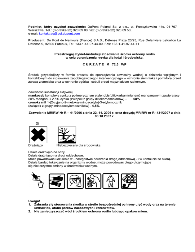 Podmiot, który uzyskał zezwolenie: DuPont Poland Sp. z o.o., ul. Powązkowska 44c, 01-797 Warszawa, Tel.: (0-prefiks-22) 320 09 00, fax: (0-prefiks-22) 320 09 50, e-mail: [email protected] Producent: Du Pont de Nemours (France) S.A.S., Défense Plaza 23/25, Rue Delariviere Lefoullon La Défense 9, 92800 Puteaux, Tel: +33-1-41-97-44-00, Fax: +33-1-41-97-44-11 Przestrzegaj etykiet-instrukcji stosowania środka ochrony roślin w celu ograniczenia ryzyka dla ludzi i środowiska. C U R Z A T E M 72,5 WP Środek grzybobójczy w formie proszku do sporządzania zawiesiny wodnej o działaniu wgłębnym i kontaktowym do stosowania zapobiegawczego i interwencyjnego w ochronie ziemniaka i pomidora przed zarazą ziemniaka oraz w ochronie ogórka i cebuli przed mączniakiem rzekomym. Zawartość substancji aktywnej: mankozeb kompleks cynku z polimerycznym etylenobis(ditiokarbaminianem) manganawym zawierający 20% manganu i 2,5% cynku (związek z grupy ditiokarbaminianów) – 68% cymoksanil 1-(2-cyjano-2-metoksyiminoacetylo)-3-etylomocznik (związek z grupy iminoacetylomoczników) - 4,5%. Zezwolenie MRiRW Nr R – 41/2006 z dnia 22. 11. 2006 r. oraz decyzją MRiRW nr R- 431/2007 z dnia 08.10.2007 r. Drażniący Niebezpieczny dla środowiska Działa drażniąco na oczy. Działa drażniąco na drogi oddechowe. Może powodować uczulenie w - następstwie narażenia drogą oddechową - i w kontakcie ze skórą. Działa bardzo toksycznie na organizmy wodne, może powodować długo utrzymujące się niekorzystne zmiany w środowisku wodnym. Uwaga! 1. Zabrania się stosowania środka w strefie bezpośredniej ochrony ujęć wody oraz na terenie uzdrowisk, otulin parków narodowych i rezerwatów. 2. Nie zanieczyszczać wód środkiem ochrony roślin lub jego opakowaniem. 2 ZAKRES STOSOWANIA, TERMINY I DAWKI Rośliny rolnicze. ziemniak. -zaraza ziemniaka. Zalecana dawka: 2 kg/ha. Zalecana ilość wody: 200-400 l/ha. Zalecane opryskiwanie: drobnokropliste. Większą ilość wody stosować w uprawach zagęszczonych lub o silnie rozwiniętej naci ziemniaczanej. Pierwszy zabieg wykonywać zgodnie z sygnalizacją lub: • na odmianach wczesnych - w okresie zwierania się roślin w międzyrzędziach, • na odmianach późnych - z chwilą wystąpienia pierwszych objawów choroby w danym rejonie na odmianach wczesnych. Po wykonaniu pierwszego zabiegu środkiem o działaniu systemicznym lub środkiem Curzate M 72,5 WP, następne zabiegi wykonywać w miarę potrzeby co 7-14 dni. W warunkach większego zagrożenia patogenem oraz na odmianach podatnych na zarazę ziemniaka, zabieg wykonać co 7 – 10 dni, Rośliny warzywne. pomidor (w gruncie). -zaraza ziemniaka. Zalecana dawka: 2,4 kg/ha. Zalecana ilość wody: 600-700 l/ha. Pierwszy zabieg wykonywać z chwilą pojawienia się choroby na ziemniakach, następne jak w uprawie ziemniaka. pomidor (pod osłonami). -zaraza ziemniaka. Zalecane stężenie: 0,3% (300 g środka w 100 litrach wody). Zalecana ilość cieczy użytkowej: 1000-1500 l/ha. Ilość wody dostosować do wysokości i zagęszczenia roślin. Przy produkcji pomidorów jesienią opryskiwać rośliny co 7-10 dni. ogórek (w gruncie). -mączniak rzekomy dyniowatych. Zalecane dawki: 2,5 kg/ha. Wysokość dawki dostosować do wielkości roślin i nasilenia choroby. Zalecana ilość wody: 700- 800 l/ha. Ilość wody dostosować do wielkości roślin i ich zagęszczenia. Pierwszy zabieg wykonywać zapobiegawczo zgodnie z sygnalizacją lub po wystąpieniu pierwszych objawów choroby na plantacjach w danym rejonie. Środek stosować 2 – 3 razy w sezonie wegetacyjnym co 7 dni , przemiennie z fungicydami należącymi do innych grup chemicznych. 3 ogórek (pod osłonami) - mączniak rzekomy dyniowatych Zalecane stężenie: 0,3% (300g środka w 100 litrach wody). Zalecana ilość cieczy użytkowej 120 l/1000 m2 Środek stosować 1 – 2 razy w sezonie wegetacyjnym co 7 dni, przemiennie z fungicydami należącymi do innych grup chemicznych. cebula -mączniak rzekomy cebuli. Zalecana dawka: 2-2,5 kg/ha. Wysokość dawki dostosować do wielkości roślin i stanu zagrożenia chorobą. Zalecana ilość wody: 700 l/ha. Pierwszy zabieg wykonywać zapobiegawczo zgodnie z sygnalizacją lub po wystąpieniu pierwszych objawów choroby na cebuli nasiennej, uprawianej z dymki lub siewu ozimego w danym rejonie. Środek stosować 2 – 3 razy w sezonie wegetacyjnym co 7 – 10 dni , przemiennie z fungicydami należącymi do innych grup chemicznych. Należy także zapewnić jak najlepsze pokrycie całych roślin cieczą użytkową stosując np.: rozpylacze z podwójnymi otworami opryskowymi, systemy podwójnych rozpylaczy, opryskiwacze z pomocniczym strumieniem powietrza. UWAGI: 1. Warunkiem skuteczności zabiegu jest dokładne pokrycie roślin cieczą użytkową. 2. Wyższe z zalecanych dawek stosować w uprawach silnie wyrośniętych lub większego zagrożenia patogenem. OKRES KARENCJI (okres od dnia ostatniego zabiegu do dnia zbioru i przeznaczenia do konsumpcji): ziemniak - 11 dni, pomidor - 4 dni, ogórek - 3 dni, cebula - 14 dni. OKRES PREWENCJI DLA PSZCZÓŁ, LUDZI I ZWIERZĄT (okres zapobiegający zatruciu): NIE DOTYCZY. SPORZĄDZANIE CIECZY UŻYTKOWEJ Przed przystąpieniem do sporządzania cieczy użytkowej dokładnie ustalić potrzebną jej ilość. Odważoną ilość środka wymieszać w osobnym naczyniu z małą ilością wody, następnie wlać przez sito do zbiornika opryskiwacza napełnionego częściowo wodą (z włączonym mieszadłem) i uzupełnić wodą do potrzebnej ilości. Po wlaniu cieczy użytkowej do zbiornika opryskiwacza nie wyposażonego w mieszadło hydrauliczne ciecz mechaniczne wymieszać. Opryskiwać z włączonym mieszadłem. 4 Opróżnione opakowania po środku przepłukać trzykrotnie wodą, a popłuczyny wlać do zbiornika opryskiwacza z cieczą użytkową. Po pracy aparaturę dokładnie wymyć. PRZECHOWYWANIE Przechowywać z dala od źródeł ciepła. Przechowywać wyłącznie w oryginalnym opakowan