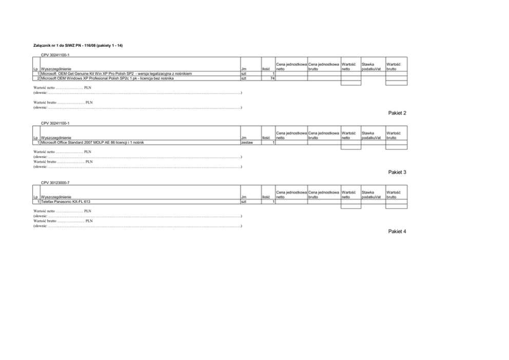 Załącznik nr 1 do SIWZ PN - 116/08 (pakiety 1 - 14) CPV 30241100-1 Lp Wyszczególnienie 1 Microsoft OEM Get Genuine Kit Win XP Pro Polish SP2 - wersja legalizacyjna z nośnikiem 2 Microsoft OEM Windows XP Profesional Polish SP2c 1 pk - licencja bez nośnika Jm szt szt Cena jednostkowa Cena jednostkowa Wartość netto brutto netto Ilość Stawka podatkuVat Wartość brutto 1 74 Wartość netto …………………. PLN (słownie: ………………………………………………………………………………………………………………………………………) Wartość brutto …………………. PLN (słownie: ………………………………………………………………………………………………………………………………………) Pakiet 2 CPV 30241100-1 Lp Wyszczególnienie 1 Microsoft Office Standard 2007 MOLP AE 86 licencji i 1 nośnik Jm zestaw Cena jednostkowa Cena jednostkowa Wartość netto brutto netto Ilość Stawka podatkuVat Wartość brutto 1 Wartość netto …………………. PLN (słownie: ………………………………………………………………………………………………………………………………………) Wartość brutto …………………. PLN (słownie: ………………………………………………………………………………………………………………………………………) Pakiet 3 CPV 30123000-7 Lp Wyszczególnienie 1 Telefax Panasonic KX-FL 613 Jm szt Cena jednostkowa Cena jednostkowa Wartość netto brutto netto Ilość Stawka podatkuVat Wartość brutto 1 Wartość netto …………………. PLN (słownie: ………………………………………………………………………………………………………………………………………) Wartość brutto …………………. PLN (słownie: ………………………………………………………………………………………………………………………………………) Pakiet 4 CPV 30123000-7 Lp Wyszczególnienie Kserokopiarka XEROX Copy WorkCentre C118 z automatycznym podajnikiem dokumentów oraz tonerem na 11 000 1 kopii Jm Cena jednostkowa Cena jednostkowa Wartość netto brutto netto Ilość szt Stawka podatkuVat Wartość brutto 1 Wartość netto …………………. PLN (słownie: ………………………………………………………………………………………………………………………………………) Wartość brutto …………………. PLN (słownie: ………………………………………………………………………………………………………………………………………) Pakiet 5 CPV 30123000-7 Lp Wyszczególnienie 1 Kserokopiarka kolorowa Cannon iRC4080i z kartą sieciową i duplex standard 2 Podajnik DADF z modułem skanera kolorowego Finisher X1 zewnętrzny (ilość półek 3, taca A-250 ark; taca B - 1 - 300 arkuszy; taca C2 450 arkuszy; sortuje, grupuje, 3 przesówa, zszywa - zszywacz wielopozycyjny- róg, podwójnie zszywa 50 arkuszy A4 lub 30 arkuszy A3 4 Podstawa z kasetami Z1 (2x 550 arkuszy) Jm szt szt Cena jednostkowa Cena jednostkowa Wartość netto brutto netto Ilość Stawka podatkuVat Wartość brutto 1 2 szt szt 3 4 Wartość netto …………………. PLN (słownie: ………………………………………………………………………………………………………………………………………) Wartość brutto …………………. PLN (słownie: ………………………………………………………………………………………………………………………………………) Pakiet 6 CPV 302116110-0 Lp Wyszczególnienie 1 Skaner HP ScanJet G4050 (L1957A) Jm szt Wartość netto …………………. PLN (słownie: ………………………………………………………………………………………………………………………………………) Wartość brutto …………………. PLN (słownie: ………………………………………………………………………………………………………………………………………) Cena jednostkowa Cena jednostkowa Wartość netto brutto netto Ilość 1 Stawka podatkuVat Wartość brutto Pakiet 7 CPV 30217200-5 Lp Wyszczególnienie Jm Cena jednostkowa Cena jednostkowa Wartość netto brutto netto Ilość Rzutnik Multimedialny format natywny 4:3, zoom ręczny 1:1,2, jasność w trybie normalnym minimum 3000 ANSI, w trybie ekonomicznym minimum 2700 ANSI, kontrast minimum 2000:1, rozdzielczość natywna minimum XGA (1024x 768), głośność w trybie normalnym nie więcej niż 34 dB w trybie ekonomicznym nie więcej niż 31Db, waga nie więcej niż 1 3 kg, wejścia D-Sub (VGA), S-Video (mini DIN), Composite Video (RCA), Audio (Mini Jack -3,5 mm) np Acer PD528 szt Stawka podatkuVat Wartość brutto 1 Wartość netto …………………. PLN (słownie: ………………………………………………………………………………………………………………………………………) Wartość brutto …………………. PLN (słownie: ………………………………………………………………………………………………………………………………………) Pakiet 8 CPV 30213300-8 Lp Wyszczególnienie 1 Notebook HP dv6860 T8100 15.4"BV 3GB 320GB BT NV8400 FPR VHP lub równoważny Jm szt Wartość netto …………………. PLN (słownie: ………………………………………………………………………………………………………………………………………) Wartość brutto …………………. PLN (słownie: ………………………………………………………………………………………………………………………………………) Cena jednostkowa Cena jednostkowa Wartość netto brutto