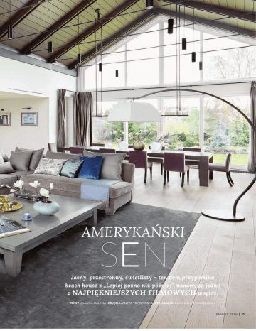 AMERYKAŃSKI SEN Jasny, przestronny, świetlisty – ten dom przypomina beach house z „Lepiej późno niż później”, uznany za jedno z NAJPIĘKNIEJSZYCH FILMOWYCH wnętrz. TEKST: JOANNA HALENA ZDJĘCIA: ANETA TRYCZYŃSKA STYLIZACJA: ANNA OLGA CHMIELEWSKA MARZEC 2016 | 39 Stojących LAMP OD ARMANIEGO nie można było kupić w Polsce. Zamówiono je specjalnie na targach wnętrzarskich w Mediolanie. 40 | MARZEC 2016 Welurowe poduszki, złote dzbanek, świeca i taca – Tom Dixon (NAP), niebieska filiżanka z BB Home, szarobłękitny wazon z BoConcept, pled od Mint Grey. ➻ MARZEC 2016 | 41 Charakterystyczna zabawna lampa na kaczych nogach to Porta Romana, obok złota filiżanka z Rosenthala. 42 | MARZEC 2016 Miedziane garnki – Baumalu (NAP). Szkła w kuchni ze Scandinavian Living, rolety i zasłony uszył Decosystem. 46 | MARZEC 2016 MARZEC 2016 | 47 MEBLE W KUCHNI – projekt Pauliny Taff-Piotrowskiej – ze stolarni Dawidczyka. Do tego światowej klasy AGD firm Gaggenau i Liebherr. 48 | MARZEC 2016 Wielkanoc rodzinie Bożeny kojarzy się z MAGICZNYMI ZAPACHAMI. Ciast, pasztetów, pasty do podłogi. I z rodzinnymi spotkaniami. – Siedzimy długo przy stole, rozmawiamy, cieszymy się sobą. ➻ TEKST: JOANNA HALENA ZDJĘCIA: ANETA TRYCZYŃSKA STYLIZACJA: AGNIESZKA GŁOWACKA MARZEC 2016 | 55 Żyrandol – FRANCUSKĄ GRUSZKĘ – Bożena kupiła w Indigo Decor Meble & Dekoracje, tak jak krzesła, okrągłe stoliki, lustra, lampy. To jej ulubiona hinduska firma, w której można znaleźć różne skarby. 56 | MARZEC 2016 Poduszki z NAP i Chic Antique (futrzane), pudrowy ptaszek z Mint Grey, osłonki z Galerii Lawenda, filiżanka – BB Home. MARZEC 2016 | 57 58 | MARZEC 2016