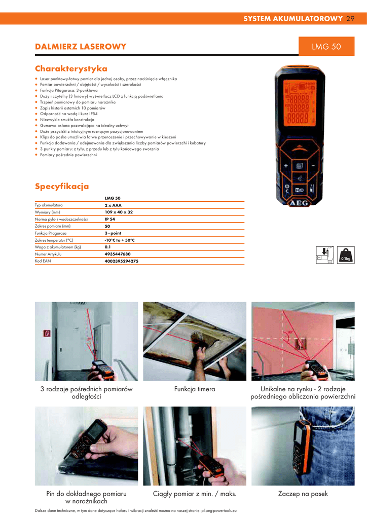 SYSTEM AKUMULATOROWY 29 DALMIERZ LASEROWY LMG 50 Charakterystyka zLaser punktowy-łatwy pomiar dla jednej osoby, przez naciśnięcie włącznika powierzchni / objętości / wysokości i szerokości zFunkcja Pitagorasa: 3-punktowa zDuży i czytelny (3 liniowy) wyświetlacz LCD z funkcją podświetlania zTrzpień pomiarowy do pomiaru narożnika zZapis historii ostatnich 10 pomiarów zOdporność na wodę i kurz IP54 zNiezwykle smukła konstrukcja zGumowa osłona pozwalająca na idealny uchwyt zDuże przyciski z intuicyjnym rosnącym pozycjonowaniem zKlips do paska umożliwia łatwe przenoszenie i przechowywanie w kieszeni zFunkcja dodawania / odejmowania dla zwiększania liczby pomiarów powierzchi i kubatury z3 punkty pomiaru: z tyłu, z przodu lub z tyłu końcowego sworznia zPomiary pośrednie powierzchni zPomiar Specyfikacja LMG 50 Typ akumulatora 2 x AAA Wymiary (mm) 109 x 40 x 32 Norma pyło- i wodoszczelności IP 54 Zakres pomiaru (mm) 50 Funkcja Pitagorasa 3 - point Zakres temperatur (°C) -10°C to + 50°C Waga z akumulatorem (kg) 0.1 Numer Artykułu 4935447680 Kod EAN 4002395294275 0.1kg 3 rodzaje pośrednich pomiarów odległości Funkcja timera Unikalne na rynku - 2 rodzaje pośredniego obliczania powierzchni Pin do dokładnego pomiaru w narożnikach Ciągły pomiar z min. / maks. Zaczep na pasek Dalsze dane techniczne, w tym dane dotyczące hałasu i wibracji znaleźć można na naszej stronie: pl.aeg-powertools.eu