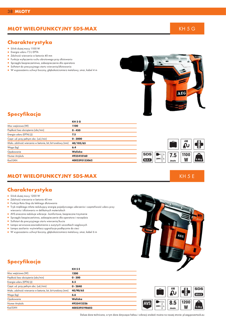 38 MŁOTY MŁOT WIELOFUNKCYJNY SDS-MAX KH 5 G Charakterystyka zSilnik dużej mocy 1100 W udaru 7.5 J EPTA zZdolność wiercenia w betonie 40 mm zFunkcja wyłączenia ruchu obrotowego przy dłutowaniu zSprzęgło bezpieczeństwa, zabezpieczenie dla operatora zSoftstart do precyzyjnego startu wiercenia/dłutowania zW wyposażeniu uchwyt boczny, głębokościomierz metalowy, smar, kabel 4 m zEnergia Specyfikacja KH 5 G Moc wejściowa (W) 1100 Prędkość bez obciążenia (obr/min) 0 - 450 Energia udaru (EPTA) (J) 7.5 Częst. ud. przy pełnym obc. (ud./min) 0 - 3000 Maks. zdolność wiercenia w betonie, bit, bit tunelowy (mm) 40/105/65 Waga (kg) 6.4 Opakowanie Walizka Numer Artykułu 4935418160 Kod EAN 4002395133062 MŁOT WIELOFUNKCYJNY SDS-MAX KH 5 E Charakterystyka zSilnik dużej mocy 1200 W wiercenia w betonie 40 mm zFunkcja Roto-Stop do lekkiego dłutowania zTryb miękkiego młota redukujący energię pojedynczego uderzenia i częstotliwość udaru przy wierceniu i dłutowaniu w delikatnych materiałach zAVS-znacznie redukuje wibracje - komfortowe, bezpieczne trzymanie zSprzęgło bezpieczeństwa, zabezpieczenie dla operatora i narzędzia zSoftstart do precyzyjnego startu wiercenia/kucia zLampa serwisowa-zawiadomienie o zużytych szczotkach węglowych zLampa zasilania -wyświetlacz sygnalizuje podłącznie do sieci zW wyposażeniu uchwyt boczny, głębokościomierz metalowy, smar, kabel 6 m zZdolność Specyfikacja KH 5 E Moc wejściowa (W) 1200 Prędkość bez obciążenia (obr/min) 0 - 300 Energia udaru (EPTA) (J) 8.5 Częst. ud. przy pełnym obc. (ud./min) 0 - 2840 Maks. zdolność wiercenia w betonie, bit, bit tunelowy (mm) 40/90/65 Waga (kg) 6.6 Opakowanie Walizka Numer Artykułu 4935412326 Kod EAN 4002395198603 Dalsze dane techniczne, w tym dane dotyczące hałasu i wibracji znaleźć można na naszej stronie: pl.aeg-powertools.eu MŁOTY 39 MŁOT DO KUCIA SDS-MAX MH 5 G Charakterystyka zNajlepszy stosunek mocy do masy w swojej klasie trybowy młot do kucia SDS-Max zWielopołożeniowa funkcja dłuta w 12 różnych pozycjach, aby zoptymalizować kąt pracy zWytrzymała obudowa magnezowa dla ciężkich zastosowań, dobrego ułożyskowania elementów przekładni i lepszego chłodzenia zNiski poziom drgań– konstrukcja obniżająca wibracje pozwala na nieprzerwaną pracę w ciągu dnia zPrzednia miękka rękojeść zW wyposażeniu uchwyt boczny, kabel 4 m z2 Specyfikacja MH 5G Moc wejściowa (W) 1100 Energia udaru (EPTA) (J) 7.5 Częst. ud. przy pełnym obc. (ud./min) 0 - 3000 Poziom wibracji przy dłutowaniu (m/s² ) 16.7 Waga (kg) 5.9 Opakowanie Walizka Numer Artykułu 4935443170 Kod EAN 4002395135462 MŁOT DO KUCIA SDS-MAX Charakterystyka zSilnik dużej mocy 1200 W udaru 8,5 J do łatwego kucia zTryb miękkiego młota redukujący energię pojedyńczego uderzenia i częstotliwość udaru w przypadku kucia w delikatnych materiałach zAVS-znacznie redukuje wibracje - komfortowe, bezpieczne trzymanie zSoftstart do precyzyjnego startu kucia zLampa serwisowa-zawiadomienie o zużytych szczotkach węglowych zLampa zasilania-wyświetlacz sygnalizuje podłącznie do sieci zW wyposażeniu chwyt w kształcie litery D, smar, kabel 6 m zEnergia Specyfikacja MH 5 E Moc wejściowa (W) 1200 Energia udaru (EPTA) (J) 8.5 Częst. ud. przy pełnym obc. (ud./min) 0 - 2840 Waga (kg) 6.2 Opakowanie Walizka Numer Artykułu 4935412361 Kod EAN 4002395198795 Dalsze dane techniczne, w tym dane dotyczące hałasu i wibracji znaleźć można na naszej stronie: pl.aeg-powertools.eu MH 5 E 40 MŁOTY MŁOT WIELOFUNKCYJNY SDS-MAX PN 11 E Charakterystyka zSilnik dużej mocy 1700 W udaru 20 J do ciężkich zastosowań zZdolność wiercenia w betonie 50 mm zElektronika do regulacji prędkości zOgraniczenie prędkości bez obciążenia zAVS-znacznie redukuje wibracje - komfortowe, bezpieczne trzymanie zSprzęgło bezpieczeństwa, zabezpieczenie dla operatora i narzędzia zSoftstart do precyzyjnego startu wiercenia/kucia zLampa serwisowa-zawiadomienie o zużytych szczotkach węglowych zAutomatyczne odcięcie szczotek węglowych zUchwyt Soft-grip zapewnia komfortową obsługę zW wyposażeniu chwyt w kształcie litery D, smar, kabel 6 m zEnergia Specyfikacja PN 11 E Moc wejściowa (W) 1700 Energia udaru (EPTA) (J) 20 Częst. ud. przy pełnym obc. (ud./min) 975 - 1950 Maks. zdolność wiercenia w betonie, bit, bit tunelowy (mm) 50/150/80 Waga (kg) 11.8 Opakowanie Walizka Numer Artykułu 4935412440 Kod EAN 4002395198931 DUŻY MŁOT KUJĄCY SDS-MAX PM 10 E Charakterystyka zSilnik dużej mocy 1600 W udaru 20 J do ciężkich zastosowań zElektronika do regulacji prędkości zOgraniczenie prędkości bez obciążenia zAVS-znacznie redukuje wibracje - komfortowe, bezpieczne trzymanie zSoftstart do precyzyjnego startu kucia zLampa serwisowa-zawiadomienie o zużytych szczotkach węglowych zAutomatyczne odcięcie szczotek węglowych zUchwyt Soft-grip zapewnia komfortową obsługę zW wzposażeniu chwyt w kształcie litery D, smar, kabel 6 m zEnergia Specyfikacja PM 10 E Moc wejściowa (W) 1600 Energia udaru (EPTA) (J) 20 Częst. ud. przy pełnym obc. (ud./min) 975 - 1950 Waga (kg) 11.0 Opakowanie Walizka Numer Artykułu 4935412418 Kod EAN 4002395198832 Dalsze dane techniczne, w tym dane dotyczące hałasu i wibracji znaleźć można na naszej stronie: pl.aeg-powertools.eu