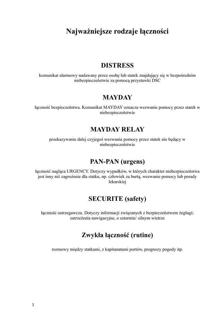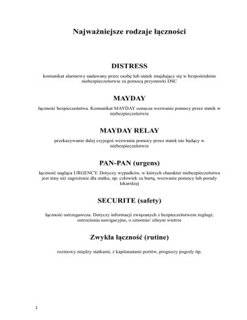Najważniejsze rodzaje łączności DISTRESS komunikat alarmowy nadawany przez osobę lub statek znajdujący się w bezpośrednim niebezpieczeństwie za pomocą przystawki DSC MAYDAY łączność bezpieczeństwa. Komunikat MAYDAY oznacza wezwanie pomocy przez statek w niebezpieczeństwie MAYDAY RELAY przekazywanie dalej czyjegoś wezwania pomocy przez statek nie będący w niebezpieczeństwie PAN-PAN (urgens) łączność nagląca URGENCY. Dotyczy wypadków, w których charakter niebezpieczeństwa jest inny niż zagrożenie dla statku, np. człowiek za burtą, wezwanie pomocy lub porady lekarskiej SECURITE (safety) łączność ostrzegawcza. Dotyczy informacji związanych z bezpieczeństwem żeglugi; ostrzeżenia nawigacyjne, o sztormie/ silnym wietrze Zwykła łączność (rutine) rozmowy między statkami, z kapitanatami portów, prognozy pogody itp. 1 Zasady użycia radiostacji Należy pamiętać: niepotrzebna transmisja jest zabroniona, przekazywanie treści nieprzyzwoitych i wulgarnych jest zabronione, przerywanie innej korespondencji jest dozwolone jedynie w przypadkach łączności o wyższym priorytecie, transmisje radiowe objęte są prawnie tajemnicą i wszystkie korespondencje powinny być traktowane jako poufne, chyba że z natury są ogólne, jak np. prognozy pogody, wezwania pomocy, akcje poszukiwania i ratowania... nie wolno przekazywać informacji fałszywych lub wprowadzających w błąd, nie wolno dokonywać wywołań anonimowych - bez identyfikacji. Nadając przez radio powinieneś: 2 mówić wyraźnie, aby twoje wypowiedzi nie mogły być pomylone z innymi, unikać podnoszenia głosu i krzyczeć, ponieważ może to spowodować zakłócenia lub zniekształcenia głosu, używać standardowych zwrotów i słownictwa w komunikacji, mówić wolno, ale całymi zdaniami. DISTRESS komunikat alarmowy nadawany za pomocą przystawki DSC przez osobę lub statek znajdujący się w bezpośrednim niebezpieczeństwie Komunikat alarmowy DISTRESS nadawany jest radiotelefonem VHF za pomocą przystawki DSC na CH 70 przez osobę lub statek znajdujący się w bezpośrednim niebezpieczeństwie i potrzebujący natychmiastowej pomocy. W komunikacie alarmowym są zawarte następujące informacje: Numer MMSI* Pozycja (otrzymana z GPS lub wprowadzona ręcznie przez operatora) Czas UTC określenia pozycji Rodzaj zagrożenia Pozycja statku i czas jej określenia są niezbędnymi informacjami do przeprowadzenia skutecznej akcji alarmowej. Dlatego też, jeżeli przystawka DSC nie jest podłączona do GPS, pozycja powinna być wprowadzana ręcznie przez operatora. Zalecany maksymalny odstęp czasowy pomiędzy kolejnymi uaktualnieniami pozycji wynosi 4 godziny. Komunikat alarmowy jest nadawany do wszystkich stacji (ALL STATIONS). Wysłanie komunikatu alarmowego za pomocą przystawki DSC 1. Ustaw moc nadawania na high (25W) 2. Przesuń klapkę DISTRESS 3. Wciśnij klawisz DISTRESS 4. Przed wysłaniem komunikatu alarmowego należy upewnić się, czy wprowadzona jest aktualna pozycja i czas UTC. Jeżeli tak nie jest, należy ją wprowadzić ręcznie: a. Wciśnij klawisz Menu b. Wciśnij klawisz Posn c. Wprowadź szerokość i długość geograficzną używając klawiatury numerycznej. d. Wprowadź znak współrzędnej (N,S,E,W) za pomocą klawisza funkcyjnego e. Wciśnij klawisz E f. Wprowadź czas UTC (w formacie 24-godzinnym) używając klawiatury numerycznej. g. Wciśnij klawisz E 5. Wciśnij dolny klawisz funkcyjny znajdujący się z prawej strony wyświetlacza, aby wybrać rodzaj zagrożenia. 6. Aby wysłać komunikat wciśnij i przytrzymaj przez 5 sekund klawisz DISTRESS. Czas pozostały do transmisji będzie wstecznie odliczany. Jeżeli w tym czasie zwolnisz przycisk, komunikat nie zostanie nadany. Komunikat alarmowy nieokreślonego rodzaju (Undesignated Distress) Wysłanie komunikatu następuje poprzez wciśniecie i przytrzymanie przez 5 sekund przycisku znajdującego sie pod klapką DISTRESS. 3 Tej metody wysłania alarmu używamy tylko wtedy, gdy nie mamy czasu na edycje wiadomości ponieważ: pozycja i czas jej określenia nie zostały sprawdzone przez wysłaniem, nie został określony rodzaj zagrożenia (domyślnie ustawiony jest nieokreślony "Undesignated"). Jeżeli statek znajduje się w obszarze A1, alarm zostanie potwierdzony na DSC przez stację brzegową (CRS). Stacja ta będzie koordynatorem akcji ratunkowej i może zażądać asysty innych statków znajdujących się w pobliżu. Po wysłaniu komunikatu alarmowego na DSC (wezwanie w niebezpieczeństwie), stacja potrzebująca pomocy rozpocznie korespondencję za pomocą radiotelefonu na CH 16 nadając najpierw wezwanie, a następnie zawiadomienie w niebezpieczeństwie. Za pomocą przystawki DSC mamy możliwość edycji wywołania alarmowego. Możemy wybrać rodzaj zagrożenia oraz wprowadzić ręcznie pozycję i czas UTC jej określenia (lub sprawdzić czy pozycja z GPS jest aktualna). W przystawce zaprogramowane są następujące rodzaje zagrożenia: Fire/Explosion Flooding Collision Grounding Listing/Capsizing Sinking Disabled & Adrift Abandoning Man overboard Undesignated Pożar/Eksplozja Nabieranie wody Kolizja, zderzenie Wejście na mieliznę Przechył/ Wywrotka Zatonięcie Brak napędu i Dryfowanie Opuszczenie statku Człowiek za burtą Nieokreślony Stacja brzegowa po odebraniu alarmu na DSC nadaje potwierdzenie na DSC. Jeżeli alarm nie został potwierdzony (statek poza obszarem A1) przystawka DSC będzie automatycznie powtarzać wywołania w odstępach 4 - 5 minut. Po odbiorze potwierdzenie alarmu na DSC, przystawka zostaje "zresetowana" i nie wyśle kolejnych alarmów w sposób automatyczny. W komunikacie potwierdzającym odbiór alarmu na DSC znajdują się następujące informacje: numer MMSI stacji brzegowej (CRS), cały komunikat alarmowy nadany przez statek. UWAGA: nadawanie fałszywych sygnałów wzywania pomocy jest zabronione i prawnie karane . *MMSI - numer identyfikacyjny stosowany w morskiej służbie ruchomej (Mar