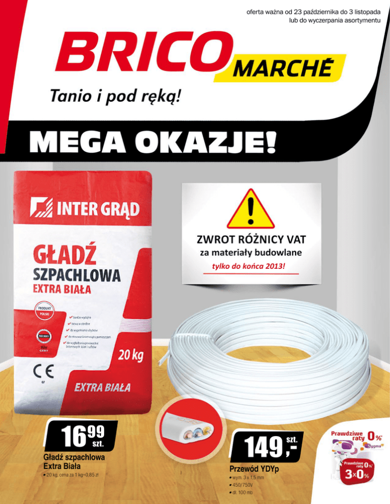 oferta ważna od 23 października do 3 listopada lub do wyczerpania asortymentu tylko do końca 2013! 16 99 szt. Gładź szpachlowa Extra Biała 20 kg, cena za 1 kg=0,85 zł 149 ,- szt. Przewód YDYp wym. 3 x 1,5 mm 450/750V dł. 100 mb Lampy WISZĄCE 109 ,- szt. Lampa podłogowa 60W, E27, wys. 155 cm abażur kwadratowy lub owalny, ecru wykończenie: metalowe malowane proszkowo, satynowe lub patyna 9469 szt. 1. Lampa Wenecja możliwość regulacji wysokości 60W, E27, wys. max 100 cm abażur z organzy z wiszącymi akrylowymi kryształkami, różne kolory 149 ,- 199 ,- szt. 2. Żyrandol Napoli 3 x 40W, E14, IP 20 wykończenie: chrom szt. 3. Lampa Lucena 4 x 40W, E14, IP 20 wykończenie: chrom Seria lamp SYCYLIA Seria lamp ALASKA od od 2189 od szt. szt. Seria gniazd i włączników Akcent beż dostępne różne rodzaje odpowiednik żarówki zwykłej: 55W Seria spotów LENA od od 5 49 szt. Świetlówka kompaktowa energooszczędna 2 13W, E27, FS-T3, 2700 K żywotność: 6000 h *dostępne również inne moce i rodzaje Seria lamp KŁOS 3599 kpl. 28W, G9, IP 20 klosz z kryształkami, opleciony wykończenie: metalowe, kolor: chrom 1. Kinkiet - 35,99/kpl. 2. Listwa, 2 x 28W - 74,99/kpl. 3. Listwa, 3 x 28W - 109/kpl. szt. 60W, E27 klosz szklany biały wykończenie: brązowo-złote lub brązowo-miedziane 1. Kinkiet - 26,99/szt. 2. Żyrandol, 3 x 60W - 69,99/szt. 60W, E27 klosz szklany biały z wytłaczanym wzorem 1. Kinkiet - 21,89/szt. 2. Plafon, śr. 30 cm - 29,99/szt. 3. Lampa wisząca - 39,99/szt. 699 2699 źródło światła w komplecie od 3999 szt. 60W, E27 klosz szklany biały lub ambra wykończenie: czarno-złote lub brązowo-złote 1. Kinkiet - 39,99/szt. 2. Żyrandol, 3 x 60W - 109/szt. 3. Żyrandol, 5 x 60W - 159/szt. 109 ,- szt. Promiennik gazowy moc: 4,2kW do ogrzewania miejsc, w których do osiągnięcia wymaganej temperatury niezbędna jest duża moc grzewcza uchwyt do mocowania na butli, zawór termoelektryczny odcinający dopływ gazu 4699 szt. Konwektor reduktor i wąż w komplecie moc: 650/850/1500W wbudowany regulowany termostat zabezpieczenie przed przegrzaniem wypełnienie: pianka poliuretanowa 1999 od kpl. Klamka wzory: Presto-R, Romana kolor: brąz grafiatto, chrom/nikiel różne rodzaje prawa/lewa 549 ,- szyba ornament kpl. 188 ,- szt. Drzwi zewnętrzne stalowe Polska wym. 950 x 2050 mm, P/L, kolor: złoty dąb skrzydło, ościeżnica, wizjer, klamka z szyldem, rozeta górna, komplet wkładek Skrzydło drzwiowe Vox kolor: dąb wypełnienie: plaster miodu bez klamki, P/L pełne, szer. 80 cm pokojowe, szer. 80 cm łazienkowe, szer. 70 cm 3999 szt. Płyta Durelis Popular klasa: P5 wym. 2500 x 1250 x 12 mm *wym. 2500 x 1250 x 18 mm - 59,99/szt. PANELE PODŁOGOWE 14 89 m gatunek 1 2 Gres szkliwiony beż mrozoodporny 10 lat gwarancji 1799 m2 Dąb Złoty Deska GO/ON! AC3, HDF 7 mm struktura porów drewna rustykalnego wym. 29,7 x 29,7 x 0,72 cm 10 lat gwarancji 2299 m2 Dąb Kanadyjski AC3, HDF 8 mm głęboka struktura drewna 10 lat gwarancji 21 99 m2 Gres szkliwiony Deserto Arancio wym. 33,3 x 33,3 x 0,7 cm kl. antypoślizgowa: R10 IV kl. ścieralności m2 Jesion Kaukaski gatunek 1 mrozoodporny 2499 AC3, HDF 7 mm wierna struktura drewna z połyskiem 15 lat gwarancji 2797 m2 Dąb Husky AC4, HDF 8 mm struktura satynowego efektu 3 2499 wolnoopadająca szt. Deska sedesowa Lilia wzory: muszla, plaża produkt polski produkt polski produkt polski 7 lat gwarancji 7 lat gwarancji 428 ,- kpl. 6999 239 ,- 277 ,- kpl. szt. Kompakt WC Format z twardą deską PP system spłukiwania: 3/6 L odpływ poziomy Deska sedesowa Snail biała Zestaw podtynkowy Slim do zabudowy kpl. w zestawie: miska wisząca WC z miękką deską sedesową, przycisk biały, stelaż system spłukiwania: 3/6 L odpływ poziomy Kompakt z deską wolnoopadającą PP system spłukiwania: 3/6 L odpływ poziomy produkt polski 6999 szt. Lustro kryształowe z półką 6999 z powłoką teflonową wym. 53 x 63 cm szt. *ściereczka z mikrofibry GRATIS Umywalka Market szer. 50 cm, z otworem bez baterii produkt polski od Meble łazienkowe GO/ON! fronty lakierowane 8999 szt. m2 Płytka ścienna Vltawa gatunek 1 wym. 20 x 25 cm kolory: seledyn jasny i ciemny *płytka dekor, różne wzory - 7,39/szt. *listwa dekor, wym. 2,5 x 20 cm i 5 x 20 cm - 5,69/szt. *gres szkliwiony, wym. 33,3 x 33,3 x 0,72 cm - 27,99/m2 7999 szt. Meble łazienkowe Wenge kolor: biały 1. Szafka wisząca, wym. 615 x 300 x 216 mm - 89,99/szt. 2. Szafka z umywalką, wym. 815 x 472 x 302 mm, umywalka, szer. 50 cm, bez baterii - 125/kpl. 3. Komoda, wym. 820 x 300 x 300 mm - 149/szt. 4. Słupek, wym. 1705 x 290 x 300 mm - 164/szt. 1999 4 od 1. Lustro, wym. 550 x 19 x 700 mm - 79,99/szt. 2. Szafka z umywalką, wym. 520 x 302 x 815 mm, umywalka ceramiczna, szer. 55 cm, bez baterii - 189/kpl. 3. Słupek wysoki, wym. 1700 x 290 x 300 mm - 199/szt. 2999 gatunek 1 m2 Płytka ścienna Nina połysk wym. 25 x 36 cm kolory: beż, brąz *płytka dekor Kwiat, Fala - 14,99/szt. *listwa dekor, wym. 7,4 x 36 cm - 6,99/szt. *mozaika, wym. 30 x 30 cm - 19,99/szt. *gres szkliwiony, wym. 33,3 x 33,3 x 0,8 cm - 31,99/m2 gres mrozoodporny bateria natryskowa w komplecie szkło mrożone 349 ,- kpl. produkt polski 1099,- wym. 140 x 70 cm, nogi w komplecie *150 x 70 cm - 359/kpl. 89 6 dysz wodnych Kabina prysznicowa Tifany z hydromasażem Kabina prysznicowa Saturn deszczownica wym. 80 x 80 x 195 cm, niski brodzik drzwi szklane mrożone, wykończenie satynowe *wym. 90 x 90 x 195 cm - 449/kpl. wym. 90 x 90 x 218 cm, niski brodzik profil aluminiowy satynowy, drzwi szklane hartowane, ścianki tylne szklane czarne, gr. 4 mm bateria prysznicowa z zestawem i słuchawką 3-funkcyjną, półka, radio, wentylator, oświetlenie, elektroniczny panel sterujący Wanna akrylowa Supero Seria baterii 439 ,- kpl. kpl. VIGO głowica ceramiczna: 40 mm wykończenie: chrom 8 lat gwarancji 94 99 szt. Zlewozmywakowa z ruchomą wylewką podwyższona wytrzymałość na rozciąganie 99 szt. Umywalkowa z odcięciem odpływu 189